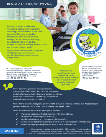 RENTA Z OPIEKĄ MEDYCZNĄ Renta z opieką medyczną to ubezpieczenie na wypadek trwałego inwalidztwa na skutek nieszczęśliwego wypadku (minimum 50%) oraz pomoc medyczna w razie poważnego, nieszczęśliwego wypadku, w tym badania i zabiegi świadczone na terenie całego kraju. © PNTS Pakiet Renta z opieką medyczną to ubezpieczenie dodatkowe, które pomoże Tobie i Twoim bliskim w trudnej sytuacji życiowej. nic z en ow pi e W razie wystąpienia zdarzenia ubezpieczeniowego z zakresu Assistance prosimy o kontakt telefoniczny z Centrum Operacyjnym Inter Partner Assistance czynnym całą dobę, 365 dni w roku, tel. +48 22 575 94 13. e Ube z cz Usługi medyczne dostępne są w ponad 700 placówkach medycznych, w 250 miejscowościach na terenie całego kraju. ie Pra c Infolinia MetLife czynna jest od poniedziałku do środy w godz. 9.00-17.00, od czwartku do piątku w godz. 8.00-16.00 pod numerem +48 22 523 50 70. Pakiet dodatkowy Renta z opieką medyczną dostępny jest dla każdego, kto korzysta z programu MetLife dla Pracowników. Dostępny jest bez weryfikacji medycznej stanu zdrowia. Wystarczy, że wypełnisz deklarację przystąpienia do pakietu. Pakiet Renta z opieką medyczną to do 420 000 zł łącznej wypłaty w Wariancie Rozszerzonym (jednorazowo 150 000 zł oraz 1 500 zł miesięcznie przez 15 lat). Pakiet dodatkowy Renta z opieką medyczną zapewni Ci: finansowe wsparcie, gdy ulegniesz min. 50% inwalidztwu, uzupełnienie dochodu przez wiele lat, wysokie świadczenia przy relatywnie niskiej składce, szeroki zakres dodatkowej pomocy medycznej w trakcie leczenia i rehabilitacji, dziedziczenie przyznanego świadczenia przez spadkobierców. Usługa Assistance działa na terenie Polski, 24 h na dobę, 7 dni w tygodniu. Usługi świadczone są dzięki współpracy MetLife z Inter Partner Assistance S.A. Oddział w Polsce, który od 20 lat zapewnia usługi Assistance, obejmując ochroną 5 milionów Polaków. Pakiet Renta z opieką medyczną dostępny jest w 3 wariantach: Świadczenie ubezpieczeniowe MetLife Podstawowy Średni Rozszerzony Świadczenie jednorazowe 50 000 zł 100 000 zł 150 000 zł Świadczenie miesięczne 500 zł 1 000 zł 1 500 zł Okres wypłacania świadczenia miesięcznego 5 lat 10 lat 15 lat Łącznie 80 000 zł 220 000 zł 420 000 zł Opieka Opieka medyczna medyczna –– w w ramach ramach usługi usługi świadczonej świadczonej przez przez Inter Inter Partner Partner Assistance Assistance Pomoc medyczna, lekarze 10 specjalizacji TAK TAK TAK USG, rehabilitacja — TAK TAK Tomografia komputerowa, rezonans magnetyczny — — TAK Składka 8 zł 19 zł 35 zł Opieka obejmuje konsultacje lekarzy 10 specjalizacji: chirurga, okulisty, otolaryngologa, ortopedy, kardiologa, neurologa, pulmonologa, neurochirurga, psychologa, rehabilitanta. Szczegółowe warunki dotyczące zakresu ochrony, w tym wyłączeń i ograniczeń odpowiedzialności ubezpieczycieli, dostępne są w OWU MetLife TUnŻiR S.A. i w WU Inter Partner Assistance S.A. Oddział w Polsce. Pracownik może je otrzymać w dziale kadr/zasobów ludzkich oraz na stronie internetowej www.metlife.pl. Jak ubiegać się o wypłatę świadczenia z tytułu trwałego inwalidztwa NW? Informacje o potrzebnych dokumentach oraz druki roszczeniowe dostępne są na stronie www.metlife.pl, w zakładce: Oferta dla Biznesu/Obsługa Klienta/Roszczenia – grupowe ubezpieczenia pracownicze (bezpośrednio pod linkiem: https://www.metlife.pl/pl/business/obsługa‐klienta/zgłoś‐roszczenie/). Roszczenia o wypłatę świadczenia można zgłaszać w poniższy sposób: e-roszczenie on-line – przez portal e-roszczenie. Zgłoszenie roszczenia on-line potwierdzone zostanie wygenerowaniem formularza – wniosku o wypłatę świadczenia – w formacie PDF. Wypełniony i własnoręcznie podpisany formularz wraz z wymaganymi dokumentami, które nie zostały dołączone do zgłoszenia on-line, powinien być przesłany do Departamentu Roszczeń na adres [email protected]. W temacie wiadomości prosimy wpisać nadany sprawie numer roszczenia. Pocztą elektroniczną – [email protected], załączając komplet wymaganej dokumentacji. Telefonicznie za pośrednictwem Telefonicznego Centrum Informacji – +48 22 523 50 70. Korespondencyjnie na adres – Departament Roszczeń MetLife TUnŻiR S.A., ul. Przemysłowa 26, 00-450 Warszawa, z dopiskiem „Roszczenia z polisy grupowej-pracowniczej”. Osobiście – odwiedzając biuro główne MetLife TUnŻiR S.A., ul. Przemysłowa 26 w Warszawie. Inter Partner Assistance S.A. Oddział w Polsce, ul. Chłodna 51, 00-867 Warszawa, zarejestrowana w rejestrze przedsiębiorców prowadzonym przez Sąd Rejonowy dla m.st. Warszawy, XII Wydział Gospodarczy Krajowego Rejestru Sądowego pod numerem KRS 0000320749, o numerze NIP 108-00-06-955 PA419-A16 MetLife TUnŻiR S.A. jest spółką z grupy MetLife, Inc. MetLife Towarzystwo Ubezpieczeń na Życie i Reasekuracji Spółka Akcyjna, ul. Przemysłowa 26, 00-450 Warszawa, zarejestrowane przez Sąd Rejonowy dla m.st. Warszawy, XII Wydział Gospodarczy Krajowego Rejestru Sądowego, pod nr. KRS 0000028131; NIP 526-030-50-06; wysokość kapitału zakładowego: 21.490.000,00 złotych, wpłacony w całości, działające na podstawie zezwolenia Ministra Finansów z dnia 30 października 1990 roku. MetLife TUnŻiR S.A. podlega nadzorowi Komisji Nadzoru Finansowego. Telefoniczne Centrum Informacji: tel. +48 22 523 50 70 © MetLife TUnŻiR S.A., 2016 PEANUTS © 2016 Peanuts Worldwide MetLife TUnŻiR S.A. ul. Przemysłowa 26 00-450 Warszawa e-mail: [email protected] www.metlife.pl Ochrona MetLife Plus Ogólne warunki ubezpieczenia grupowego Umowa dodatkowa Ogólne Warunki Grupowego Ubezpieczenia na Wypadek Trwałego Inwalidztwa na Skutek Nieszczęśliwego Wypadku Pakiet Renta Zakres informacji Postanowienie Ogólnych Warunków Ubezpieczenia 1. przesłanki wypłaty świadczenia § 3, § 6, § 7 2. ograniczenia oraz wyłączenia odpowiedzialności zakładu ubezpieczeń u