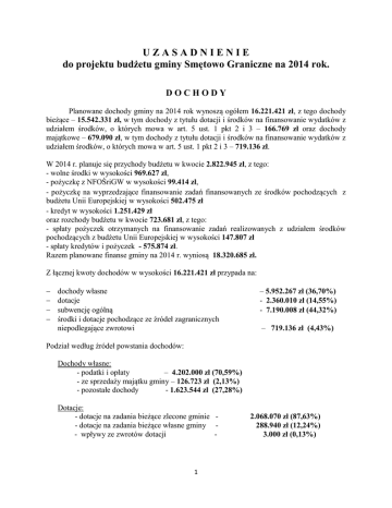 UZASADNIENIE do projektu budżetu gminy Smętowo Graniczne na 2014 rok. DOCHODY Planowane dochody gminy na 2014 rok wynoszą ogółem 16.221.421 zł, z tego dochody bieżące – 15.542.331 zł, w tym dochody z tytułu dotacji i środków na finansowanie wydatków z udziałem środków, o których mowa w art. 5 ust. 1 pkt 2 i 3 – 166.769 zł oraz dochody majątkowe – 679.090 zł, w tym dochody z tytułu dotacji i środków na finansowanie wydatków z udziałem środków, o których mowa w art. 5 ust. 1 pkt 2 i 3 – 719.136 zł. W 2014 r. planuje się przychody budżetu w kwocie 2.822.945 zł, z tego: - wolne środki w wysokości 969.627 zł, - pożyczkę z NFOŚriGW w wysokości 99.414 zł, - pożyczkę na wyprzedzające finansowanie zadań finansowanych ze środków pochodzących z budżetu Unii Europejskiej w wysokości 502.475 zł - kredyt w wysokości 1.251.429 zł oraz rozchody budżetu w kwocie 723.681 zł, z tego: - spłaty pożyczek otrzymanych na finansowanie zadań realizowanych z udziałem środków pochodzących z budżetu Unii Europejskiej w wysokości 147.807 zł - spłaty kredytów i pożyczek - 575.874 zł. Razem planowane finanse gminy na 2014 r. wyniosą 18.320.685 zł. Z łącznej kwoty dochodów w wysokości 16.221.421 zł przypada na: dochody własne dotacje subwencję ogólną środki i dotacje pochodzące ze źródeł zagranicznych niepodlegające zwrotowi – 5.952.267 zł (36,70%) - 2.360.010 zł (14,55%) - 7.190.008 zł (44,32%) – 719.136 zł (4,43%) Podział według źródeł powstania dochodów: Dochody własne: - podatki i opłaty – 4.202.000 zł (70,59%) - ze sprzedaży majątku gminy – 126.723 zł (2,13%) - pozostałe dochody - 1.623.544 zł (27,28%) Dotacje: - dotacje na zadania bieżące zlecone gminie - dotacje na zadania bieżące własne gminy - wpływy ze zwrotów dotacji - 1 2.068.070 zł (87,63%) 288.940 zł (12,24%) 3.000 zł (0,13%) Subwencja ogólna: - część oświatowa subwencji ogólnej - 4.643.937 zł (64,59%) - część wyrównawcza subwencji ogólnej - 2.541.520 zł (35,35%) - część równoważąca subwencji ogólnej 4.551 zł (0,06%) Środki pochodzące ze źródeł zagranicznych niepodlegające zwrotowi: - dotacje w ramach programów finansowanych z udziałem środków europejskich na realizacją zadań inwestycyjnych – 552.367 zł (76,81%) - dotacje w ramach programów finansowanych z udziałem środków europejskich na realizacją zadań bieżących – 166.769 zł (23,19%) 1. Podatki i opłaty – 4.271.710 zł, w tym: 1.1. Z podatku od nieruchomości przewiduje się dochody w wysokości 1.251.526 zł W założeniach przyjęto stawki zgodnie z Uchwałą Nr XXVI/204/2013 Rady Gminy Smętowo Graniczne z dnia 30 października 2013 roku w sprawie określenia stawek podatków i opłat lokalnych. 1.2.Wpływy z podatku rolnego przewiduje się w wysokości 919.314 zł. W założeniach przyjęto stawkę zgodnie z Uchwałą Nr XXVI/203/2013 Rady Gminy Smętowo Graniczne z dnia 30 października 2013 roku w sprawie obniżenia ceny skupu żyta przyjmowanej jako podstawy do obliczenia podatku rolnego na 2014 rok. Za podstawę do ustalenia wysokości przyjęto cenę żyta za 1 q w wysokości 60,00 zł (cena 1q żyta wg GUS wynosi 69,28 zł ) 1.3. Wpływy z podatku od środków transportowych planuje się w wysokości 50.140 zł. W założeniach przyjęto stawki zgodnie z Uchwałą Nr XXVI/205/2013 Rady Gminy Smętowo Graniczne z dnia 30 października 2013 roku w sprawie określenia wysokości stawek podatku od środków transportowych na 2014 rok. 1.4. Wpływy z podatku leśnego przyjęto w kwocie 41.754 zł. (cena 1m3 drewna wg GUS wynosi 171,05 zł, co daje 37,631 zł za 1 ha) 1.5. Dochody pobierane przez Urzędy Skarbowe przyjęto na poziomie przewidywanego wykonania za 2013 rok, z tego: - wpływy z karty podatkowej w kwocie 1.000 zł - wpływy z podatku od czynności cywilnoprawnych w wysokości 60.400 zł - wpływy z tytułu podatku od spadków i darowizn w kwocie 4.000 zł. - udział w podatku dochodowym od osób prawnych w kwocie 3.000 zł. 1.6. Wpływy z opłaty skarbowej planuje się na poziomie przewidywanego wykonania za 2013 rok w wysokości 10.000 zł. 1.7. Wpływy z opłaty targowej przyjęto w wysokości 1.000 zł. 1.8. Wpływy z opłat za zezwolenia na sprzedaż alkoholu w wysokości 72.895 zł. Na kwotę tą składają się: 1) opłaty za korzystanie z zezwoleń (do 4,5% oraz piwo, powyżej 4,5% do 18%, powyżej 18%), obliczona na podstawie złożonych oświadczeń przedsiębiorców, na: 2 a) sprzedaż napojów alkoholowych przeznaczonych do spożycia poza miejscem sprzedaży – 22 punktów, b) sprzedaż napojów alkoholowych przeznaczonych do spożycia w miejscu sprzedaży – 1 punkt. 2) opłaty za wydanie zezwoleń (do 4,5% oraz piwo, powyżej 4,5% do 18%, powyżej 18%) na: c) sprzedaż napojów alkoholowych przeznaczonych do spożycia poza miejscem sprzedaży – 13 punktów, d) sprzedaż napojów alkoholowych przeznaczonych do spożycia w miejscu sprzedaży – 0 punktów. 3) opłaty za wydanie jednorazowych zezwoleń (OSP) – 7 sztuk. 1.9. Wpływy z opłat za zajęcie pasa drogowego przyjęto w wysokości 5.000 zł. 1.10. Udział w podatku dochodowym od osób fizycznych przyjęto w kwocie 1.770.471 zł na podstawie informacji otrzymanej z Ministerstwa Finansów (pismo nr ST3/4820/10/2013 z dnia 10.10.2013r.) i wynikającej z ustawy budżetowej. W 2014 roku wielkość udziału gmin we wpływach z podatku dochodowego od osób fizycznych wynosić będzie 37,53%, a więc będzie wyższa niż w 2013 roku o 0,11 punktu procentowego. Wysokość tych dochodów ustalana jest szacunkowo, dlatego też w trakcie roku budżetowego może ona ulec zwiększeniu lub zmniejszeniu z powodów, na które Ministerstwo Finansów nie ma bezpośredniego wpływu. 1.10. Odsetki od nieterminowych wpłat podatków i opłat przyjęto w wysokości 11.500 zł. 2. Dochody ze sprzedaży majątku gminy w kwocie 126.723 zł , w tym: 2.1. Wpływy