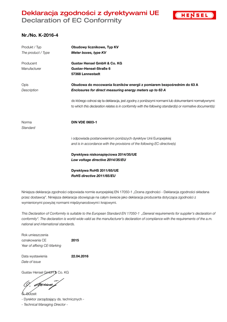 Deklaracja zgodności z dyrektywami UE Declaration of EC Conformity Nr./No. K-2016-4 Produkt / Typ Obudowy licznikowe, Typ KV The product / Type Meter boxes, type KV Producent Gustav Hensel GmbH & Co. KG Manufacturer Gustav-Hensel-Straße 6 57368 Lennestadt Opis Obudowa do mocowania liczników energii z pomiarem bezpośrednim do 63 A Description Enclosures for direct measuring energy meters up to 63 A do którego odnosi się ta deklaracja, jest zgodny z poniższymi normami lub dokumentami normatywnymi: to which this declaration relates is in conformity with the following standard(s) or normative document(s): Norma DIN VDE 0603-1 Standard i odpowiada postanowieniom poniższych dyrektyw Unii Europejskiej and is in accordance with the provisions of the following EC-directive(s) Dyrektywa niskonapięciowa 2014/35/UE Low voltage directive 2014/35/EU Dyrektywa RoHS 2011/65/UE RoHS directive 2011/65/EU Niniejsza deklaracja zgodności odpowiada normie europejskiej EN 17050-1 „Ocena zgodności - Deklaracja zgodności składana przez dostawcę”. Niniejsza deklaracja obowiązuje na całym świecie jako deklaracja producenta dotycząca zgodności z wymienionymi powyżej normami międzynarodowymi i krajowymi. This Declaration of Conformity is suitable to the European Standard EN 17050-1 „General requirements for supplier‘s declaration of conformity“. The declaration is world-wide valid as the manufacturer’s declaration of compliance with the requirements of the a.m. national and international standards. Rok umieszczenia oznakowania CE 2015 Year of affixing CE-Marking Data wystawienia 22.04.2016 Date of issue Gustav Hensel GmbH & Co. KG O. Gutzeit - Dyrektor zarządzający ds. technicznych - Technical Managing Director -