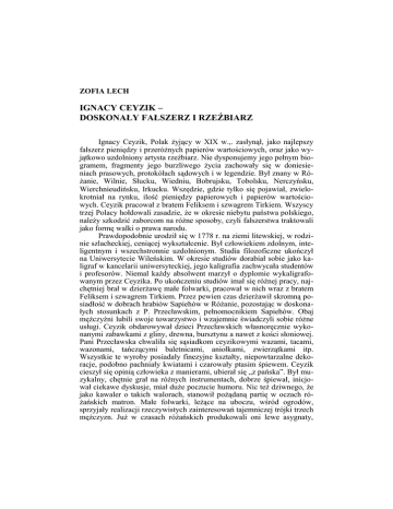 ZOFIA LECH IGNACY CEYZIK – DOSKONAŁY FAŁSZERZ I RZEŹBIARZ Ignacy Ceyzik, Polak żyjący w XIX w.,. zasłynął, jako najlepszy fałszerz pieniędzy i przeróżnych papierów wartościowych, oraz jako wyjątkowo uzdolniony artysta rzeźbiarz. Nie dysponujemy jego pełnym biogramem, fragmenty jego burzliwego życia zachowały się w doniesieniach prasowych, protokółach sądowych i w legendzie. Był znany w Różanie, Wilnie, Słucku, Wiedniu, Bobrujsku, Tobolsku, Nerczyńsku, Wierchnieudińsku, Irkucku. Wszędzie, gdzie tylko się pojawiał, zwielokrotniał na rynku, ilość pieniędzy papierowych i papierów wartościowych. Ceyzik pracował z bratem Feliksem i szwagrem Tirkiem. Wszyscy trzej Polacy hołdowali zasadzie, że w okresie niebytu państwa polskiego, należy szkodzić zaborcom na różne sposoby, czyli fałszerstwa traktowali jako formę walki o prawa narodu. Prawdopodobnie urodził się w 1778 r. na ziemi litewskiej, w rodzinie szlacheckiej, ceniącej wykształcenie. Był człowiekiem zdolnym, inteligentnym i wszechstronnie uzdolnionym. Studia filozoficzne ukończył na Uniwersytecie Wileńskim. W okresie studiów dorabiał sobie jako kaligraf w kancelarii uniwersyteckiej, jego kaligrafia zachwycała studentów i profesorów. Niemal każdy absolwent marzył o dyplomie wykaligrafowanym przez Ceyzika. Po ukończeniu studiów imał się różnej pracy, najchętniej brał w dzierżawę małe folwarki, pracował w nich wraz z bratem Feliksem i szwagrem Tirkiem. Przez pewien czas dzierżawił skromną posiadłość w dobrach hrabiów Sapiehów w Różanie, pozostając w doskonałych stosunkach z P. Przecławskim, pełnomocnikiem Sapiehów. Obaj mężczyźni lubili swoje towarzystwo i wzajemnie świadczyli sobie różne usługi. Ceyzik obdarowywał dzieci Przecławskich własnoręcznie wykonanymi zabawkami z gliny, drewna, bursztynu a nawet z kości słoniowej. Pani Przecławska chwaliła się sąsiadkom ceyzikowymi wazami, tacami, wazonami, tańczącymi baletnicami, aniołkami, zwierzątkami itp. Wszystkie te wyroby posiadały finezyjne kształty, niepowtarzalne dekoracje, podobno pachniały kwiatami i czarowały ptasim śpiewem. Ceyzik cieszył się opinią człowieka z manierami, ubierał się „z pańska”. Był muzykalny, chętnie grał na różnych instrumentach, dobrze śpiewał, inicjował ciekawe dyskusje, miał duże poczucie humoru. Nic też dziwnego, że jako kawaler o takich walorach, stanowił pożądaną partię w oczach różańskich matron. Małe folwarki, leżące na uboczu, wśród ogrodów, sprzyjały realizacji rzeczywistych zainteresowań tajemniczej trójki trzech mężczyzn. Już w czasach różańskich produkowali oni lewe asygnaty, 46 ZOFIA LECH które na rynek rosyjski wypuszczał (szwagier) Tirk, człowiek z ogromną fantazją, odważny i dowcipny. Przemierzał setki kilometrów, poszukiwał obszarów zamieszkałych przez ludzi, którzy mieli kłopoty z odróżnianiem pieniędzy od „kolorowych obrazków reklamowych” i ich w pierwszej kolejności uszczęśliwiał papierowymi „pieniędzmi”. Za fałszywe pieniądze kupował potrzebne materiały, niezbędne do produkcji „tajemnych wyrobów” i zaopatrywał „rodzinę” we wszelkie artykuły spożywcze. Rosyjskie Ministerstwo Finansów, zaniepokojone ilościowym wzrostem papierów wartościowych na rynku, w latach 1817-1820 rozpoczęło poszukiwania sprawcy tego cudu gospodarczego. Skromny tryb życia Ceyzika oddalał od niego podejrzenia, ale do czasu…Stosunkowo szybko opanował sztukę ulatniania się z miejsc zagrożenia. Posiadłości różańskie opuścił bezszelestnie, nawet nie pożegnał przyjaciół. Dwaj fałszerze znaleźli się w nowym otoczeniu, w okolicach Słucka, i tam robili swoje, zwiększając wydajność produkcyjną.! Podrabiane asygnaty i papierowe pieniądze były wykonane doskonale, od urzędowych odróżniały się wysoką jakością materiału oraz rysunku. W Słucku nie sprzyjało im szczęście. Policja nakryła producentów w trakcie pracy, nie było czasu na ucieczkę. Ceyzik i Tirk dostali się do więzienia w Mińsku Litewskim. Ceyzik, jak zwykle miły, taktowny, dowcipny szybko utorował sobie drogę do serc służby więziennej, która wyraźnie interesowała się sztuką fałszowania pieniędzy i chętnie poznałaby tajniki produkcji. Podobno Ceyzik był otoczony swoistym szacunkiem i korzystał z przywilejów innym więźniom niedostępnych i tak Ceyzik ze szwagrem, za pozwoleniem służby więziennej, wychodzili po zakupy do miasta. W więzieniu produkowali różne cudeńka, którymi obdarowywali służbę więzienną. Po pewnym czasie z więzienia uciekli i dotarli do Wiednia, gdzie niemal natychmiast przystąpili do pracy. Wybuchła afera, policja wpadła na trop, fałszerze pospiesznie opuścili Wiedeń i znaleźli się na Podolu. Wydzierżawili jeden z hutorów, leżących w dobrach księcia Czartoryskiego, i zaszyli się pod Międzyborzem. Ceyzik nie wychylał nosa z siedliska ukrytego w zaniedbanym ogrodzie. Interesy na mała skalę prowadził szwagier – Tirk. Ceyzik nie potrafił próżnować, wkrótce zaniedbany ogród przeistoczył w czarodziejski ogród., znany na Podolu min. z uprawy gruszek sapieżanek. Po zadomowieniu się Ceyzik powrócił do procederu fałszerza. Pieniądze płynęły obfitym strumieniem. Do Ceyzika i Tirka dołączył brat Feliks. Podobno wszyscy trzej fałszerze byli wyczuleni na biednych, chorych, opuszczonych ludzi, nieśli im bezimienną pomoc materialną. Szczególnie byli uwrażliwieni na polskie sieroty, których nigdzie nie brakowało. Zapewniali im „domy rodzinne,” przy szlachetnych rodzinach, klasztorach i kościołach. Ośrodki te wspomagali materialnie. Finansowo wspierali budowę dróg, mostów. Tirk(szwagier), rozwinął handel końmi, wołami, dywanami, jedwabiami i wszelkimi wonnościami. Był to doskonały kamuflaż dla rzeczywistej pracy fałszerzy. I znów zostali wykryci, Ignacy Ceyzik – dos