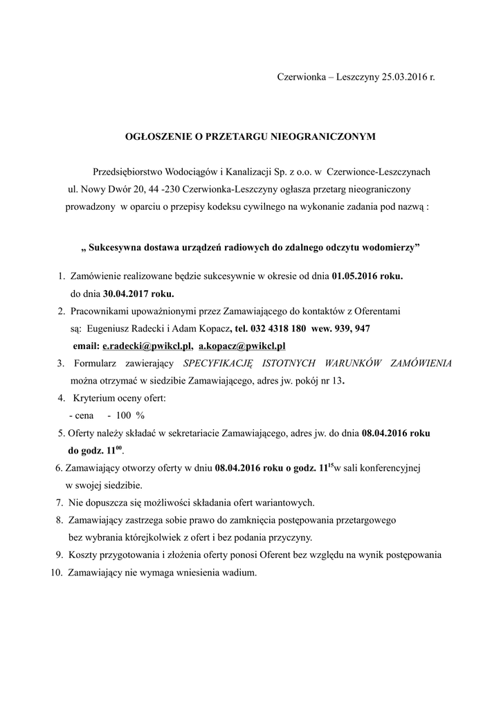 Czerwionka – Leszczyny 25.03.2016 r. OGŁOSZENIE O PRZETARGU NIEOGRANICZONYM Przedsiębiorstwo Wodociągów i Kanalizacji Sp. z o.o. w Czerwionce-Leszczynach ul. Nowy Dwór 20, 44 -230 Czerwionka-Leszczyny ogłasza przetarg nieograniczony prowadzony w oparciu o przepisy kodeksu cywilnego na wykonanie zadania pod nazwą : „ Sukcesywna dostawa urządzeń radiowych do zdalnego odczytu wodomierzy” 1. Zamówienie realizowane będzie sukcesywnie w okresie od dnia 01.05.2016 roku. do dnia 30.04.2017 roku. 2. Pracownikami upoważnionymi przez Zamawiającego do kontaktów z Oferentami są: Eugeniusz Radecki i Adam Kopacz, tel. 032 4318 180 wew. 939, 947 email: [email protected], [email protected] 3. Formularz zawierający SPECYFIKACJĘ ISTOTNYCH WARUNKÓW ZAMÓWIENIA można otrzymać w siedzibie Zamawiającego, adres jw. pokój nr 13. 4. Kryterium oceny ofert: - cena - 100 % 5. Oferty należy składać w sekretariacie Zamawiającego, adres jw. do dnia 08.04.2016 roku do godz. 1100. 6. Zamawiający otworzy oferty w dniu 08.04.2016 roku o godz. 1115w sali konferencyjnej w swojej siedzibie. 7. Nie dopuszcza się możliwości składania ofert wariantowych. 8. Zamawiający zastrzega sobie prawo do zamknięcia postępowania przetargowego bez wybrania którejkolwiek z ofert i bez podania przyczyny. 9. Koszty przygotowania i złożenia oferty ponosi Oferent bez względu na wynik postępowania 10. Zamawiający nie wymaga wniesienia wadium.