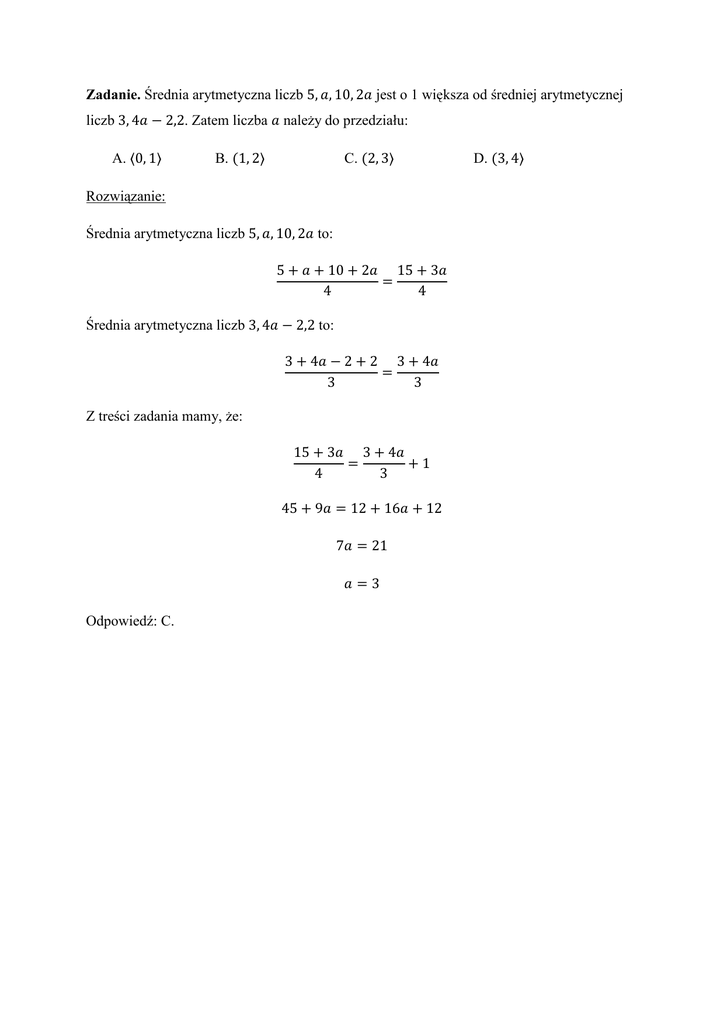 Zadanie. Średnia arytmetyczna liczb 5, , 10, 2 jest o 1 większa od średniej arytmetycznej liczb 3, 4 2,2. Zatem liczba należy do przedziału: A. 0, 1〉 B. 1, 2〉 C. 2, 3〉 Rozwiązanie: Średnia arytmetyczna liczb 5, , 10, 2 to: 5 10 2 15 3 4 4 Średnia arytmetyczna liczb 3, 4 2,2 to: 3 4 2 2 3 4 3 3 Z treści zadania mamy, że: 15 3 3 4 1 3 4 45 9 12 16 12 7 21 3 Odpowiedź: C. D. 3, 4〉