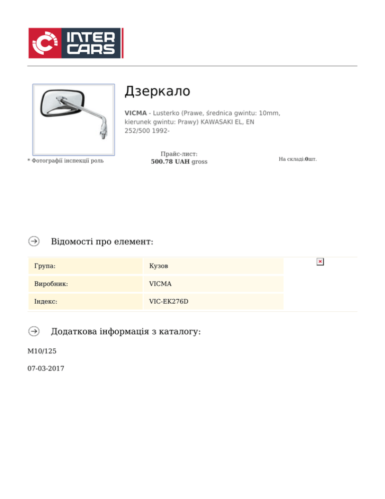 Дзеркало VICMA - Lusterko (Prawe, średnica gwintu: 10mm, kierunek gwintu: Prawy) KAWASAKI EL, EN 252/500 1992- * Фотографії інспекції роль Прайс-лист: 500.78 UAH gross Відомості про елемент: Група: Кузов Виробник: VICMA Індекс: VIC-EK276D Додаткова інформація з каталогу: M10/125 07-03-2017 На складі:0шт.