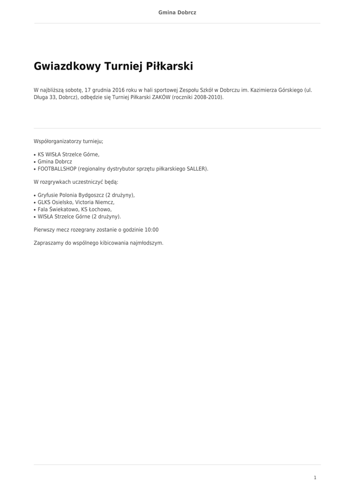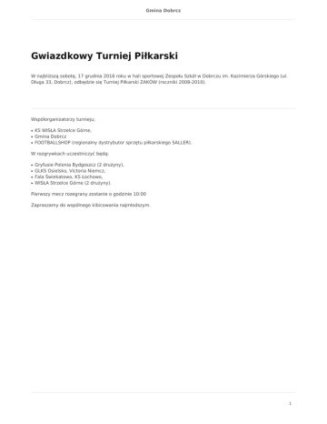 Gmina Dobrcz Gwiazdkowy Turniej Piłkarski W najbliższą sobotę, 17 grudnia 2016 roku w hali sportowej Zespołu Szkół w Dobrczu im. Kazimierza Górskiego (ul. Długa 33, Dobrcz), odbędzie się Turniej Piłkarski ZAKÓW (roczniki 2008-2010). Współorganizatorzy turnieju; ● ● ● KS WISŁA Strzelce Górne, Gmina Dobrcz FOOTBALLSHOP (regionalny dystrybutor sprzętu piłkarskiego SALLER). W rozgrywkach uczestniczyć będą: ● ● ● ● Gryfusie Polonia Bydgoszcz (2 drużyny), GLKS Osielsko, Victoria Niemcz, Fala Świekatowo, KS Łochowo, WISŁA Strzelce Górne (2 drużyny). Pierwszy mecz rozegrany zostanie o godzinie 10:00 Zapraszamy do wspólnego kibicowania najmłodszym. 1
