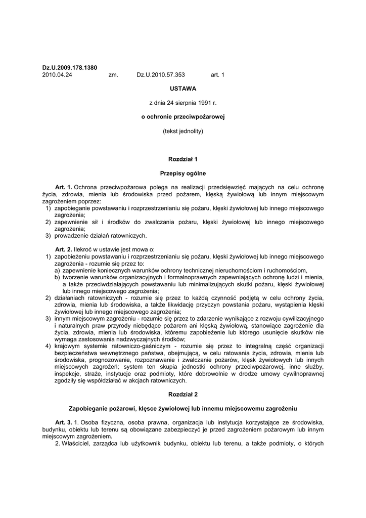 Dz.U.2009.178.1380 2010.04.24 zm. Dz.U.2010.57.353 art. 1 USTAWA z dnia 24 sierpnia 1991 r. o ochronie przeciwpożarowej (tekst jednolity) Rozdział 1 Przepisy ogólne Art. 1. Ochrona przeciwpożarowa polega na realizacji przedsięwzięć mających na celu ochronę życia, zdrowia, mienia lub środowiska przed pożarem, klęską żywiołową lub innym miejscowym zagrożeniem poprzez: 1) zapobieganie powstawaniu i rozprzestrzenianiu się pożaru, klęski żywiołowej lub innego miejscowego zagrożenia; 2) zapewnienie sił i środków do zwalczania pożaru, klęski żywiołowej lub innego miejscowego zagrożenia; 3) prowadzenie działań ratowniczych. Art. 2. Ilekroć w ustawie jest mowa o: 1) zapobieżeniu powstawaniu i rozprzestrzenianiu się pożaru, klęski żywiołowej lub innego miejscowego zagrożenia - rozumie się przez to: a) zapewnienie koniecznych warunków ochrony technicznej nieruchomościom i ruchomościom, b) tworzenie warunków organizacyjnych i formalnoprawnych zapewniających ochronę ludzi i mienia, a także przeciwdziałających powstawaniu lub minimalizujących skutki pożaru, klęski żywiołowej lub innego miejscowego zagrożenia; 2) działaniach ratowniczych - rozumie się przez to każdą czynność podjętą w celu ochrony życia, zdrowia, mienia lub środowiska, a także likwidację przyczyn powstania pożaru, wystąpienia klęski żywiołowej lub innego miejscowego zagrożenia; 3) innym miejscowym zagrożeniu - rozumie się przez to zdarzenie wynikające z rozwoju cywilizacyjnego i naturalnych praw przyrody niebędące pożarem ani klęską żywiołową, stanowiące zagrożenie dla życia, zdrowia, mienia lub środowiska, któremu zapobieżenie lub którego usunięcie skutków nie wymaga zastosowania nadzwyczajnych środków; 4) krajowym systemie ratowniczo-gaśniczym - rozumie się przez to integralną część organizacji bezpieczeństwa wewnętrznego państwa, obejmującą, w celu ratowania życia, zdrowia, mienia lub środowiska, prognozowanie, rozpoznawanie i zwalczanie pożarów, klęsk żywiołowych lub innych miejscowych zagrożeń; system ten skupia jednostki ochrony przeciwpożarowej, inne służby, inspekcje, straże, instytucje oraz podmioty, które dobrowolnie w drodze umowy cywilnoprawnej zgodziły się współdziałać w akcjach ratowniczych. Rozdział 2 Zapobieganie pożarowi, klęsce żywiołowej lub innemu miejscowemu zagrożeniu Art. 3. 1. Osoba fizyczna, osoba prawna, organizacja lub instytucja korzystające ze środowiska, budynku, obiektu lub terenu są obowiązane zabezpieczyć je przed zagrożeniem pożarowym lub innym miejscowym zagrożeniem. 2. Właściciel, zarządca lub użytkownik budynku, obiektu lub terenu, a także podmioty, o których mowa w ust. 1, ponoszą odpowiedzialność za naruszenie przepisów przeciwpożarowych, w trybie i na zasadach określonych w innych przepisach. Art. 4. 1. Właściciel budynku, obiektu budowlanego lub terenu, zapewniając ich ochronę przeciwpożarową, jest obowiązany: 1) przestrzegać przeciwpożarowych wymagań techniczno-budowlanych, instalacyjnych i technologicznych; 2) wyposażyć budynek, obiekt budowlany lub teren w wymagane urządzenia przeciwpożarowe i gaśnice; 3) zapewnić konserwację oraz naprawy urządzeń przeciwpożarowych i gaśnic w sposób gwarantujący ich sprawne i niezawodne funkcjonowanie; 4) zapewnić osobom przebywającym w budynku, obiekcie budowlanym lub na terenie, bezpieczeństwo i możliwość ewakuacji; 5) przygotować budynek, obiekt budowlany lub teren do prowadzenia akcji ratowniczej; 6) zapoznać pracowników z przepisami przeciwpożarowymi; 7) ustalić sposoby postępowania na wypadek powstania pożaru, klęski żywiołowej lub innego miejscowego zagrożenia. 1a. Odpowiedzialność za realizację obowiązków z zakresu ochrony przeciwpożarowej, o których mowa w ust. 1, stosownie do obowiązków i zadań powierzonych w odniesieniu do budynku, obiektu budowlanego lub terenu, przejmuje - w całości lub w części - ich zarządca lub użytkownik, na podstawie zawartej umowy cywilnoprawnej ustanawiającej zarząd lub użytkowanie. W przypadku gdy umowa taka nie została zawarta, odpowiedzialność za realizację obowiązków z zakresu ochrony przeciwpożarowej spoczywa na faktycznie władającym budynkiem, obiektem budowlanym lub terenem. 2. Czynności z zakresu ochrony przeciwpożarowej mogą wykonywać osoby posiadające odpowiednie kwalifikacje. 2a. Osoby wykonujące czynności z zakresu ochrony przeciwpożarowej, polegające na zapobieganiu powstawaniu i rozprzestrzenianiu się pożaru, niezatrudnione w jednostkach ochrony przeciwpożarowej, o których mowa w art. 15 pkt 1a-5 i 8, powinny posiadać wykształcenie wyższe i ukończone szkolenie specjalistów ochrony przeciwpożarowej albo mieć wykształcenie wyższe na kierunku inżynieria bezpieczeństwa pożarowego lub tytuł zawodowy inżyniera pożarnictwa lub uzyskać uznanie kwalifikacji do wykonywania zawodu inżyniera pożarnictwa w toku postępowania o uznanie nabytych w państwach członkowskich Unii Europejskiej, w państwach członkowskich Europejskiego Porozumienia o Wolnym Handlu (EFTA) - stronach umowy o Europejskim Obszarze Gospodarczym lub w Konfederacji Szwajcarskiej kwalifikacji do wykonywania zawodu regulowanego - inżyniera pożarnictwa. 2b. Osoby wymienione w ust. 2a, wykonujące czynności wyłącznie w zakresie wynikającym z ust. 1, powinny posiadać co najmniej wykształcenie średnie i ukończone szkolenie inspektorów ochrony przeciwpożarowej lub mieć tytuł zawodowy technika pożarnictwa lub uzyskać uznanie kwalifikacji do wykonywania zawodu technika pożarnictwa w toku postępowania o uznanie nabytych w państwach członkowskich Unii Europejskiej, w państwach członkowskich Europejskiego Porozumienia o Wolnym Handlu (EFTA) - stronach umowy o Europejskim Obszarze Gospodarczym lub w Konfederacji Szwajcarskiej kwalifikacji do wykonywania zawodu regulowanego - technika pożarni