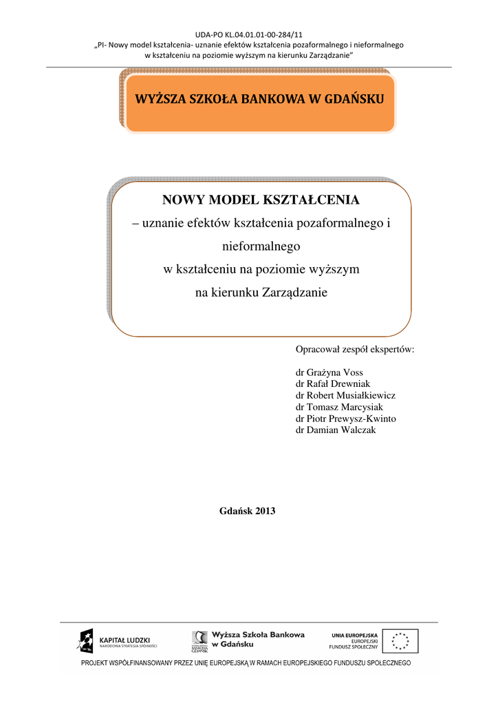 UDA-PO KL.04.01.01-00-284/11 „PI- Nowy model kształcenia- uznanie efektów kształcenia pozaformalnego i nieformalnego w kształceniu na poziomie wyższym na kierunku Zarządzanie” WYŻSZA SZKOŁA BANKOWA W GDAŃSKU NOWY MODEL KSZTAŁCENIA – uznanie efektów kształcenia pozaformalnego i nieformalnego w kształceniu na poziomie wyższym na kierunku Zarządzanie Opracował zespół ekspertów: dr Grażyna Voss dr Rafał Drewniak dr Robert Musiałkiewicz dr Tomasz Marcysiak dr Piotr Prewysz-Kwinto dr Damian Walczak Gdańsk 2013 UDA-PO KL.04.01.01-00-284/11 „PI- Nowy model kształcenia- uznanie efektów kształcenia pozaformalnego i nieformalnego w kształceniu na poziomie wyższym na kierunku Zarządzanie” Spis treści WSTĘP................................................................................................................................................. 2 CZĘŚĆ I Model legislacyjny .............................................................................................................. 4 Ad. 1. Projekt ustawy – zmieniającej ustawę Prawo o szkolnictwie wyższym ........................... 5 Ad. 2. Projekt – Rozporządzenia Ministra Nauki i Szkolnictwa Wyższego................................ 6 Ad 3. Projekt ustawy – zmieniającej ustawę Prawo o szkolnictwie wyższym .......................... 10 Ad. 4. Projekt uchwały Senatu uczelni wyższej ........................................................................ 16 CZĘŚĆ II Model organizacyjny ........................................................................................................ 17 Etap I: Identyfikacja problemów decyzyjnych .......................................................................... 20 Etap II. Etap organizacyjny procesu .......................................................................................... 24 Etap III. Etap realizacji procesu ................................................................................................. 28 Etap IV. Etap zakończenia i kontroli procesu ............................................................................ 31 CZĘŚĆ III Model narzędziowy ......................................................................................................... 33 PODSTAWY ZARZĄDZANIA ................................................................................................ 39 PRAWO ..................................................................................................................................... 42 FINANSE ................................................................................................................................... 45 WSTĘP Projekt innowacyjny mający na celu opracowanie modelu prawnego, organizacyjnego i UDA-PO KL.04.01.01-00-284/11 „PI- Nowy model kształcenia- uznanie efektów kształcenia pozaformalnego i nieformalnego w kształceniu na poziomie wyższym na kierunku Zarządzanie” narzędziowego niezbędnego do uznania studentom efektów kształcenia uzyskanych w drodze kształcenia nieformalnego i pozaformalnego, w tym doświadczenia zawodowego na kierunku Zarządzanie. Przesłanki do realizacji projektu: 1. brak rozwiązań prawnych w Polsce umożliwiających uznanie efektów kształcenia zdobytych poza szkolnictwem wyższym, 2. brak rozwiązań organizacyjnych na uczelniach, 3. brak narzędzi do mierzenia wiedzy, umiejętności i kompetencji zdobytych poza szkolnictwem wyższym, 4. niski poziom zaufania uczelni i organów państwowych do uznawania efektów kształcenia. Projekt obejmuje realizację następujących zadań: 1. pogłębiona diagnoza (najlepsze praktyki w Europie, badania fokusowe – kandydatów na studia, badania ankietowe studentów, badanie potrzeb dziekanów i dydaktyków, spotkanie diagnostyczne z Radą Programową – pracodawcami), 2. opracowanie wstępnej wersji produktu finalnego – modelu i strategii wdrażania projektu (model legislacyjny, organizacyjny i narzędziowy). 3. testowanie produktu – modelu, 4. analiza rzeczywistych efektów testowanego produktu – modelu, 5. opracowanie ostatecznej wersji produktu – modelu, 6. upowszechnianie modelu, 7. ewaluacja projektu i produktu. UDA-PO KL.04.01.01-00-284/11 „PI- Nowy model kształcenia- uznanie efektów kształcenia pozaformalnego i nieformalnego w kształceniu na poziomie wyższym na kierunku Zarządzanie” CZĘŚĆ I Model legislacyjny Model legislacyjny obejmuje następujące elementy, które dadzą możliwość wprowadzenia uznawalności efektów kształcenia pozaformalnego i nieformalnego w kształceniu na poziomie wyższym: 1. Projekt ustawy – zmieniającej ustawę Prawo o szkolnictwie wyższym 2. Projekt – Rozporządzenia Ministra Nauki i Szkolnictwa Wyższego 3. Projekt Regulaminu uznawalności efektów kształcenia 4. Projekt uchwały Senatu uczelni wyższej UDA-PO KL.04.01.01-00-284/11 „PI- Nowy model kształcenia- uznanie efektów kształcenia pozaformalnego i nieformalnego w kształceniu na poziomie wyższym na kierunku Zarządzanie” Ad. 1. Projekt ustawy – zmieniającej ustawę Prawo o szkolnictwie wyższym USTAWA z dnia ……………………. zmieniająca ustawę Prawo o szkolnictwie wyższym Art. 1. w ustawie z dnia 27 lipca 2005 r. Prawo o szkolnictwie wyższym (Dz. U. 2012 r. poz. 572) wprowadza się następujące zmiany: 1. w art. 98 ust. 1 dodaje się pkt. 4a w brzmieniu „ art. 98 ust. 1 pkt 4a opłaty za postępowanie związane z uznawalnością efektów kształcenia uzyskanych inną drogą niż formalna” 2. po art. 165 dodaje się art. 165a w brzmieniu: „ Art. 165a. 1. Senat uczelni ustala warunki i tryb uznawalności efektów kształcenia uzyskanych inną drogą niż formalna. 2. Minister właściwy do spraw szkolnictwa wyższego określi, w drodze rozporządzenia, warunki, jakim muszą odpowiadać postanowienia uchwały senatu, o której mowa w ust. 1, uwzględniając zakres uznawalności, tryb postępowania oraz zasady ustalania odp