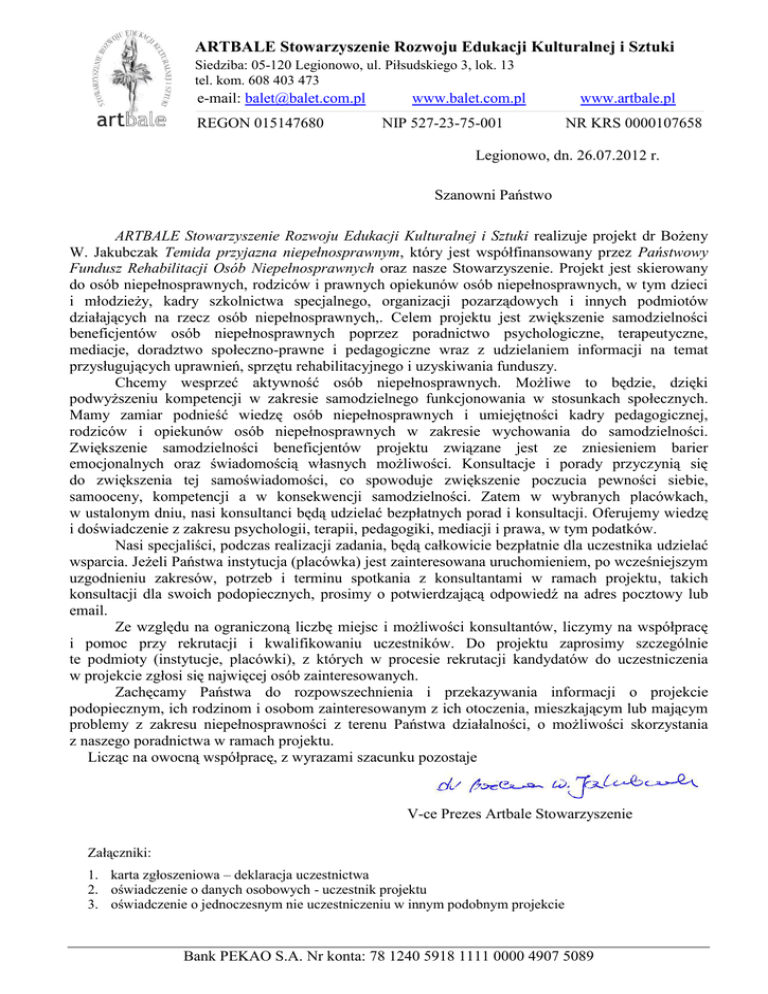ARTBALE Stowarzyszenie Rozwoju Edukacji Kulturalnej i Sztuki Siedziba: 05-120 Legionowo, ul. Piłsudskiego 3, lok. 13 tel. kom. 608 403 473 e-mail: [email protected] www.balet.com.pl www.artbale.pl __________________________________________________________________________________________________________________________________________________________________________________________________________________________________________________________________________________________________________________________________________________________________________________________________________ REGON 015147680 NIP 527-23-75-001 NR KRS 0000107658 Legionowo, dn. 26.07.2012 r. Szanowni Państwo ARTBALE Stowarzyszenie Rozwoju Edukacji Kulturalnej i Sztuki realizuje projekt dr Bożeny W. Jakubczak Temida przyjazna niepełnosprawnym, który jest współfinansowany przez Państwowy Fundusz Rehabilitacji Osób Niepełnosprawnych oraz nasze Stowarzyszenie. Projekt jest skierowany do osób niepełnosprawnych, rodziców i prawnych opiekunów osób niepełnosprawnych, w tym dzieci i młodzieży, kadry szkolnictwa specjalnego, organizacji pozarządowych i innych podmiotów działających na rzecz osób niepełnosprawnych,. Celem projektu jest zwiększenie samodzielności beneficjentów osób niepełnosprawnych poprzez poradnictwo psychologiczne, terapeutyczne, mediacje, doradztwo społeczno-prawne i pedagogiczne wraz z udzielaniem informacji na temat przysługujących uprawnień, sprzętu rehabilitacyjnego i uzyskiwania funduszy. Chcemy wesprzeć aktywność osób niepełnosprawnych. Możliwe to będzie, dzięki podwyższeniu kompetencji w zakresie samodzielnego funkcjonowania w stosunkach społecznych. Mamy zamiar podnieść wiedzę osób niepełnosprawnych i umiejętności kadry pedagogicznej, rodziców i opiekunów osób niepełnosprawnych w zakresie wychowania do samodzielności. Zwiększenie samodzielności beneficjentów projektu związane jest ze zniesieniem barier emocjonalnych oraz świadomością własnych możliwości. Konsultacje i porady przyczynią się do zwiększenia tej samoświadomości, co spowoduje zwiększenie poczucia pewności siebie, samooceny, kompetencji a w konsekwencji samodzielności. Zatem w wybranych placówkach, w ustalonym dniu, nasi konsultanci będą udzielać bezpłatnych porad i konsultacji. Oferujemy wiedzę i doświadczenie z zakresu psychologii, terapii, pedagogiki, mediacji i prawa, w tym podatków. Nasi specjaliści, podczas realizacji zadania, będą całkowicie bezpłatnie dla uczestnika udzielać wsparcia. Jeżeli Państwa instytucja (placówka) jest zainteresowana uruchomieniem, po wcześniejszym uzgodnieniu zakresów, potrzeb i terminu spotkania z konsultantami w ramach projektu, takich konsultacji dla swoich podopiecznych, prosimy o potwierdzającą odpowiedź na adres pocztowy lub email. Ze względu na ograniczoną liczbę miejsc i możliwości konsultantów, liczymy na współpracę i pomoc przy rekrutacji i kwalifikowaniu uczestników. Do projektu zaprosimy szczególnie te podmioty (instytucje, placówki), z których w procesie rekrutacji kandydatów do uczestniczenia w projekcie zgłosi się najwięcej osób zainteresowanych. Zachęcamy Państwa do rozpowszechnienia i przekazywania informacji o projekcie podopiecznym, ich rodzinom i osobom zainteresowanym z ich otoczenia, mieszkającym lub mającym problemy z zakresu niepełnosprawności z terenu Państwa działalności, o możliwości skorzystania z naszego poradnictwa w ramach projektu. Licząc na owocną współpracę, z wyrazami szacunku pozostaje V-ce Prezes Artbale Stowarzyszenie Załączniki: 1. karta zgłoszeniowa – deklaracja uczestnictwa 2. oświadczenie o danych osobowych - uczestnik projektu 3. oświadczenie o jednoczesnym nie uczestniczeniu w innym podobnym projekcie Bank PEKAO S.A. Nr konta: 78 1240 5918 1111 0000 4907 5089 KARTA ZGŁOSZENIA DEKLARACJA UCZESTNICTWA /WYPEŁNIA ZAINTERESOWANA OSOBA NIEPEŁNOSPRAWNA LUB OSOBA MAJĄCA BEZPOŚREDNI KONTAKT Z OSOBĄ NIEPEŁNOSPRAWNĄ. ZŁOŻENIE KARTY NIE JEST JESZCZE OSTATECZNYM ZAKWALIFIKOWANIEM DO PROJRKTU. * Gwiazdka oznacza konieczność wypełnienia, Właściwy kwadrat zaznaczyć przekreśleniem * I. DANE OSOBOWE OSOBY ZGŁASZAJĄCEJ SIĘ DO PROJEKTU NAZWISKO I IMIĘ* Płeć PESEL* kobieta mężczyzna osoba niepełnosprawna opiekun prawny lub rodzic osoby niepełnosprawnej osoba bezpośrednio działająca z osobą niepełnosprawną Rodzaj uczestnika* II. ADRES ZAMIESZKANIA (JEŻELI ADRES KORESPONDENCJI JEST INNY, PROSZĘ PODAĆ NA DODATKOWEJ KARCIE ZGŁOSZENIA) Miejscowość* Kod mazowieckie Województwo * Ulica* Numer telefonu* podlaskie świętokrzyskie Nr domu* E- mail* Nr lokalu* IV. INFORMACJE O PROBLEMIE I OCZEKIWANEJ POMOCY, WSPARCIA W RAMACH PROJEKTU Poradnictwo pedagogiczno - informacyjne (sprzęt rehabilitacyjny) Poradnictwo społeczno- prawne i podatkowe Rodzaj problemu i oczekiwanego wsparcia poradnictwa/doradztwa*: Poradnictwo mediacyjne Poradnictwo psychologiczne Poradnictwo terapeutyczne Rodzaj niepełnosprawności osoby, której dotyczy problematyka Krótki opis problemu lub pytania do konsultanta (O ZAKWALIFIKOWANIU DO PROJEKTU UCZESTNIK ZOSTANIE POWIADOMIONY PRZEZ ORGANIZATORA PO DOSTARCZENIU WSZYSTKICH DOKUMENTOW NA PODANY ADRES LUB EMAIL) Data*....................................... Czytelny podpis (imię i nazwisko)*…………………..……………………………….. ARTBALE Stowarzyszenie Ul. Piłsudskiego 3 lok. 13 05-120 Legionowo Tel. 608 403 473 www.artbale.pl e-mail: [email protected] UCZESTNIK PROJEKTU / OSOBA NIEPEŁNOSPRAWNA LUB OPIEKUN PRAWNY LUB UPOWAŻNIONA OSOBA BEZPOŚREDNIO DZIAŁAJACA Z NIEPEŁNOSPRAWNYM/B TEMIDA PRZYJAZNA NIEPEŁNOSPRAWNYM Projekt współfinansowany ze środków PFRON OŚWIADCZENIE UCZESTNIKA PROJEKTU o jednoczesnym nieuczestniczeniu w innym podobnym projekcie współfinansowanym ze środków PFRON odbywającym się w tym samym terminie W związku z przystąpieniem do projektu T