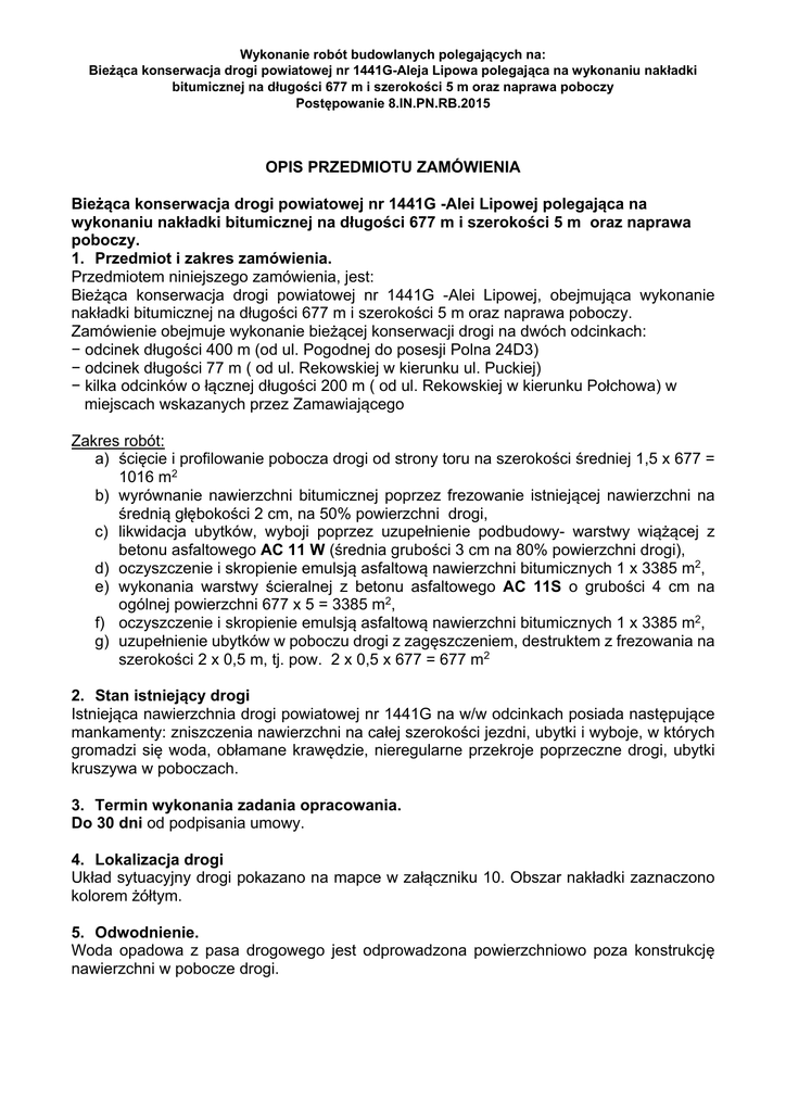 Wykonanie robót budowlanych polegających na: Bieżąca konserwacja drogi powiatowej nr 1441G-Aleja Lipowa polegająca na wykonaniu nakładki bitumicznej na długości 677 m i szerokości 5 m oraz naprawa poboczy Postępowanie 8.IN.PN.RB.2015 OPIS PRZEDMIOTU ZAMÓWIENIA Bieżąca konserwacja drogi powiatowej nr 1441G -Alei Lipowej polegająca na wykonaniu nakładki bitumicznej na długości 677 m i szerokości 5 m oraz naprawa poboczy. 1. Przedmiot i zakres zamówienia. Przedmiotem niniejszego zamówienia, jest: Bieżąca konserwacja drogi powiatowej nr 1441G -Alei Lipowej, obejmująca wykonanie nakładki bitumicznej na długości 677 m i szerokości 5 m oraz naprawa poboczy. Zamówienie obejmuje wykonanie bieżącej konserwacji drogi na dwóch odcinkach: − odcinek długości 400 m (od ul. Pogodnej do posesji Polna 24D3) − odcinek długości 77 m ( od ul. Rekowskiej w kierunku ul. Puckiej) − kilka odcinków o łącznej długości 200 m ( od ul. Rekowskiej w kierunku Połchowa) w miejscach wskazanych przez Zamawiającego Zakres robót: a) ścięcie i profilowanie pobocza drogi od strony toru na szerokości średniej 1,5 x 677 = 1016 m2 b) wyrównanie nawierzchni bitumicznej poprzez frezowanie istniejącej nawierzchni na średnią głębokości 2 cm, na 50% powierzchni drogi, c) likwidacja ubytków, wyboji poprzez uzupełnienie podbudowy- warstwy wiążącej z betonu asfaltowego AC 11 W (średnia grubości 3 cm na 80% powierzchni drogi), d) oczyszczenie i skropienie emulsją asfaltową nawierzchni bitumicznych 1 x 3385 m2, e) wykonania warstwy ścieralnej z betonu asfaltowego AC 11S o grubości 4 cm na ogólnej powierzchni 677 x 5 = 3385 m2, f) oczyszczenie i skropienie emulsją asfaltową nawierzchni bitumicznych 1 x 3385 m2, g) uzupełnienie ubytków w poboczu drogi z zagęszczeniem, destruktem z frezowania na szerokości 2 x 0,5 m, tj. pow. 2 x 0,5 x 677 = 677 m2 2. Stan istniejący drogi Istniejąca nawierzchnia drogi powiatowej nr 1441G na w/w odcinkach posiada następujące mankamenty: zniszczenia nawierzchni na całej szerokości jezdni, ubytki i wyboje, w których gromadzi się woda, obłamane krawędzie, nieregularne przekroje poprzeczne drogi, ubytki kruszywa w poboczach. 3. Termin wykonania zadania opracowania. Do 30 dni od podpisania umowy. 4. Lokalizacja drogi Układ sytuacyjny drogi pokazano na mapce w załączniku 10. Obszar nakładki zaznaczono kolorem żółtym. 5. Odwodnienie. Woda opadowa z pasa drogowego jest odprowadzona powierzchniowo poza konstrukcję nawierzchni w pobocze drogi. Wykonanie robót budowlanych polegających na: Bieżąca konserwacja drogi powiatowej nr 1441G-Aleja Lipowa polegająca na wykonaniu nakładki bitumicznej na długości 677 m i szerokości 5 m oraz naprawa poboczy Postępowanie 8.IN.PN.RB.2015 6. Nazwy i kody wg Wspólnego Słownika Zamówień (CPV) 45233140– 2 Roboty drogowe 7. Wymagania stawiane Wykonawcy 1) Osoby, które będą uczestniczyć w wykonaniu zamówienia, posiadają wymagane uprawnienia (kierownik budowy, kierownik robót – uprawnienia drogowe). 2) Wykonawca zobowiązuje się strzec mienia znajdującego się na terenie budowy oraz wykonać zabezpieczenie budowy, a także zapewnić warunki bezpieczeństwa. 3) W czasie realizacji robót Wykonawca będzie utrzymywał teren budowy w stanie wolnym od przeszkód komunikacyjnych oraz będzie usuwał zbędne materiały, odpady i śmieci. 4) Wykonawca zobowiązuje się do zabezpieczenia terenu budowy w sposób niepowodujący zagrożenia dla osób trzecich, oraz ponosi pełną odpowiedzialność z tytułu zabezpieczenia terenu budowy. 5) Wykonawca zapewnia tymczasową organizację ruchu w rejonie wykonywanych robot i ma on obowiązek zabezpieczenia terenu prowadzonych robót i zapewnienia warunków bezpieczeństwa ruchu na terenie budowy odpowiednio oznakowując teren. 6) Po zakończeniu robót Wykonawca zobowiązany jest uporządkować teren budowy i przekazać go Zamawiającemu nie później niż w dniu dokonania odbioru końcowego robót. 7) Przedmiot umowy zostanie wykonany z materiałów i przy użyciu urządzeń dostarczonych przez wykonawcę. 8) Materiały i urządzenia, o których mowa w ust.1 powinny odpowiadać: wymogom wyrobów dopuszczonych do obrotu i stosowania w budownictwie określonych w art. 10 ustawy Prawo budowlane, wymaganiom specyfikacji istotnych warunków zamówienia, co do jakości oraz po zaopiniowaniu przez inspektora nadzoru i zaakceptowanych przez Zamawiającego. 9) Na każde żądanie Zamawiającego (inspektora) Wykonawca obowiązany jest okazać w stosunku do wskazanych materiałów: certyfikat zgodności z Polską Normą lub aprobatę techniczną. 8. Uwagi końcowe Wszystkie roboty należy wykonać zgodnie z obowiązującymi normami, sztuką inżynierską, przepisami BHP i Specyfikacja techniczną wykonania i odbioru robót. 9. Kryteria oceny ofert 1) Cena – 90 % 2) Okres gwarancji – 10 % Okres gwarancji nie może być dłuższy niż 6 lat ( okres gwarancji nie może być krótszy, niż 3 lata, punktacja będzie obejmowała okres powyżej 3 lat do 6 lat).