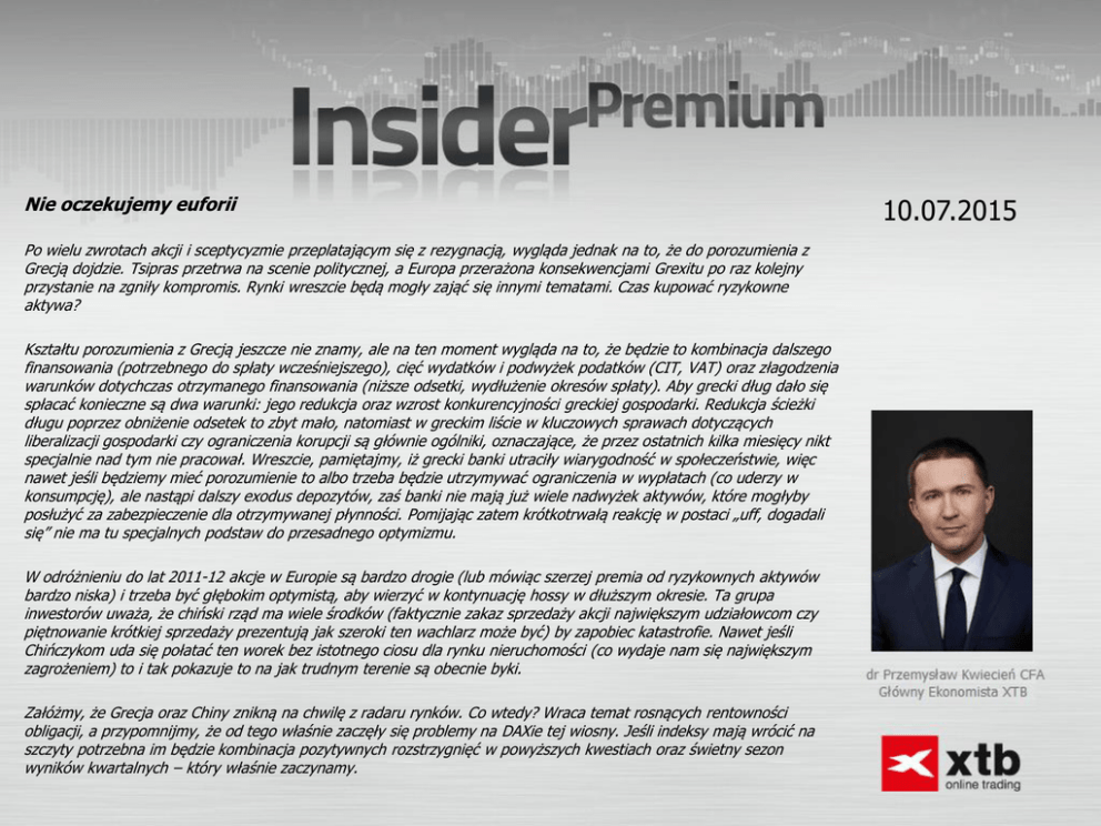 Nie oczekujemy euforii Po wielu zwrotach akcji i sceptycyzmie przeplatającym się z rezygnacją, wygląda jednak na to, że do porozumienia z Grecją dojdzie. Tsipras przetrwa na scenie politycznej, a Europa przerażona konsekwencjami Grexitu po raz kolejny przystanie na zgniły kompromis. Rynki wreszcie będą mogły zająć się innymi tematami. Czas kupować ryzykowne aktywa? Kształtu porozumienia z Grecją jeszcze nie znamy, ale na ten moment wygląda na to, że będzie to kombinacja dalszego finansowania (potrzebnego do spłaty wcześniejszego), cięć wydatków i podwyżek podatków (CIT, VAT) oraz złagodzenia warunków dotychczas otrzymanego finansowania (niższe odsetki, wydłużenie okresów spłaty). Aby grecki dług dało się spłacać konieczne są dwa warunki: jego redukcja oraz wzrost konkurencyjności greckiej gospodarki. Redukcja ścieżki długu poprzez obniżenie odsetek to zbyt mało, natomiast w greckim liście w kluczowych sprawach dotyczących liberalizacji gospodarki czy ograniczenia korupcji są głównie ogólniki, oznaczające, że przez ostatnich kilka miesięcy nikt specjalnie nad tym nie pracował. Wreszcie, pamiętajmy, iż grecki banki utraciły wiarygodność w społeczeństwie, więc nawet jeśli będziemy mieć porozumienie to albo trzeba będzie utrzymywać ograniczenia w wypłatach (co uderzy w konsumpcję), ale nastąpi dalszy exodus depozytów, zaś banki nie mają już wiele nadwyżek aktywów, które mogłyby posłużyć za zabezpieczenie dla otrzymywanej płynności. Pomijając zatem krótkotrwałą reakcję w postaci „uff, dogadali się” nie ma tu specjalnych podstaw do przesadnego optymizmu. W odróżnieniu do lat 2011-12 akcje w Europie są bardzo drogie (lub mówiąc szerzej premia od ryzykownych aktywów bardzo niska) i trzeba być głębokim optymistą, aby wierzyć w kontynuację hossy w dłuższym okresie. Ta grupa inwestorów uważa, że chiński rząd ma wiele środków (faktycznie zakaz sprzedaży akcji największym udziałowcom czy piętnowanie krótkiej sprzedaży prezentują jak szeroki ten wachlarz może być) by zapobiec katastrofie. Nawet jeśli Chińczykom uda się połatać ten worek bez istotnego ciosu dla rynku nieruchomości (co wydaje nam się największym zagrożeniem) to i tak pokazuje to na jak trudnym terenie są obecnie byki. Załóżmy, że Grecja oraz Chiny znikną na chwilę z radaru rynków. Co wtedy? Wraca temat rosnących rentowności obligacji, a przypomnijmy, że od tego właśnie zaczęły się problemy na DAXie tej wiosny. Jeśli indeksy mają wrócić na szczyty potrzebna im będzie kombinacja pozytywnych rozstrzygnięć w powyższych kwestiach oraz świetny sezon wyników kwartalnych – który właśnie zaczynamy. 10.07.2015 Wydarzenia tygodnia • Grecja – Grecy wysłali nowe propozycje do Brukseli, rynki czekają na ich zatwierdzenie przez Eurogrupę, co powinno oznaczać również ich zatwierdzenie na planowanych niedzielnych szczytach UE i strefy euro Plan raportu 1) Rynek walutowy: • Przed decyzją Banku Kanady • EURUSD,EURPLN-AT • GBPUSD, NZDUSD - AT 2) Rynek akcyjny • Chińczycy chwytają się brzytwy • S&P500, DAX - AT 3) Rynek surowców: • Rudy żelaza • Ropa, złoto – AT minionego: str. 3,4 str.5 str. 6 str. 7 str. 8 str. 9 str. 10 • Pekin próbuje powstrzymać spadki na giełdach – władze wprowadzają rozmaite regulacje i zmuszają państwowe fundusze do kupowania akcji i indeksy lekko odbijają, a w ślad za nimi surowce • Dane z USA – minutes FOMC gołębie, ISM dla usług bez szału, claimsy mocno w górę, rynkowe stopy w USA w dół • Dobre dane z UK – produkcja mocno w górę (chociaż przetwórstwo zaskoczyło in minus), ceny nieruchomości również, deficyt bilansu handlowego znacznie mniejszy od oczekiwań • Niezłe dane z Niemiec – produkcja przemysłowa bez zaskoczeń, troszkę lepsze zamówienia w przemyśle, eksport mocno w górę kolejnego: • Wystąpienia J.Yellen – szefowa FED w środę i w czwartek wystąpi przed komisjami w Kongresie ze sprawozdaniem na temat polityki monetarnej • Dane z USA – sprzedaż detaliczna (wtorek); PPI, indeks Empire State, produkcja przemysłowa (środa); claimsy, Philly FED indeks, NAHB (czwartek); inflacja CPI, indeks UoM, pozwolenia i rozpoczęte budowy domów • Dane z Chin – bilans handlowy, nowe kredyty (poniedziałek); PKB, produkcja przemysłowa, sprzedaż detaliczna, inwestycje w aglomeracjach miejskich (środa) • Dane z UK – inflacja CPI, PPI (wtorek); stopa bezrobocia i wnioski o zasiłek (środa) • Banki centralne – posiedzenie EBC (czwartek); minutes Rikbsanku, posiedzenie BoJ (środa) • Start sezonu wyników – J&J, JPM, Wells Fargo, BofA, Intel, Goldman, Citi – tydzień z wynikami banków Przed decyzją Banku Kanady (I) 15 lipca odbędzie się następne posiedzenie Banku Kanady. W tym roku BoC zdecydował się na obniżkę stóp procentowych (o 25 punktów bazowych) jedynie w styczniu. Podczas zbliżającego się posiedzenia konsensus rynkowy nie przewiduje zmian kosztu pieniądza – jednak podobnie sytuacja wyglądała podczas wszystkich decyzji w tym roku, również tej styczniowej – ale możemy zauważyć sporą różnicę opinii poszczególnych ekonomistów. Spośród 24 przesłanych prognoz do ankiety przeprowadzanej przez Bloomberga, 16 analityków uważa, że stopy pozostaną na poziomie 0,75%, a 8 jest zdania, iż możemy oczekiwać cięcia o 25pb do 0,5%. Warto zwrócić uwagę, że dwóch najlepszych ekonomistów według rankingu prognoz historycznych różni się co do lipcowego postanowienia BoC. Bank Kanady z pewnością będzie zaniepokojony ostatnimi wydarzeniami na rynkach surowcowych, a w szczególności sporymi spadkami cen ropy, która jest istotnym towarem eksportowym z kraju. Istotna przecena ropy przyczyniła się do osłabienia się kursu dolara kanadyjskiego. USDCAD znajduje się aktualnie w okolicach 1,2670, na skalę deprecjacji waluty wskazuj