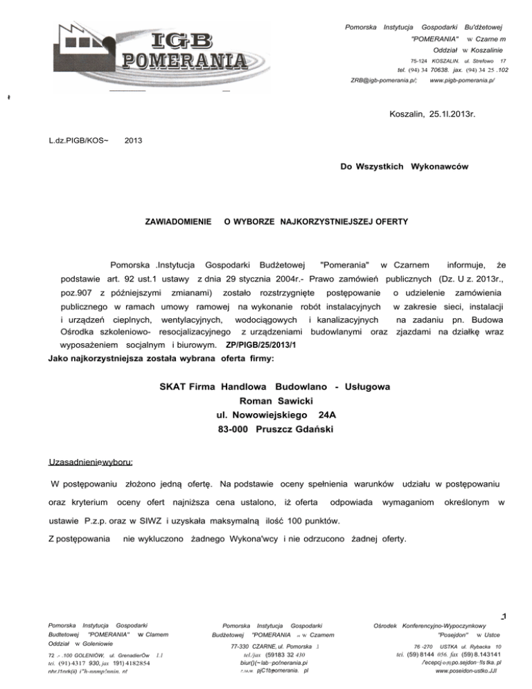 Pomorska Instytucja Gospodarki "POMERANIA" Bu'dżetowej w Czarne m Oddział w Koszalinie 75-124 KOSZALIN. ul. Strefowo 17 tel. (94) 34 70638. jax. (94) 34 25 .102 [email protected]/; www.pigb-pomerania.p/ ł Koszalin, 25.1l.2013r. L.dz.PIGB/KOS~ 2013 Do Wszystkich Wykonawców ZAWIADOMIENIE Pomorska .Instytucja O WYBORZE NAJKORZYSTNIEJSZEJ OFERTY Gospodarki Budżetowej "Pomerania" w Czarnem informuje, że podstawie art. 92 ust.1 ustawy z dnia 29 stycznia 2004r.- Prawo zamówień publicznych (Dz. U z. 2013r., poz.907 z późniejszymi zmianami) zostało rozstrzygnięte postępowanie o udzielenie publicznego w ramach umowy ramowej na wykonanie robót instalacyjnych zamówienia w zakresie sieci, instalacji i urządzeń cieplnych, wentylacyjnych, wodociągowych i kanalizacyjnych na zadaniu pn. Budowa Ośrodka szkoleniowo- resocjalizacyjnego z urządzeniami budowlanymi oraz zjazdami na działkę wraz wyposażeniem socjalnym i biurowym. ZP/PIGB/25/2013/1 Jako najkorzystniejsza została wybrana oferta firmy: SKAT Firma Handlowa Budowlano - Usługowa Roman Sawicki ul. Nowowiejskiego 24A 83-000 Pruszcz Gdański Uzasadnieniewyboru: W postępowaniu złożono jedną ofertę. Na podstawie oceny spełnienia warunków udziału w postępowaniu oraz kryterium oceny ofert najniższa cena ustalono, iż oferta odpowiada wymaganiom określonym w ustawie P.z.p. oraz w SIWZ i uzyskała maksymalną ilość 100 punktów. Z postępowania nie wykluczono żadnego Wykona'wcy i nie odrzucono żadnej oferty. 1 Pomorska Budtetowej Instytucja Gospodarki "POMERANIA" Pomorska w Clamem Oddział w Goleniowie 72 .- .100 GOLENIÓW, ul. GrenadierÓw tei. (91) 4317 930, jax 191) 4182854 nhr.l1nrk(ii) i"h-nnmp!nnin. n! 1.1 Budżetowej Instytucja Gospodarki "POMERANIA H W Ośrodek Konferencyjno-Wypoczynkowy Czamem 77-330 CZARNE, ul. Pomorska .l tel./jax (59183 32 430 biur()(~ lab··po!nerania.pi l",.I\A,/W. pjC1b~ pornerania. pl "Posejdon" 76 -270 w Ustce USTKA ul. Rybacka 10 tei. (59) 8144 056. fax (59) 8.143141 /'ecepcj o (fi) po.sejdon··!ls tka. pl www.poseidon-ustko.JJI Pomorska Instytucja Gospodarki Budżetowej "POMERANIA" w Czarnem Oddział w Koszalinie 75-124 KOSZALIN, ul. Strefowe] 17 tel. (94) 34 70638- fax. (94) 3425.102 [email protected]; www.pigb-pamerania.pl Streszczenie oceny ofert: Nr Liczba pkt. w ofert kryterium cena Firma ( nazwa) oraz adres y 100% Wykonawcy l SKAT Firma Handlowa Budowlano-Usługowa Roman Sawicki 83-000 Pruszcz 100pkt. Gdański ul. Nowowiejskiego 24A Zamawiający zawrze umowę w sprawie zamówienia publicznego w terminie określonym art. 94 ust.2 pkt.2 ustawy P.z.p. Otrzymują: 1. . SKAT Firma Handlowa Budowlano-Usługowa Roman Sawicki 83-000 Pruszcz Gdański ul. Nowowiejskiego 24A fax:0586831171 2 Pomorska Instytucja Gospodarki Budżetowej "POMERANIA" w Czamem Oddział w Goleniowie 72·- .100 GOLEN/ÓW, ul. GrenadierÓw tef. (91) 4317 930, fax (9l) 4.1 82854 f1hr. nnrk([i) ioh· nnrneffJnio. ni 1.1 Pomorska Instytucjo Gospodarki Budżetowej "POMERANIA" w Czamem 77-330 CZARNE~ul. Pomorsko .1 LeJ./fax (59) 83 32 430 biuro(ip igb·· pOfneran ja. pi www.piob-porl1erc:mio.pl Ośrodek Konferencyjno-Wypoczynkowy "Posejdon" w Ustce 76- 270 USTKA,u!. RV!JOcka .UJ te!. (59) 8144056, fax (59) 8.143141 recepcj e] (iDpO.\ ejdon- (Jol tko. p! www.po.\eidon ..u.\tka.p!
