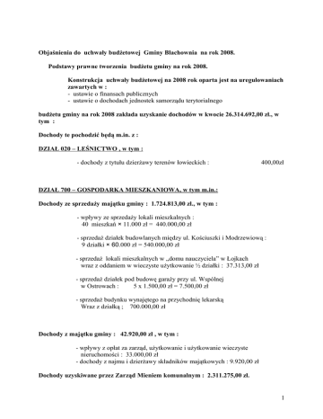 Objaśnienia do uchwały budżetowej Gminy Blachownia na rok 2008. Podstawy prawne tworzenia budżetu gminy na rok 2008. Konstrukcja uchwały budżetowej na 2008 rok oparta jest na uregulowaniach zawartych w : - ustawie o finansach publicznych - ustawie o dochodach jednostek samorządu terytorialnego budżetu gminy na rok 2008 zakłada uzyskanie dochodów w kwocie 26.314.692,00 zł., w tym : Dochody te pochodzić będą m.in. z : DZIAŁ 020 – LEŚNICTWO , w tym : - dochody z tytułu dzierżawy terenów łowieckich : 400,00zł DZIAŁ 700 – GOSPODARKA MIESZKANIOWA, w tym m.in.: Dochody ze sprzedaży majątku gminy : 1.724.813,00 zł., w tym : - wpływy ze sprzedaży lokali mieszkalnych : 40 mieszkań × 11.000 zł = 440.000,00 zł - sprzedaż działek budowlanych między ul. Kościuszki i Modrzewiową : 9 działki × 60.000 zł = 540.000,00 zł - sprzedaż lokali mieszkalnych w „domu nauczyciela” w Łojkach wraz z oddaniem w wieczyste użytkowanie ½ działki : 37.313,00 zł - sprzedaż działek pod budowę garaży przy ul. Wspólnej w Ostrowach : 5 x 1.500,00 zł = 7.500,00 zł - sprzedaż budynku wynajętego na przychodnię lekarską Wraz z działką ; 700.000,00 zł Dochody z majątku gminy : 42.920,00 zł , w tym : - wpływy z opłat za zarząd, użytkowanie i użytkowanie wieczyste nieruchomości : 33.000,00 zł - dochody z najmu i dzierżawy składników majątkowych : 9.920,00 zł Dochody uzyskiwane przez Zarząd Mieniem komunalnym : 2.311.275,00 zł. 1 Odsetki od nieterminowo przekazywanych należności stanowiących dochody gminy : 1.500,00 zł DZIAŁ 801 – OŚWIATA I WYCHOWANIE, w tym : : - wpływy z usług : - wpływy za miejsce dziecka w przedszkolu : - pozostałe odsetki : 58.756,00 zł, w tym 58.756,00 zł 13,00 zł DZIAŁ 852 – POMOC SPOŁECZNA, w tym : - wpływy z usług : - częściowa odpłatność za usługi opiekuńcze Uzyskiwane przez Miejski Ośrodek Pomocy Społecznej : - dotacje celowe otrzymane z budżetu państwa na realizację własnych zadań bieżących gmin : 20.530,00 zł, w tym 20.530,00 zł 258.050,00 zł DZIAŁ 921 - KULTURA I OCHRONA DZIEDZICTWA NARODOWEGO , w tym : - dotacja celowa otrzymana przez jednostkę samorządu terytorialnego od innej jednostki samorządu terytorialnego będącej instytucją wdrażającą na zadania bieżące realizowane na podstawie porozumień ( środki Funduszy Strukturalnych - Regionalny Programu Operacyjnego ) : 250.000,00 zł DZIAŁ 926 – KULTURA FIZYCZNA I SPORT , w tym : - środki z Funduszu Rozwoju Kultury Fizycznej : 1.300.000,00 zł Dotacje na realizacje zadań z zakresu administracji rządowej :3.402.470,00 zł. PRZYCHODY : 3.624.700,00 zł., w tym : - przychody z tytułu innych rozliczeń krajowych : - przychody z zaciągniętych pożyczek i kredytów : 1.639.700,00 zł 1.985.000,00 zł. 2 PROGNOZOWANE KWOTY DŁUGU NA ROK 2007 I LATA NASTĘPNE Lp . Tytuł dłużny 2007 3 - 2008 4 - 2009 5 - 1 1. 2 Wyemitowane papiery wartościowe 2. Kredyty długoterminowe 7.506.460 7403.460 6.763.460 3. Pożyczki długoterminowe 1.452.751 1.282.751 1.112.751 4. 5. 2010 6 - 2011 7 - 2012 8 - 2013 9 - 2014 10 - 6.183.460 5.652.760 4.467.000 3.267.000 2.067.000 942.751 772.751 602.751 2015 11 - 867.000 262.751 92.751 Prognozowanie dochody budż. - - Wymagalne zobowiązania a) jednostek budżetowych b) pozostałych zakładów budżetowych gosp. pomoc. funduszy wynikające z : - - - - - - 432.751 - 6. - ustaw - orzeczeń sądu - udzielonych poręczeń i gwarancji - innych tytułów w tym dostawy towarów i usług - składki na ubezp. społeczne i fundusze pracy Ogółem kwota zadłużenia - - - - - - 8.959.211 Przewidywane kredyty i pożyczki: - rok 2007 ; 3.325.444,00 zł - rok 2008 : 1.985.000,00zł - rok 2009 : 1.195.000,00 zł - rok 2010 - 687.000,00 zł - rok 2011 - 600.000,00 zł 9.124.211 8.509..211 7.526.211 6.425.511 5.069.751 3.699.751 2.329.751 959.751 PLANOWANE SPŁATY ZOBOWIĄZAŃ NA ROK 2007 I LATA NASTĘPNE L TYTUŁ P SPŁATY . Spłata 1 . kredytów 2007 734.240 2008 1.650.000 2009 1.640.000 2010 1.500.000 2011 1.530.700 2012 1.185.760 2013 1.200.000 2014 1.200.000 2015 1.200.000 2016 867.000 970.000 170.000 170.000 170.000 170.000 170.000 170.000 170.000 170.000 92.751 - - - - - - - - - - 1.704.240 1.820.000 1.810.000 1.670.000 1.700.700 1.355.760 1.370.000 1.370.000 1.370.000 959751 długotermin owych Spłata rat 2 . pożyczek długotermin owych Potencjalne 3 . kwoty spłat udzielonych poręczeń Uwzględniono spłaty pożyczek przewidzianych do zaciągnięcia w latach 2008-2011 na ogólną kwotę 4.467.000,00 zł. DOCHODY DO ODPROWADZENIA DO BUDŻETU PAŃSTWA Z TYTUŁU REALIZACJI ZADAŃ ZLECONYCH JEDNOSTKOM SAMORZĄDU TERYTORIALNEGO DZIAŁ 750 – ADMINISTRACJA PUBLICZNA : Rozdział 75011 - Urzędy Wojewódzkie : - dochody budżetu państwa związane z realizację zadań zlecanych jednostkom samorządu terytorialnego : DZIAŁ 852 – POMOC SPOŁECZNA : Rozdział 85212 - Świadczenia rodzinne, zaliczka alimentacyjna oraz składki na ubezpieczenia emerytalne i rentowe z ubezpieczenia społecznego : - dochody budżetu państwa związane z realizację zadań zlecanych jednostkom samorządu terytorialnego : 31.200,00 zł 31.200,00 zł 31.200,00 zł 8.000,00 zł 8.000,00 zł 8.000,00 zł 6 OBJAŚNIENIA DO PRZYCHODÓW I WYDATKÓW GMINNEGO FUNDUSZU OCHRONY ŚRODOWISKA I GOSPODARKI WODNEJ NA ROK 2008. Przychody: 10.000,00 zł tym : wpływy z opłat : 10.000,00 zł Wydatki : 43.000,00 zł w tym : - dotacje do wymiany pieców na ekologiczne : - dotacja do zakupu leków dla pszczół : - dotacje do utrzymania rowów melioracyjnych : 27.000,00 zł 1.000,00 zł 15.000,00 zł Przewiduje się, że na koniec roku 2007 stan środków na rachunku Gminnego Funduszu Ochrony Środowiska i Gospodarki Wodnej będzie wynosił 34.000,00 zł., a na 31.12.2008 r. - 1.000,00 zł. 7 OBJAŚNIENIA DO WYDATKÓW BUDŻETOWYCH NA ROK 2008 DZIAŁ 010 – ROLNICTWO I ŁOWIECTWO : 1.100,00 zł Rozdział 01030 – Izby rolnicze 1.100,00 zł : w 