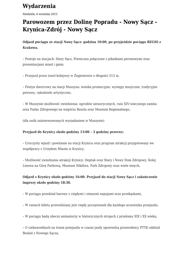 Wydarzenia Niedziela, 6 września 2015 Parowozem przez Dolinę Popradu - Nowy Sącz Krynica-Zdrój - Nowy Sącz Odjazd pociągu ze stacji Nowy Sącz: godzina 10:00, po przyjeździe pociągu REGIO z Krakowa. – Postoje na stacjach: Stary Sącz, Piwniczna połączone z piknikami peronowymi oraz prezentacjami miast i gmin. – Przejazd przez tunel kolejowy w Żegiestowie o długości 513 m. – Festyn dworcowy na stacji Muszyna: stoiska promocyjne, występy muzyczne, tradycyjne potrawy, rękodzieło artystyczne, – W Muszynie możliwość zwiedzenia: ogrodów sensorycznych, ruin XIV-wiecznego zamku oraz Parku Zdrojowego na wzgórzu Baszta oraz Muzeum Regionalnego, (dla osób zainteresowanych wysiadaniem w Muszynie) Przyjazd do Krynicy około godziny 13:00 – 3 godziny przerwy: – Uroczysty wjazd i powitanie na stacji Krynica oraz program atrakcji przygotowany we współpracy z Urzędem Miasta w Krynicy, – Możliwość zwiedzania atrakcji Krynicy: Deptak oraz Stary i Nowy Dom Zdrojowy, Kolej Linowa na Górę Parkową, Muzeum Nikifora, Park Zdrojowy oraz wiele innych, Odjazd z Krynicy około godziny 16:00. Przyjazd do stacji Nowy Sącz i zakończenie imprezy około godziny 18:30. – W pociągu przedział barowy z ciepłymi i zimnymi napojami oraz przekąskami, – W ramach biletu przewidziany jest ciepły poczęstunek dla każdego uczestnika przejazdu, – W pociągu będą obecni animatorzy w historycznych strojach z przełomu XIX i XX wieku, – O ciekawostkach na trasie przejazdu w czasie jazdy opowiedzą przewodnicy PTTK oddział Beskid z Nowego Sącza,