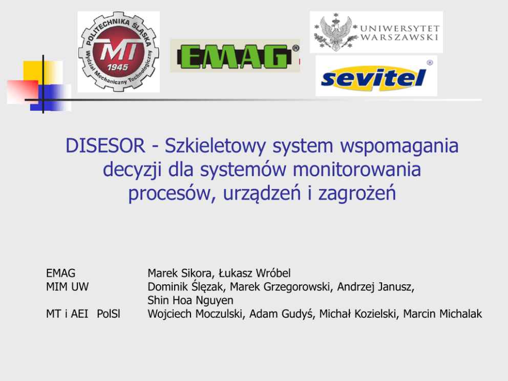 DISESOR - Szkieletowy system wspomagania decyzji dla systemów monitorowania procesów, urządzeń i zagrożeń EMAG MIM UW MT i AEI PolSl Marek Sikora, Łukasz Wróbel Dominik Ślęzak, Marek Grzegorowski, Andrzej Janusz, Shin Hoa Nguyen Wojciech Moczulski, Adam Gudyś, Michał Kozielski, Marcin Michalak Plan • Moduły • Technologie • Moduł/proces ETL • Moduł prognostyczny • Moduł analityczny • Dane DISESOR • Szkieletowy system wspomagania decyzji • Analiza zgromadzonych danych – moduł analityczny • Wiedza dziedzinowa – system ekspertowy • Prognozowanie on-line – moduł prognostyczny • Zastosowanie dziedzinowe - zwiększenie funkcjonalności systemów monitorowania i systemów dyspozytorskich. „Architektura” – autonomiczne moduły Technologie • Szkielet RapidMiner (ver. 6.5 – dostępne źródła – Java; R) • Moduł analityczny (wtyczka) • System ekspertowy (wtyczka) • Moduł prognostyczny (wtyczka) • ETL (Talend Open Studio) • SZBD (PostgreSQL) • Raporty (BIRT) Źródła danych – systemy monitorowania i dyspozytorskie Podniesienie jakości danych • Podobny projekt realizowany z COIG