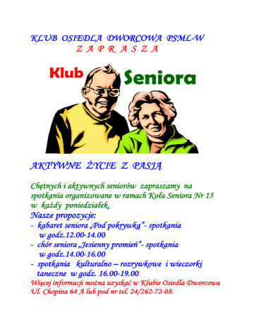KLUB OSIEDLA DWORCOWA PSML-W Z A P R A S Z A AKTYWNE ŻYCIE Z PASJĄ Chętnych i aktywnych seniorów zapraszamy na spotkania organizowane w ramach Koła Seniora Nr 15 w każdy poniedziałek. Nasze propozycje: - kabaret seniora „Pod pokrywką”- spotkania w godz.12.00-14.00 - chór seniora „Jesienny promień”- spotkania w godz.14.00-16.00 - spotkania kulturalno – rozrywkowe i wieczorki taneczne w godz. 16.00-19.00 Więcej informacji można uzyskać w Klubie Osiedla Dworcowa Ul. Chopina 64 A lub pod nr tel. 24/262-72-08.