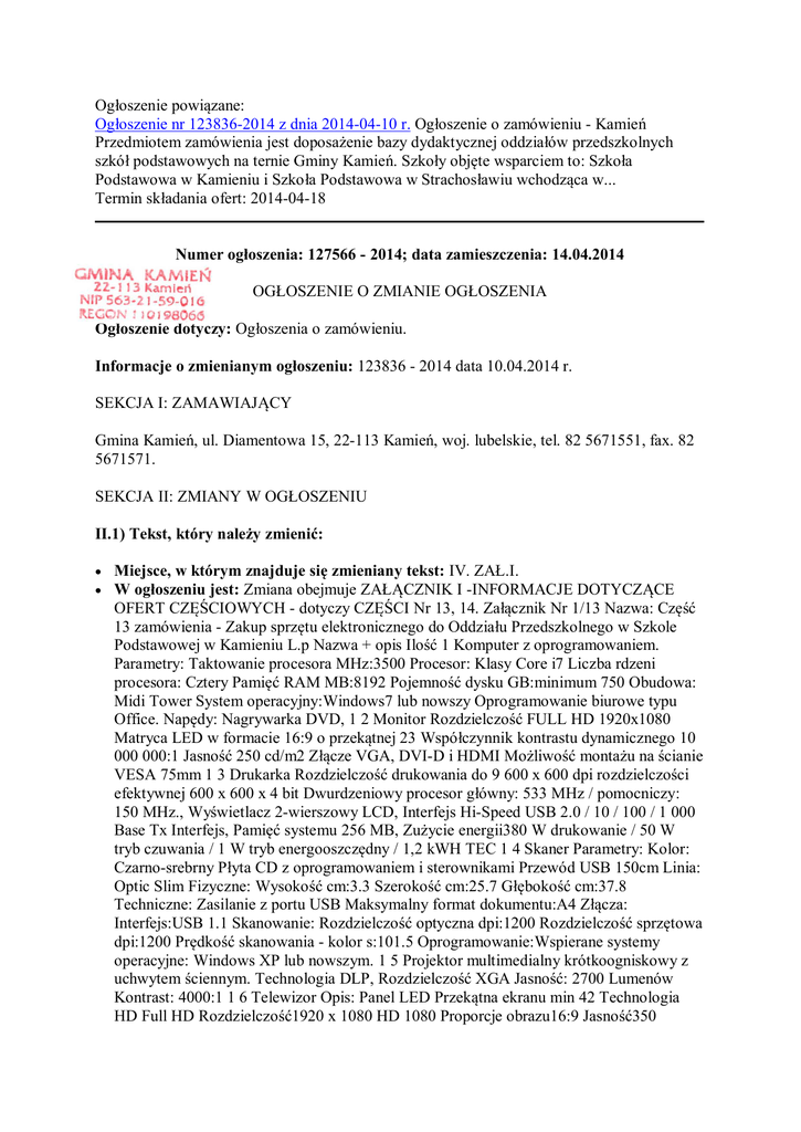 Og oszenie powi zane: Og oszenie nr 123836-2014 z dnia 2014-04-10 r. Og oszenie o zamówieniu - Kamie Przedmiotem zamówienia jest doposa enie bazy dydaktycznej oddzia ów przedszkolnych szkó podstawowych na ternie Gminy Kamie . Szko y obj te wsparciem to: Szko a Podstawowa w Kamieniu i Szko a Podstawowa w Strachos awiu wchodz ca w... Termin sk adania ofert: 2014-04-18 Numer og oszenia: 127566 - 2014; data zamieszczenia: 14.04.2014 OG OSZENIE O ZMIANIE OG OSZENIA Og oszenie dotyczy: Og oszenia o zamówieniu. Informacje o zmienianym og oszeniu: 123836 - 2014 data 10.04.2014 r. SEKCJA I: ZAMAWIAJ CY Gmina Kamie , ul. Diamentowa 15, 22-113 Kamie , woj. lubelskie, tel. 82 5671551, fax. 82 5671571. SEKCJA II: ZMIANY W OG OSZENIU II.1) Tekst, który nale y zmieni : Miejsce, w którym znajduje si zmieniany tekst: IV. ZA .I. W og oszeniu jest: Zmiana obejmuje ZA CZNIK I -INFORMACJE DOTYCZ CE OFERT CZ CIOWYCH - dotyczy CZ CI Nr 13, 14. Za cznik Nr 1/13 Nazwa: Cz 13 zamówienia - Zakup sprz tu elektronicznego do Oddzia u Przedszkolnego w Szkole Podstawowej w Kamieniu L.p Nazwa + opis Ilo 1 Komputer z oprogramowaniem. Parametry: Taktowanie procesora MHz:3500 Procesor: Klasy Core i7 Liczba rdzeni procesora: Cztery Pami RAM MB:8192 Pojemno dysku GB:minimum 750 Obudowa: Midi Tower System operacyjny:Windows7 lub nowszy Oprogramowanie biurowe typu Office. Nap dy: Nagrywarka DVD, 1 2 Monitor Rozdzielczo FULL HD 1920x1080 Matryca LED w formacie 16:9 o przek tnej 23 Wspó czynnik kontrastu dynamicznego 10 000 000:1 Jasno 250 cd/m2 Z cze VGA, DVI-D i HDMI Mo liwo monta u na cianie VESA 75mm 1 3 Drukarka Rozdzielczo drukowania do 9 600 x 600 dpi rozdzielczo ci efektywnej 600 x 600 x 4 bit Dwurdzeniowy procesor g ówny: 533 MHz / pomocniczy: 150 MHz., Wy wietlacz 2-wierszowy LCD, Interfejs Hi-Speed USB 2.0 / 10 / 100 / 1 000 Base Tx Interfejs, Pami systemu 256 MB, Zu ycie energii380 W drukowanie / 50 W tryb czuwania / 1 W tryb energooszcz dny / 1,2 kWH TEC 1 4 Skaner Parametry: Kolor: Czarno-srebrny P yta CD z oprogramowaniem i sterownikami Przewód USB 150cm Linia: Optic Slim Fizyczne: Wysoko cm:3.3 Szeroko cm:25.7 G boko cm:37.8 Techniczne: Zasilanie z portu USB Maksymalny format dokumentu:A4 Z cza: Interfejs:USB 1.1 Skanowanie: Rozdzielczo optyczna dpi:1200 Rozdzielczo sprz towa dpi:1200 Pr dko skanowania - kolor s:101.5 Oprogramowanie:Wspierane systemy operacyjne: Windows XP lub nowszym. 1 5 Projektor multimedialny krótkoogniskowy z uchwytem ciennym. Technologia DLP, Rozdzielczo XGA Jasno : 2700 Lumenów Kontrast: 4000:1 1 6 Telewizor Opis: Panel LED Przek tna ekranu min 42 Technologia HD Full HD Rozdzielczo 1920 x 1080 HD 1080 Proporcje obrazu16:9 Jasno 350 Kontrast 100 000:1 Tuner TVDVB-T MPEG-2, DVB-T MPEG-4 1 7 Odtwarzacz DVD Standardy odtwarzania obrazu: DVD Video, DVD+R/RW, DVD-R/RW, DivX, MPEG-4, WMV Standardy odtwarzania d wi ku: CD Audio, CD-R/RW, MP3, WMA, Dolby Digital, DTS Cyfrowe wyj cie HDMI Barwa obudowy: czarny 1 8 Radio z odtwarzaczem CD Odtwarzacz p yt kompaktowych Radio analogowe Barwa: czarno-srebrny Zasilanie :6 baterii R14, sieciowe 220 - 240 V, 50/60 Hz 1 9 Tablica interaktywna Technologia pozycjonowania w podczerwieni dotykowa, mo na obs ugiwa tablic pisakiem, w asnym palcem b dowolnym, innym przedmiotem. Model DTO-i105A Przek tna wymiaru zewn trznego minimum 80 Format 16:10 Rozdzielczo 12800 x 9600 Grubo cm 3 Waga kg 33 Powierzchnia tablicy aluminiowa o wysokiej odporno ci na zarysowania, uszkodzenia mechaniczne; powierzchnia matowa, nie skupiaj ca wiat a, bezpieczna dla oczu. atwa do czyszczenia, dostosowana do u ywania pisaków sucho cieralnych. Wymagany system operacyjny Windows XP/Vista/7/8, Linux, Mac Oprogramowanie Bogate, funkcjonalne i intuicyjne oprogramowanie pozwala na realizacj wielu przydatnych, kreatywnych funkcji, jak: rozpoznawanie pisma odr cznego, odtwarzanie video z mo liwo ci pisania na filmie, zrzuty video, szybkie tworzenie figur geometrycznych. Program posiada bogat bibliotek za czników zwi zanych z przedmiotami szkolnymi a tak e wspó pracuje z wi kszo ci formatów graficznych. Integruje si z programami pakietu MS Office pozwalaj c na r czne dopisywanie notatek do dokumentów w formie graficznej. Wyposa enie Pó ka na pisaki, oprogramowanie na ycie CD, kabel USB, 2 pisaki, zestaw monta owy; Wymagania atmosferyczne podczas pracy Temperatura: od 0 C do 60 C, wilgotno : od 10% do 90%. Certyfikaty produktu CE, FCC, ROHS Monta tablicy wliczony w cen . 1 10 Kserokopiarka Interfejs USB:2.0 Interfejs Ethernet Praca w sieci Druk dwustronny Duplex: Technologia druku:Laserowa Rozdzielczo wydruku mono:600 x 600 dpi Maks. pr dko wydruku mono:20 str/min Typ skanera: Stolikowy Rozdzielczo skanera:600 x 600 dpi Maks. format skanowania:A3 Materia y eksploatacyjne:C-EXV33 Orientacyjna waga brutto:73000 g 1 2) Wspólny S ownik Zamówie (CPV): 32.32.20.00-6, 38.65.21.00-1, 30.21.30.00-5, 30.23.21.00-5, 32.32.46.00-6, 31.71.00.00-6, 92.22.50.00-4, 32.33.34.00-0, 30.12.51.30-1. 3) Czas trwania lub termin wykonania: Zako czenie: 27.06.2014. 4) Kryteria oceny ofert: najni sza cena. Za cznik Nr 1/14 Nazwa: Cz 14 zamówienia - Zakup sprz tu elektronicznego do Oddzia u Przedszkolnego w Szkole Podstawowej w Strachos awiu L.p Nazwa + opis Ilo 1 Komputer z oprogramowaniem. Parametry: Taktowanie procesora MHz:3500 Procesor: Klasy Core i7 Liczba rdzeni procesora: Cztery Pami RAM MB :8192 Pojemno dysku GB:minimum 750 Obudowa: Midi Tower System operacyjny:Windows7 lub nowszy Oprogramowanie biurowe typu Office. Nap dy: Nagrywarka DVD, 1 2 Monitor Rozdzielczo FULL HD 1920x1080 Matryca LED w formacie 16:9 o przek tnej 23 Wspó czynnik kontrastu dynamicznego 10 000 000:1 Jasno 250 cd/m2 Z cze VGA, DVI-D i HDMI Mo liwo monta u na cianie VESA 75mm 1 3 Drukarka Rozdzielczo drukowania do 9 600 x 600 dpi rozdzielczo ci efektywnej 600 x 600 x 4 bit Dwurdzeniowy procesor g ówny: 533 MHz / pomocniczy: 150 MHz., Wy wietlacz 2-wierszowy LCD, Interfejs Hi-Speed USB 2.0 / 10 / 100 / 1 000 Base Tx Inter