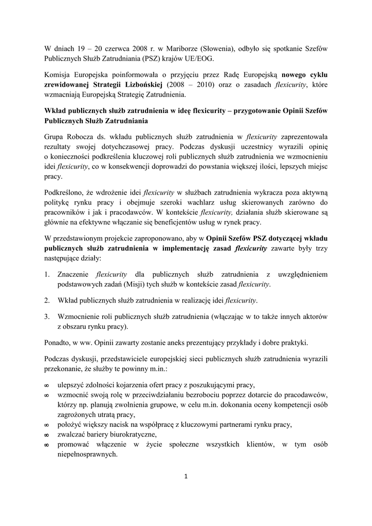 W dniach 19 – 20 czerwca 2008 r. w Mariborze (Słowenia), odbyło się spotkanie Szefów Publicznych SłuŜb Zatrudniania (PSZ) krajów UE/EOG. Komisja Europejska poinformowała o przyjęciu przez Radę Europejską nowego cyklu zrewidowanej Strategii Lizbońskiej (2008 – 2010) oraz o zasadach flexicurity, które wzmacniają Europejską Strategię Zatrudnienia. Wkład publicznych słuŜb zatrudnienia w ideę flexicurity – przygotowanie Opinii Szefów Publicznych SłuŜb Zatrudniania Grupa Robocza ds. wkładu publicznych słuŜb zatrudnienia w flexicurity zaprezentowała rezultaty swojej dotychczasowej pracy. Podczas dyskusji uczestnicy wyrazili opinię o konieczności podkreślenia kluczowej roli publicznych słuŜb zatrudnienia we wzmocnieniu idei flexicurity, co w konsekwencji doprowadzi do powstania większej ilości, lepszych miejsc pracy. Podkreślono, Ŝe wdroŜenie idei flexicurity w słuŜbach zatrudnienia wykracza poza aktywną politykę rynku pracy i obejmuje szeroki wachlarz usług skierowanych zarówno do pracowników i jak i pracodawców. W kontekście flexicurity, działania słuŜb skierowane są głównie na efektywne włączanie się beneficjentów usług w rynek pracy. W przedstawionym projekcie zaproponowano, aby w Opinii Szefów PSZ dotyczącej wkładu publicznych słuŜb zatrudnienia w implementację zasad flexicurity zawarte były trzy następujące działy: 1. Znaczenie flexicurity dla publicznych słuŜb zatrudnienia z uwzględnieniem podstawowych zadań (Misji) tych słuŜb w kontekście zasad flexicurity. 2. Wkład publicznych słuŜb zatrudnienia w realizację idei flexicurity. 3. Wzmocnienie roli publicznych słuŜb zatrudnienia (włączając w to takŜe innych aktorów z obszaru rynku pracy). Ponadto, w ww. Opinii zawarty zostanie aneks prezentujący przykłady i dobre praktyki. Podczas dyskusji, przedstawiciele europejskiej sieci publicznych słuŜb zatrudnienia wyrazili przekonanie, Ŝe słuŜby te powinny m.in.: • • • • • ulepszyć zdolności kojarzenia ofert pracy z poszukującymi pracy, wzmocnić swoją rolę w przeciwdziałaniu bezrobociu poprzez dotarcie do pracodawców, którzy np. planują zwolnienia grupowe, w celu m.in. dokonania oceny kompetencji osób zagroŜonych utratą pracy, połoŜyć większy nacisk na współpracę z kluczowymi partnerami rynku pracy, zwalczać bariery biurokratyczne, promować włączenie w Ŝycie społeczne wszystkich klientów, w tym osób niepełnosprawnych. 1 Wzmocnienie roli gremium Szefów Publicznych SłuŜb Zatrudnienia w wymiarze europejskim Komisja Europejska przedstawiła prezentację odnośnie wzmocnienia roli sieci publicznych słuŜb zatrudnienia w kontekście Strategii Lizbońskiej. NaleŜy prowadzić działania w oparciu o Misję Publicznych SłuŜb Zatrudnienia, w celu poprawy funkcjonowania sieci, zapewnienia uczestnictwa wszystkich aktorów oraz zachowania równowagi pomiędzy zagadnieniami politycznymi, a biznesowymi. Nowe podejście Komisji Europejskiej zostanie odzwierciedlone w rocznym programie prac, którego przygotowanie będzie rozpoczynać się na wiosnę poprzedzającego roku. Zaproponowano takŜe: • • • • • Utworzenie forum Asystentów Szefów Publicznych SłuŜb Zatrudnienia, w celu poprawy procesu przygotowania spotkań. Ujednolicenie wzoru prezentacji. Powoływanie się w agendzie na zapisy w Misji Publicznych SłuŜb Zatrudnienia. Podejmowania dyskusji na tematy wykraczające poza główny obszar działań (np. usługi powszechnego poŜytku). Upublicznienie działalności publicznych słuŜb zatrudnienia na szczeblu wspólnotowym. Plan Pracy Szefów Publicznych SłuŜb Zatrudnienia w 2008 r. Komisja Europejska poinformowała, Ŝe wszystkie prace przewidziane w programie pracy na 2008 r. przebiegają bez zakłóceń, z wyjątkiem badania PES multichannel service model. Ponadto, przed spotkaniem w grudniu 2008 r., Szefom Publicznych SłuŜb Zatrudnienia zostanie przekazany dokument roboczy wprowadzający do Europejskiego Planu Działań na rzecz Osób Niepełnosprawnych w latach 2008-2009. Opinie Szefów Publicznych SłuŜb Zatrudnienia na temat ww. dokumentu zostaną przekazane do Grupy Wysokiego Szczebla ds. Osób Niepełnosprawnych oraz Komitetu Zatrudnienia. Przygotowanie Planu Pracy Szefów Publicznych SłuŜb Zatrudnienia na 2009 r. Komisja Europejska poinformowała, Ŝe planowane jest przyjęcie Komunikatu Zrewidowanej Europejskiej Agendy Społecznej (Renewing the European Social Agenda), która zostanie przyjęta 2 lipca 2008 r. Komunikat ma na celu rozwaŜenie wdroŜenia Agendy Społecznej, w szczególności w zakresie oceny stopnia realizacji celów Strategii Lizbońskiej. W kontekście tej oceny konieczne będzie zrewidowanie priorytetów w obszarach: społecznym i zatrudnienia. Publiczne słuŜby zatrudnienia powinny skoncentrować się na następujących zagadnieniach: • • nowe umiejętności dla nowych miejsc pracy, zarządzanie migracjami z państw trzecich i zmiany strukturalne, aktywne „włączanie” i zakaz dyskryminacji, 2 • mobilność. Nowe Umiejętności dla Nowych Miejsc Pracy (New Skills for New Jobs) Ocena umiejętności oraz potrzeb w zakresie zatrudnienia jest strategicznym elementem modernizacji i globalizacji rynków pracy. Jest takŜe częścią Strategii Wzrostu i Zatrudnienia oraz kluczowym obszarem Europejskiej Strategii Zatrudnienia. Rada Europejska, w marcu 2008 r., potwierdziła, Ŝe inwestycje w kapitał ludzki i modernizacja rynków pracy są jednym z czterech priorytetów zrewidowanej Strategii Lizbońskiej. Zaproszono wówczas Komisję Europejską do przedstawienia oceny przyszłych wymagań odnośnie umiejętności i kwalifikacji, które będą wymagane na europejskim rynku pracy do 2020 r., uwzględniającej zmiany technologiczne i starzenie się społeczeństwa oraz zaproponowanie działań, które będą adekwatne do tych zjawisk. W tym kontekście, publiczne słuŜby zatrudnienia pełnią znaczną rolę w identyf