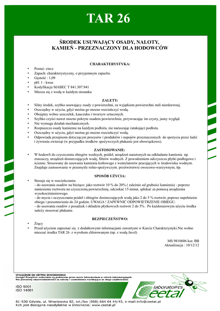 TAR 26 ŚRODEK USUWAJĄCY OSADY, NALOTY, KAMIEŃ - PRZEZNACZONY DLA HODOWCÓW • • • • • • • • • • • • • • • • • • CHARAKTERYSTYKA: Postać: ciecz Zapach: charakterystyczny, o przyjemnym zapachu Gęstość : 1,09 pH: 1 - kwas Kodyfikacja MABEC T 841.307.941 Miesza się z wodą w każdym stosunku ZALETY: Silny środek, szybko usuwający osady z powierzchni, za wyjątkiem powierzchni stali nierdzewnej. Oszczędny w użyciu, gdyż można go mocno rozcieńczyć wodą. Obojętny wobec uszczelek, kauczuku i tworzyw sztucznych. Szybko czyści nawet mocno pokryte osadem powierzchnie, przywracając im czysty, jasny wygląd. Nie wymaga działań mechanicznych. Rozpuszcza osady kamienne na każdym podłożu, nie naruszając (atakując) podłoża. Oszczędny w użyciu, gdyż można go mocno rozcieńczyć wodą. Odpowiada przepisom dotyczącym procesów i produktów i napojów przeznaczonych do spożycia przez ludzi i żywienia zwierząt (w przypadku środków spożywczych płukanie jest obowiązkowe). ZASTOSOWANIE: W hodowli do czyszczenia obiegów wodnych, poideł, urządzeń narażonych na odkładanie kamienia np. zraszaczy, urządzeń dostarczających wodę, filtrów wodnych. Z powodzeniem odczyszcza płytki podłogowe i ścienne. Stosowany do usuwania kamienia kotłowego z wentylatorów pracujących w środowisku wodnym. Znajduje zastosowanie w przemyśle rolno-spożywczym. przetwórstwie owocowo-warzywnym, itp. SPOSÓB UŻYCIA: Stosuje się w rozcieńczaniu: - do usuwania osadów na bieżąco: jako roztwór 10 % do 20% ( zależnie od grubości kamienia) - poprzez naniesienie roztworu na czyszczoną powierzchnię, odczekać 15 minut, spłukać za pomocą urządzenia wysokociśnieniowego. - do mycia i oczyszczania poideł i obiegów dostarczających wodę jako 2 do 5 % roztwór, poprzez napełnienie obiegu i pozostawienie do 24 godzin. UWAGA ! ZAPEWNIĆ ODPOWIETRZENIE OBIEGU. - do usuwania osadów z posadzek i okładzin płytkowych roztwór 2 do 5% . Po każdorazowym użyciu środka należy stosować płukanie. BEZPIECZEŃSTWO: Żrący Przed użyciem zapoznać się z dodatkowymi informacjami zawartymi w Karcie Charakterystyki.Nie wolno mieszać środka TAR 26 z wyrobem chlorowanym (np. z wodą Javel) MS 9810606 kor. BB Aktualizacja : 10/12/12