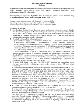 Prezydent Miasta Tarnowa Ogłasza IV przetarg ustny nieograniczony na sprzedaż prawa użytkowania wieczystego gruntu oraz prawa własności placu składu węgla oraz suwnicy bramowej położonych przy ul. Kochanowskiego 30 w Tarnowie. Przetarg odbędzie się w dniu 4 grudnia 2013 r. w budynku Urzędu Miasta Tarnowa, przy ul. Goldhammera 3, parter Sala Narad pok. nr 8 o godz. 1020. I przetarg ustny nieograniczony odbył się dnia 19 grudnia 2012 r. II przetarg ustny nieograniczony odbył się dnia 12 czerwca 2013 r. III przetarg ustny nieograniczony odbył się dnia 11 września 2013 r. Przedmiot przetargu : 1. Przysługujące Gminie Miasta Tarnowa prawo użytkowania wieczystego gruntu Skarbu Państwa położonego przy ul. Kochanowskiego 30, stanowiącego działkę nr 1/106 obrębu 247 o pow. 4760 m2 objętą księgą wieczystą TR1T/00132410/7 prowadzoną przez Sąd Rejonowy w Tarnowie ustanowione do dnia 4 grudnia 2089 r. oraz prawo własności placu składu węgla oraz suwnicy bramowej. 2. Opis budowli i urządzeń technologicznych: a. plac składowy węgla (o powierzchni 3000,6 m2) – obudowana niecka ziemna z utwardzoną nawierzchnią i odwodnieniem – ściany oporowe żelbetowe, prefabrykowane o wysokości do 4 m typu L, grubości 15/25 cm, nawierzchnia betonowa na podsypce filtracyjnej, drenaż odwodnienia D=150-200 (rury drenażowe ceramiczne i żeliwne), kanał betonowy odwodnienia o wym. zewn. 100*75 cm; 100*120 cm; 4*37 mb, warstwy filtracyjne; b. suwnica bramowa L = 48 m, z chwytakiem Q=5T, na podtorzu szynowym (bez zasilania energetycznego) - urządzenie aktualnie nie użytkowane, niesprawne, brak aktualnej UDT, wyrejestrowane, urządzenie wciągowe, udźwig 5 T, suwnica zewnętrzna kabinowa na podtorzu szynowym, konstrukcja stalowa z miejscami skorodowanymi, ciężar całkowity suwnicy 98,60 t, brak zasilania energetycznego, urządzenie do kapitalnego remontu, długość podtorza ~ 90 mb 3. W dziale I-SP księgi wieczystej TR1T/00132410/7 znajdują się następujące wpisy dotyczące uprawnienia wynikającego z prawa ujawnionego w dziale III innej księgi wieczystej: 1) każdoczesnym właścicielom, wieczystym użytkownikom i posiadaczom działek nr 73/7, 347/11, 347/13, obrębu 199 oraz działek nr 1/50, 1/56, 1/61, 1/62, 1/63, 1/64, 1/65, 1/67, 1/71, 1/72, 1/73, 1/74, 1/77, 1/79, 1/81, 1/82, 1/84, 1/87, 1/91, 1/99, 1/101, 1/102, 1/105, 1/106, 1/107, 1/108, 1/109 obrębu 247, przysługuje prawo bezpłatnej służebności przejazdu i przechodu przez prawo wieczystego użytkowania położonych w Tarnowie obrębu 247 działek nr 1/30, 1/36, 1/60, 1/100, 1/99, 1/90, 1/88, 1/95, 1/93, 1/83 i 156/7 stanowiących istniejące drogi oraz po działkach nr 1/92 i 1/89 stanowiących szlak kolejowy (tory kolejowe), oraz przez dz. 1/86 i 156/9 położonych w Tarnowie obr. 247 i nr 347/14 obr. 199 oraz przez dz. 347/7 i 347/12 obr. 199 stanowiących drogę - w drodze przeniesienia wpisu z KW TR1T/00032157/4 4. W dziale III księgi wieczystej TR1T/00132410/7 znajdują się wpis dotyczący ograniczonego prawa rzeczowego dla dz. 1/115 i 1/106 obr. 247: 1) służebność przesyłu polegająca na prawie umieszczenia przewodów służących do doprowadzenia energii elektrycznej i prawie posadowienia podtrzymującej te przewody estakady, przebiegającej w następujący sposób: - po działce nr 1/115 położonej w Tarnowie obr. 247, obj. tą księga wieczystą pasem szerokości 5 (pięć) metrów i długości 75 (siedemdziesiąt pięć) metrów we wschodnim (przygranicznym) pasie tej działki w kierunku z południa na północ, o powierzchni wynoszącej 265 m.kw. na wysokości co najmniej 5 (pięć) metrów od nawierzchni gruntu; - po działce 1/106 obr. 247 obj. tą księgą wieczystą w części południowej o kształcie trójkąta zajmującego powierzchnię 28 (dwadzieścia osiem) m.kw., na wysokości co najmniej 5 (pięć) metrów od nawierzchni gruntu; wraz z prawem dostępu do tych urządzeń w celu ich konserwacji, wymiany i demontażu, na rzecz spółki pod firmą Zakłady Mechaniczne „Tarnów” spółka akcyjna w Tarnowie 5. Na terenie obejmującym przedmiotową nieruchomość Gmina Miasta Tarnowa nie posiada miejscowego planu zagospodarowania przestrzennego. W studium uwarunkowań i Kierunków Zagospodarowania dla miasta Tarnowa uchwalonego Uchwałą Rady Miejskiej w Tarnowie nr XI/214/99 z dnia 15 lipca 1999 r. z późń. zm. działka nr 1/106 obrębu 247 zlokalizowana jest w terenie przemysłowym i składowym przekształcanym w kierunku czystych technologii i aktywizacji gospodarczej z udziałem usług. 6. Nieruchomość położona jest w terenie przemysłowym, na którym w przeszłości funkcjonowały Zakłady Mechaniczne w Tarnowie. Jest ona zlokalizowana w obszarze funkcjonalnym Strefy Aktywności Gospodarczej. Warunki przetargu: 1. Cena wywoławcza dla nieruchomości 357 500,00 zł (słownie: trzysta pięćdziesiąt siedem tysięcy pięćset złotych) w tym: wartość prawa użytkowania wieczystego gruntu – 184 065,70 zł; wartość budowli i urządzeń technologicznych – 173 434,30 zł (nieruchomość zwolniona z podatku od towarów i usług). W przetargu mogą brać udział osoby, które wpłacą wadium w pieniądzu w wysokości 53 700,00 zł (słownie: pięćdziesiąt trzy tysiące siedemset złotych) na konto Urzędu Miasta Tarnowa Bank Handlowy w Warszawie Oddział w Rzeszowie Nr 76 1030 1250 0000 0000 8800 0099 w taki sposób, aby najpóźniej w dniu 28 listopada 2013 roku wadium znajdowało się na rachunku bankowym organizującego przetarg ustny nieograniczony. Za dokonanie wpłaty uważa się dzień wpływu środków pieniężnych na rachunek bankowy tut. Urzędu. 2. Wadium wpłacone przez uczestników przetargu po zakończeniu przetargu zostanie niezwłocznie zwrócone na konto oferenta. 3. Wadium wpłacone przez uczestnika, który przetarg wygrał, zalicza się na poczet ceny nabycia nieruchomości. 4. Wadium wpłacone przez uczestnika, który przetarg wygra