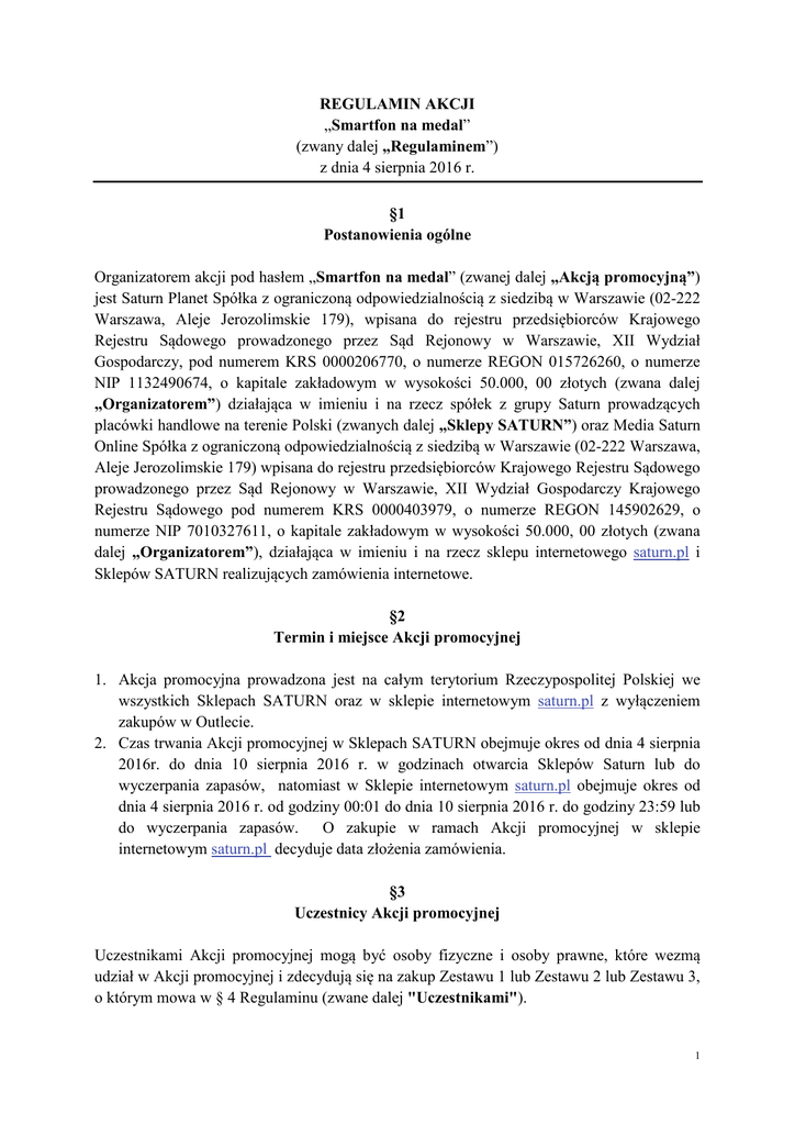 REGULAMIN AKCJI „Smartfon na medal” (zwany dalej „Regulaminem”) z dnia 4 sierpnia 2016 r. §1 Postanowienia ogólne Organizatorem akcji pod hasłem „Smartfon na medal” (zwanej dalej „Akcją promocyjną”) jest Saturn Planet Spółka z ograniczoną odpowiedzialnością z siedzibą w Warszawie (02-222 Warszawa, Aleje Jerozolimskie 179), wpisana do rejestru przedsiębiorców Krajowego Rejestru Sądowego prowadzonego przez Sąd Rejonowy w Warszawie, XII Wydział Gospodarczy, pod numerem KRS 0000206770, o numerze REGON 015726260, o numerze NIP 1132490674, o kapitale zakładowym w wysokości 50.000, 00 złotych (zwana dalej „Organizatorem”) działająca w imieniu i na rzecz spółek z grupy Saturn prowadzących placówki handlowe na terenie Polski (zwanych dalej „Sklepy SATURN”) oraz Media Saturn Online Spółka z ograniczoną odpowiedzialnością z siedzibą w Warszawie (02-222 Warszawa, Aleje Jerozolimskie 179) wpisana do rejestru przedsiębiorców Krajowego Rejestru Sądowego prowadzonego przez Sąd Rejonowy w Warszawie, XII Wydział Gospodarczy Krajowego Rejestru Sądowego pod numerem KRS 0000403979, o numerze REGON 145902629, o numerze NIP 7010327611, o kapitale zakładowym w wysokości 50.000, 00 złotych (zwana dalej „Organizatorem”), działająca w imieniu i na rzecz sklepu internetowego saturn.pl i Sklepów SATURN realizujących zamówienia internetowe. §2 Termin i miejsce Akcji promocyjnej 1. Akcja promocyjna prowadzona jest na całym terytorium Rzeczypospolitej Polskiej we wszystkich Sklepach SATURN oraz w sklepie internetowym saturn.pl z wyłączeniem zakupów w Outlecie. 2. Czas trwania Akcji promocyjnej w Sklepach SATURN obejmuje okres od dnia 4 sierpnia 2016r. do dnia 10 sierpnia 2016 r. w godzinach otwarcia Sklepów Saturn lub do wyczerpania zapasów, natomiast w Sklepie internetowym saturn.pl obejmuje okres od dnia 4 sierpnia 2016 r. od godziny 00:01 do dnia 10 sierpnia 2016 r. do godziny 23:59 lub do wyczerpania zapasów. O zakupie w ramach Akcji promocyjnej w sklepie internetowym saturn.pl decyduje data złożenia zamówienia. §3 Uczestnicy Akcji promocyjnej Uczestnikami Akcji promocyjnej mogą być osoby fizyczne i osoby prawne, które wezmą udział w Akcji promocyjnej i zdecydują się na zakup Zestawu 1 lub Zestawu 2 lub Zestawu 3, o którym mowa w § 4 Regulaminu (zwane dalej "Uczestnikami"). 1 §4 Zasady Akcji promocyjnej 1. Akcją promocyjną objęte są wszystkie smartfony, wszystkich marek (zwane dalej „Produktem głównym”) dostępne w ofercie Sklepów SATURN oraz w sklepie internetowym saturn.pl, których minimalna cena jednostkowa brutto wynosi PLN 500 (słownie: pięćset złotych) z zastrzeżeniem ust. 2. 2. Uczestnik, który w czasie trwania Akcji promocyjnej dokona zakupu Produktu głównego z oferty Sklepów SATURN oraz w Sklepie internetowym saturn.pl w przedziale cenowym (cena jednostkowa brutto): a) od PLN 500,00 do PLN 999,99 – uprawniony będzie do zakupu selfie stick marki Hama o numerze produktu 1302000 lub 1302001 (zwany dalej „Produktem dodatkowym 1”) w zestawie w promocyjnej cenie uwzględniającej rabat w wysokości wartości Produktu dodatkowego 1 (zwany dalej „Zestawem 1”), b) od PLN 1000,00 do PLN 1999,99 – uprawniony będzie do zakupu powerbank marki ISY o numerze produktu 1288755 (zwany dalej „Produktem dodatkowym 2”) w zestawie w promocyjnej cenie uwzględniającej rabat w wysokości wartości Produktu dodatkowego 2 (zwany dalej „Zestawem 2”), c) od PLN 2000,00 – uprawniony będzie do zakupu głośnika Bluetooth marki Creative o numerze produktu 1301962 (zwane dalej „Produktem dodatkowym 3”) w zestawie w promocyjnej cenie uwzględniającej rabat w wysokości wartości Produktu dodatkowego 3 (zwany dalej „Zestawem 3”). 3. Cena: • Zestawu 1 stanowi promocyjną cenę Produktu głównego i promocyjną cenę Produktu dodatkowego 1, • Zestawu 2 stanowi promocyjną cenę Produktu głównego i promocyjną cenę Produktu dodatkowego 2, • Zestawu 3 stanowi promocyjną cenę Produktu głównego i promocyjną cenę Produktu dodatkowego 3, 4. W przypadku zakupu w sklepie internetowym saturn.pl o zakupie Zestawu 1 lub Zestawu 2 lub Zestawu 3 w promocyjnej cenie decyduje data złożenia zamówienia. 5. Uczestnik może brać udział w Akcji promocyjnej wielokrotnie pod warunkiem spełnienia warunków przewidzianych w Regulaminie. 6. Organizator zastrzega, że Akcją promocyjną nie są objęte usługi kwalifikowane i niekwalifikowane (np.: Gwarancja Plus, Power Service, dostawa itp.) oraz sprzedaż biletów na imprezy masowe. 7. Uczestnikom nie przysługuje prawo do zastrzeżenia szczególnych cech Zestawu 1 lub Zestawu 2 lub Zestawu 3 objętych Akcją promocyjną. 2 8. Akcja promocyjna nie może być łączona z innymi akcjami promocyjnymi, rabatami i obniżkami cen, w tym kodami rabatowymi otrzymanymi w ramach programu Konto Plus. 9. Uczestnikom Akcji promocyjnej nie przysługuje prawo do otrzymania ekwiwalentu pieniężnego w wysokości Rabatu. §5 Odpowiedzialność 1. Odpowiedzialność Organizatora wobec Uczestnika z tytułu roszczeń związanych z uprawnieniami przyznanymi Uczestnikowi w Regulaminie ograniczona jest do wysokości ceny Zestawu 1 lub Zestawu 2 lub Zestawu 3 w trakcie Akcji promocyjnej, którego to roszczenie dotyczy. 2. Powyższe ograniczenie nie wyłącza uprawnień przyznanych Uczestnikom na mocy przepisów ustawy. §6 Reklamacje i wymiana towarów 1. Reklamacje dotyczące sposobu przeprowadzenia Akcji promocyjnej powinny być zgłaszane w trakcie trwania Akcji promocyjnej oraz przez 21 (dwadzieścia jeden) dni od jej zakończenia w Sklepie SATURN, w którym Uczestnik dokonał zakupu Zestawu 1 lub Zestawu 2 lub Zestawu 3 (w godzinach pracy) albo pod adresem e-mail: [email protected] z tematem wiadomości „Smartfon na medal” albo pod numerem Infolinii 799 37 37 37 * (* opłata zgodnie z taryfą operatora, Infolinia czynna w dni powszednie w godzinach 9:00 - 21:00