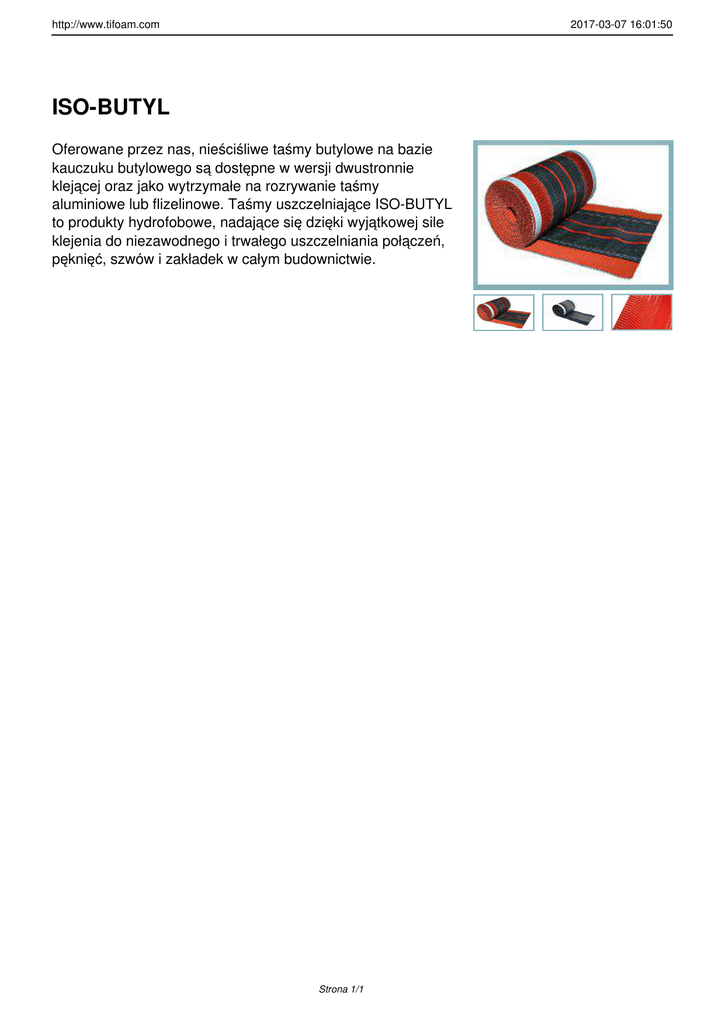 http://www.tifoam.com 2017-03-07 16:01:50 ISO-BUTYL Oferowane przez nas, nieściśliwe taśmy butylowe na bazie kauczuku butylowego są dostępne w wersji dwustronnie klejącej oraz jako wytrzymałe na rozrywanie taśmy aluminiowe lub flizelinowe. Taśmy uszczelniające ISO-BUTYL to produkty hydrofobowe, nadające się dzięki wyjątkowej sile klejenia do niezawodnego i trwałego uszczelniania połączeń, pęknięć, szwów i zakładek w całym budownictwie. Strona 1/1