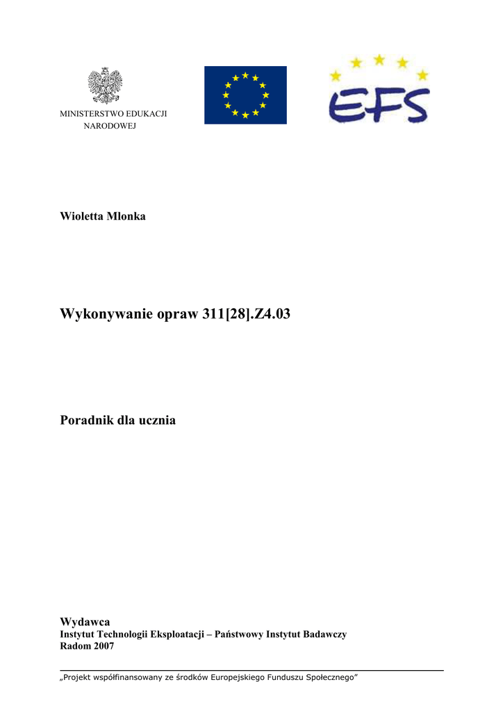 MINISTERSTWO EDUKACJI NARODOWEJ Wioletta Mlonka Wykonywanie opraw 311[28].Z4.03 Poradnik dla ucznia Wydawca Instytut Technologii Eksploatacji – Państwowy Instytut Badawczy Radom 2007 „Projekt współfinansowany ze środków Europejskiego Funduszu Społecznego” Recenzenci: mgr Krystyna Nowak-Wawszczak mgr Zbigniew Wolak Opracowanie redakcyjne: mgr ElŜbieta Gonciarz Konsultacja: dr inŜ. BoŜena Zając Poradnik stanowi obudowę dydaktyczną programu jednostki modułowej 311[28].Z4.03, „Wykonywanie opraw”, zawartego w modułowym programie dla zawodu technik poligraf. Wydawca Instytut Technologii Eksploatacji – Państwowy Instytut Badawczy, Radom 2007 „Projekt współfinansowany ze środków Europejskiego Funduszu Społecznego” 1 SPIS TREŚCI 1. 2. 3. 4. Wprowadzenie Wymagania wstępne Cele kształcenia Materiał nauczania 4.1. Kompletowanie wkładów 4.1.1.Materiał nauczania 4.1.2.Pytania sprawdzające 4.1.3.Ćwiczenia 4.1.4.Sprawdzian postępów 4.2. Łączenie składek i kartek we wkład 4.2.1. Materiał nauczania 4.2.2. Pytania sprawdzające 4.2.3. Ćwiczenia 4.2.4. Sprawdzian postępów 4.3. Obróbka wkładu 4.3.1.Materiał nauczania 4.3.2. Pytania sprawdzające 4.3.3. Ćwiczenia 4.3.4. Sprawdzian postępów 4.4. Typy opraw 4.4.1 Materiał nauczania 4.4.2. Pytania sprawdzające 4.4.3. Ćwiczenia 4.4.4. Sprawdzian postępów 5. Sprawdzian osiągnięć 6. Literatura 3 5 6 7 7 7 9 9 10 11 11 17 18 19 20 20 22 22 24 25 25 33 33 37 38 43 „Projekt współfinansowany ze środków Europejskiego Funduszu Społecznego” 2 1. WPROWADZENIE Poradnik ten będzie Ci pomocny w przyswajaniu wiedzy o oprawach introligatorskich i kształtowaniu umiejętności z tej dziedziny. Wiadomości i umiejętności z tego zakresu zostały określone w jednostce modułowej 311[28]Z4.03 Wykonywanie opraw. Jest to jednostka modułowa zawarta w module Procesy introligatorskie (schemat układu jednostek modułowych przedstawiony jest na stronie 4 tego poradnika). Tak jak kaŜda jednostka modułowa, równieŜ i ta ma ściśle określone cele kształcenia, materiał nauczania oraz wskazania metodyczne do realizacji programu. W poradniku znajdziesz: − wymagania wstępne – wykaz umiejętności, jakie powinieneś mieć juŜ ukształtowane, abyś bez problemów mógł korzystać z poradnika, − cele kształcenia – wykaz umiejętności, jakie ukształtujesz podczas pracy z poradnikiem, – materiał nauczania – wiadomości teoretyczne niezbędne do osiągnięcia załoŜonych celów kształcenia i opanowania umiejętności zawartych w jednostce modułowej, – zestaw pytań, abyś mógł sprawdzić, czy juŜ opanowałeś określone treści, – ćwiczenia, które pomogą Ci zweryfikować wiadomości teoretyczne oraz ukształtować umiejętności praktyczne, – sprawdzian postępów, – sprawdzian osiągnięć, jeden przykładowy zestaw zadań. Zaliczenie testu potwierdzi opanowanie materiału całej jednostki modułowej, – literaturę uzupełniającą. Treść programu jednostki modułowej zawiera podstawowe zagadnienia związane z wykonywaniem opraw introligatorskich na róŜnych etapach produkcji poligraficznej. Przed przystąpieniem do realizacji ćwiczeń odpowiedz na pytania sprawdzające, które są zamieszczone w kaŜdym rozdziale, po materiale nauczania. Udzielone odpowiedzi pozwolą Ci sprawdzić czy jesteś dobrze przygotowany do wykonywania zadań. Po zakończeniu realizacji programu tej jednostki modułowej nauczyciel sprawdzi Twoje wiadomości i umiejętności za pomocą testu pisemnego. Abyś miał moŜliwość dokonania ewaluacji swoich działań rozwiąŜ przykładowy test sumujący zamieszczony na końcu poniŜszego poradnika. „Projekt współfinansowany ze środków Europejskiego Funduszu Społecznego” 3 311[28].Z4 Procesy introligatorskie 311[28].Z4.02 Wykończanie produktów introligatorskich 311[28].Z4.01 Wykonywanie introligatorskich operacji jednostkowych 311[28].Z4.03 Wykonywanie opraw Schemat układu jednostek modułowych „Projekt współfinansowany ze środków Europejskiego Funduszu Społecznego” 4 2. WYMAGANIA WSTĘPNE – – – – – – – – – – – – – – Przystępując do realizacji programu jednostki modułowej powinieneś umieć: posługiwać się nazewnictwem i terminologią stosowaną w poligrafii, rozpoznawać podstawowe materiały i surowce poligraficzne, określać podstawowe szeregi i formaty wyrobów poligraficznych, klasyfikować procesy wykonywania opraw, korzystać z róŜnych źródeł informacji, posługiwać się dokumentacją technologiczną, przeliczać jednostki, określać zastosowanie maszyn i urządzeń introligatorskich, współpracować w grupie, uczestniczyć w dyskusji, oceniać swoje umiejętności, analizować i wyciągać wnioski, prezentować siebie i grupę, w której pracujesz, przestrzegać przepisów bezpieczeństwa i higieny pracy. „Projekt współfinansowany ze środków Europejskiego Funduszu Społecznego” 5 3. CELE KSZTAŁCENIA − − − − − − − − − − − − − − − − − − − − − − − − − − − − − − W wyniku realizacji programu jednostki modułowej powinieneś umieć: scharakteryzować metody kompletowania wkładów, określić zakres stosowania metody „składka na składkę” oraz metody „składka w składkę” scharakteryzować proces kontroli kompletowania wkładu, zastosować metody ręcznego i maszynowego kompletowania wkładów, scharakteryzować proces szycia drutem oraz określić uwarunkowania technologiczne procesu, wykonać szycie wkładu na maszynach do szycia drutem, scharakteryzować introligatorskie procesy szycia nićmi, scharakteryzować czynniki wpływające na wytrzymałość wkładów szytych nićmi, scharakteryzować proces klejowego łączenia wkładu, wykonać ręcznie klejowe łączenie wkładu, scharakteryzować proces łączenia składek nićmi termoplastycznymi, scharakteryzować specjalne połączenia stosowane do łąc