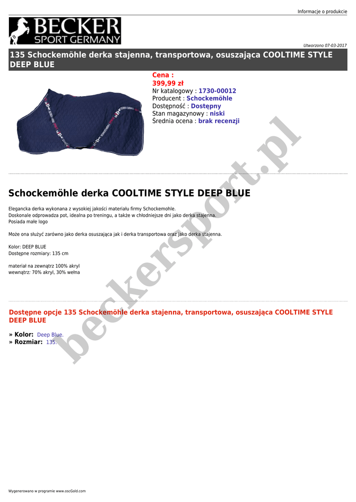 Informacje o produkcie Utworzono 07-03-2017 135 Schockemöhle derka stajenna, transportowa, osuszająca COOLTIME STYLE DEEP BLUE Cena : 399,99 zł or t. pl Nr katalogowy : 1730-00012 Producent : Schockemöhle Dostępność : Dostępny Stan magazynowy : niski Średnia ocena : brak recenzji Schockemöhle derka COOLTIME STYLE DEEP BLUE rs p Elegancka derka wykonana z wysokiej jakości materiału firmy Schockemohle. Doskonale odprowadza pot, idealna po treningu, a także w chłodniejsze dni jako derka stajenna. Posiada małe logo Może ona służyć zarówno jako derka osuszająca jak i derka transportowa oraz jako derka stajenna. materiał na zewnątrz 100% akryl wewnątrz: 70% akryl, 30% wełna ke Kolor: DEEP BLUE Dostępne rozmiary: 135 cm be c Dostępne opcje 135 Schockemöhle derka stajenna, transportowa, osuszająca COOLTIME STYLE DEEP BLUE » Kolor: Deep Blue. » Rozmiar: 135. Wygenerowano w programie www.oscGold.com