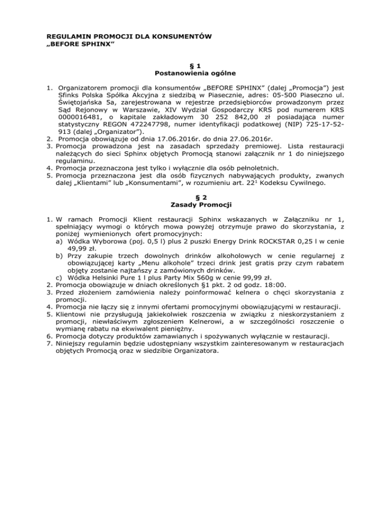REGULAMIN PROMOCJI DLA KONSUMENTÓW „BEFORE SPHINX” §1 Postanowienia ogólne 1. Organizatorem promocji dla konsumentów „BEFORE SPHINX” (dalej „Promocja”) jest Sfinks Polska Spółka Akcyjna z siedzibą w Piasecznie, adres: 05-500 Piaseczno ul. Świętojańska 5a, zarejestrowana w rejestrze przedsiębiorców prowadzonym przez Sąd Rejonowy w Warszawie, XIV Wydział Gospodarczy KRS pod numerem KRS 0000016481, o kapitale zakładowym 30 252 842,00 zł posiadająca numer statystyczny REGON 472247798, numer identyfikacji podatkowej (NIP) 725-17-52913 (dalej „Organizator”). 2. Promocja obowiązuje od dnia 17.06.2016r. do dnia 27.06.2016r. 3. Promocja prowadzona jest na zasadach sprzedaży premiowej. Lista restauracji należących do sieci Sphinx objętych Promocją stanowi załącznik nr 1 do niniejszego regulaminu. 4. Promocja przeznaczona jest tylko i wyłącznie dla osób pełnoletnich. 5. Promocja przeznaczona jest dla osób fizycznych nabywających produkty, zwanych dalej „Klientami” lub „Konsumentami”, w rozumieniu art. 221 Kodeksu Cywilnego. §2 Zasady Promocji 1. W ramach Promocji Klient restauracji Sphinx wskazanych w Załączniku nr 1, spełniający wymogi o których mowa powyżej otrzymuje prawo do skorzystania, z poniżej wymienionych ofert promocyjnych: a) Wódka Wyborowa (poj. 0,5 l) plus 2 puszki Energy Drink ROCKSTAR 0,25 l w cenie 49,99 zł. b) Przy zakupie trzech dowolnych drinków alkoholowych w cenie regularnej z obowiązującej karty „Menu alkohole” trzeci drink jest gratis przy czym rabatem objęty zostanie najtańszy z zamówionych drinków. c) Wódka Helsinki Pure 1 l plus Party Mix 560g w cenie 99,99 zł. 2. Promocja obowiązuje w dniach określonych §1 pkt. 2 od godz. 18:00. 3. Przed złożeniem zamówienia należy poinformować kelnera o chęci skorzystania z promocji. 4. Promocja nie łączy się z innymi ofertami promocyjnymi obowiązującymi w restauracji. 5. Klientowi nie przysługują jakiekolwiek roszczenia w związku z nieskorzystaniem z promocji, niewłaściwym zgłoszeniem Kelnerowi, a w szczególności roszczenie o wymianę rabatu na ekwiwalent pieniężny. 6. Promocja dotyczy produktów zamawianych i spożywanych wyłącznie w restauracji. 7. Niniejszy regulamin będzie udostępniany wszystkim zainteresowanym w restauracjach objętych Promocją oraz w siedzibie Organizatora. Załącznik nr 1, Lista restauracji Sphinx objętych promocją RESTAURACJA Białogard CH Hosso Białystok Alfa Bydgoszcz Bydgoszcz CH Zielone Arkady Bytom Częstochowa Gdańsk CH Madisson Gdańsk CH Manhattan Gdańsk CH Matarnia Gdańsk Długi Targ Gdynia CH Batory Gniezno Gorzów Wielkopolski CH Askana Gorzów Wielkopolski Nova Park Gryfice CH Hosso Jastarnia Kalisz Katowice CH Silesia Katowice Korfantego Kielce CH Korona Kielce Sienkiewicza Kołobrzeg CH Hosso Konin Kraków CH Bonarka Koszalin CH Forum Kraków CH Auchan Bronowice Kraków Galeria Krakowska Kraków Grodzka Kraków Rynek Lublin CH Plaza Lublin CH Tarasy Zamkowe Łódź CH Manufaktura SF Łódź Piotrkowska 250 Łódź Piotrkowska 93 Malbork Olsztyn Poznań CH City Center Poznań CH Stary Browar Poznań Św. Marcin Rybnik Rynek Rzeszów CH Galeria Rzeszów Rzeszów Kościuszki Siedlce Sopot Starogard Gdański ADRES 78-200 Białogard, Pl. Wolności 10A 15-277 Białystok, ul. Świętojańska 15 85-111 Bydgoszcz, ul. Magdzińskiego 18 85-171 Bydgoszcz, Al. Wojska Polskiego 1 41-902 Bytom, ul. Moniuszki 11 42-200 Częstochowa, Al. Kościuszki 1 80-850 Gdańsk, ul. Rajska 10 80-252 Gdańsk-Wrzeszcz, ul. Grunwaldzka 82, "MANHATTAN" 80-298 Gdańsk, ul. Złota Karczma 26/19 80-830 Gdańsk, Długi Targ 31/32 81-301 Gdynia, ul. 10 Lutego 11 62-200 Gniezno, ul. Rynek 7 66-400 Gorzów Wielkopolski, Al. Konstytucji 3-go Maja 102 66-400 Gorzów Wielkopolski ul. Przemysłowa 2 78-300 Gryfice, ul. Wojska Polskiego 44 84-140 Jastarnia, ul. Nad Zatoką 2 62-800 Kalisz, ul. Śródmiejska 16 40-101 Katowice, ul. Chorzowska 107 40-005 Katowice, al. Wojciecha Korfantego 5 25-312 Kielce, ul. Warszawska 26, 25-501 Kielce, ul. Sienkiewicza 48/50 78-100 Kołobrzeg, Plac Ratuszowy 3 62-510 Konin, ul. Chopina 15F 30-644 Kraków, ul. Kamieńskiego 11 75-736 Koszalin, ul. Paderewskiego 1 31-346 Kraków, ul. Stawowa 61 31-154 Kraków, ul Pawia 5 31-006 Kraków, ul. Grodzka 9 31-008 Kraków, ul. Rynek Główny 25 20-020 Lublin, ul. Lipowa 13 20-108 Lublin, Al. Unii Lubelskiej 2 91-002 Łódź, ul. Drewnowska 58 90-360 Łódź, ul. Piotrkowska 242/250 90-423 Łódź, ul. Piotrkowska 93 82-200 Malbork, ul. Piastowska 3 10-017 Olsztyn, ul. Staromiejska 15 61-818 Poznań, ul. Stanisława Matyji 2 61-888 Poznań, Półwiejska 32 60-807 Poznań, ul. Św. Marcin 66/72 44-200 Rybnik, ul. Rynek 3 35-001 Rzeszów, ul. Piłsudskiego 44 35-030 Rzeszów, Al. Kościuszki 9 08-110 Siedlce; ul. Rynkowa 24 81-704 Sopot, ul. Dworcowa 7 83-200 Starogard Gdański, ul. Rynek 6 Stargard Szczeciński CH Starówka Szczecin CH Kaskada Szczecinek Galeria Hosso Świnoujście Toruń Warszawa Aleje Jerozolimskie SF Warszawa CH Janki Warszawa CH Promenada Warszawa CH Złote Tarasy Warszawa Galeria Mokotów Warszawa Multikino K.E.N. Warszawa Nowy Świat Warszawa Pl. Bankowy Warszawa Szpitalna Warszawa Wesoła Warszawa Wilanów Wrocław CH Futura Park Wrocław Rynek Zakopane Zgierz Zgorzelec CH Eden Zielona Góra Stary Rynek 73-110 Stargard Szczeciński, ul. B. Chrobrego 8 70-404 Szczecin, Al. Niepodległości 36 78-400 Szczecinek, ul. Bohaterów Warszawy 6 72-600 Świnoujście, ul. Jana Kasprowicza 2 87-100 Toruń, ul. Żeglarska 31 00-024 Warszawa, Al. Jerozolimskie 42 05-090 Janki k/W-wy, ul. Mszczonowska 3, "JANKI" 04-175 Warszawa, ul. Ostrobramska 75C 00-120 Warszawa, ul. Złota 59 "ZŁOTE TARASY" 02-675 Warszawa, ul. Wołoska 12 02-777 Warszawa, Al. Komisji Edukacji Narodowej 60 00-363 Warszawa, ul. Nowy Świat 40 00-095 Warszawa, Pl. Bankowy 2 00-020 Warszawa, ul. Szpitalna 1 05-077 Warszawa, ul. Trakt Brzeski 60B 02-950 Warszawa, ul. St. Kostki P