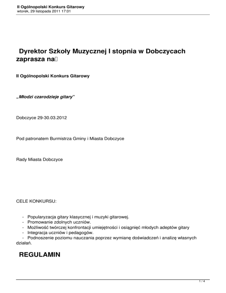 II Ogólnopolski Konkurs Gitarowy wtorek, 29 listopada 2011 17:01 Dyrektor Szkoły Muzycznej I stopnia w Dobczycach zaprasza na II Ogólnopolski Konkurs Gitarowy „Młodzi czarodzieje gitary” Dobczyce 29-30.03.2012 Pod patronatem Burmistrza Gminy i Miasta Dobczyce Rady Miasta Dobczyce CELE KONKURSU: - Popularyzacja gitary klasycznej i muzyki gitarowej. - Promowanie zdolnych uczniów. - Możliwość twórczej konfrontacji umiejętności i osiągnięć młodych adeptów gitary - Integracja uczniów i pedagogów. - Podnoszenie poziomu nauczania poprzez wymianę doświadczeń i analizę własnych działań. REGULAMIN 1/4 II Ogólnopolski Konkurs Gitarowy wtorek, 29 listopada 2011 17:01 1. Konkurs w każdej kategorii jest jednoetapowy i otwarty dla publiczności. 2. Konkurs jest przeznaczony dla uczniów szkół publicznych pierwszego stopnia oraz szkół niepublicznych, realizujących program publicznych szkół muzycznych pierwszego stopnia, który odbywać się będzie w trzech grupach wiekowych: GRUPA I uczniowie klas I i II cyklu sześcioletniego oraz klasy I cyklu czteroletniego GRUPA II uczniowie klas III i IV cyklu sześcioletniego oraz klasy II cyklu czteroletniego GRUPA III uczniowie klas V i VI cyklu sześcioletniego oraz klasy III i IV cyklu czteroletniego GRUPA IV zespoły gitarowe (wyłącznie uczniowie szkoły muzycznej I stopnia) 1. Kolejność wykonywanych utworów jest dowolna. 2. Uczestnicy występują w porządku alfabetycznym rozpoczynając od litery wyłonionej drogą losowania, po wpłynięciu wszystkich zgłoszeń. 3. Formularz zgłoszeniowy prosimy przesłać na adres: Szkoła Muzyczna I stopnia w Dobczycach, ul. Rynek 22A, 32-410 Dobczyce. 4. Wpisowe w kwocie 80 złotych należy wpłacić na konto RADY RODZICÓW Szkoły Muzycznej w Dobczycach do dnia 15 marca 2012 r. z dopiskiem „konkurs gitarowy”(decyduje data stempla pocztowego). NR konta: 10 8602 0000 0000 0262 7980 0002 1. W razie rezygnacji kandydata wpisowe nie podlega zwrotowi. 2. Decyzje jury są ostateczne. 3. Program konkursu należy wykonać z pamięci. 10. Wszyscy uczestnicy konkursu otrzymują dyplom uczestnictwa, a laureaci nagrody i wyróżnienia. Wyróżniająca się osobowość konkursowa otrzyma specjalną nagrodę i tytuł odego Arcymistrza Gitary Mł 2/4 II Ogólnopolski Konkurs Gitarowy wtorek, 29 listopada 2011 17:01 11. Koszt przejazdu, wyżywienia i zakwaterowania pokrywają uczestnicy lub szkoły delegujące. 12. Zbiorcza punktacja konkursowa będzie przesłana do szkół po zakończeniu konkursu. 13. Wszystkie informacje dotyczące programu konkursowego, regulaminu oraz materiały nutowe znajdą Państwo na stronie internetowej: www.szkolamuzyczna.dobczyce.pl Szczegółowy program przesłuchań konkursowych dla poszczególnych grup: GRUPA I - Utwór obowiązkowy – Nap. Coste Rondeau op.51 nr 6 (nie jest wymagana realizacja wszystkich znaków repetycji ) - Utwór lub utwory dowolne Czas trwania występu 4-5 min. GRUPA II - Etiuda obowiązkowa - Mauro Giuliani Etiuda op. 139 nr 6 - Utwór z muzyki dawnej - Utwór lub utwory dowolne -jeżeli program obowiązkowy nie wypełni regulaminowego czasu Czas trwania występu 7-8 min. 3/4 II Ogólnopolski Konkurs Gitarowy wtorek, 29 listopada 2011 17:01 GRUPA III - Etiuda obowiązkowa - Mauro Giuliani Etiuda op.48 nr 8 - Utwór liryczny o charakterze kantylenowym - Utwór w formie wariacji, ronda, jedna część sonaty lub sonatiny - Utwór lub utwory dowolne w przypadku – jeżeli program obowiązkowy nie wypełni regulaminowego czasu. Czas trwania występu: 9-10 min. GRUPA IV - Program dowolny. Czas trwania występu 7-10 min. W sprawach obowiązkowego programu i materiałów nutowych proszę kontaktować się z: Jadwigą Wołek tel. komórkowy 603-649-336 E- mail: [email protected] Informacji w kwestiach organizacyjnych udziela sekretariat Szkoły Muzycznej pod nr.: (12) 274-20-78 E-mail : [email protected] 4/4