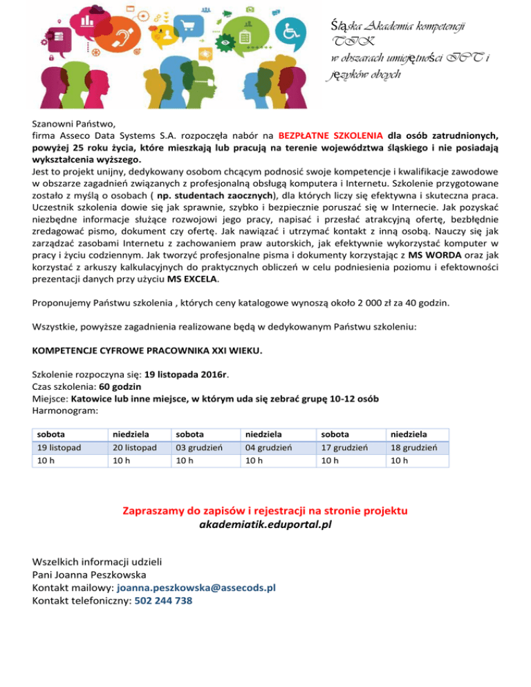 Śląska Akademia kompetencji TIK w obszarach umiejętności ICT i języków obcych Szanowni Państwo, firma Asseco Data Systems S.A. rozpoczęła nabór na BEZPŁATNE SZKOLENIA dla osób zatrudnionych, powyżej 25 roku życia, które mieszkają lub pracują na terenie województwa śląskiego i nie posiadają wykształcenia wyższego. Jest to projekt unijny, dedykowany osobom chcącym podnosić swoje kompetencje i kwalifikacje zawodowe w obszarze zagadnień związanych z profesjonalną obsługą komputera i Internetu. Szkolenie przygotowane zostało z myślą o osobach ( np. studentach zaocznych), dla których liczy się efektywna i skuteczna praca. Uczestnik szkolenia dowie się jak sprawnie, szybko i bezpiecznie poruszać się w Internecie. Jak pozyskać niezbędne informacje służące rozwojowi jego pracy, napisać i przesłać atrakcyjną ofertę, bezbłędnie zredagować pismo, dokument czy ofertę. Jak nawiązać i utrzymać kontakt z inną osobą. Nauczy się jak zarządzać zasobami Internetu z zachowaniem praw autorskich, jak efektywnie wykorzystać komputer w pracy i życiu codziennym. Jak tworzyć profesjonalne pisma i dokumenty korzystając z MS WORDA oraz jak korzystać z arkuszy kalkulacyjnych do praktycznych obliczeń w celu podniesienia poziomu i efektowności prezentacji danych przy użyciu MS EXCELA. Proponujemy Państwu szkolenia , których ceny katalogowe wynoszą około 2 000 zł za 40 godzin. Wszystkie, powyższe zagadnienia realizowane będą w dedykowanym Państwu szkoleniu: KOMPETENCJE CYFROWE PRACOWNIKA XXI WIEKU. Szkolenie rozpoczyna się: 19 listopada 2016r. Czas szkolenia: 60 godzin Miejsce: Katowice lub inne miejsce, w którym uda się zebrać grupę 10-12 osób Harmonogram: sobota 19 listopad 10 h niedziela 20 listopad 10 h sobota 03 grudzień 10 h niedziela 04 grudzień 10 h sobota 17 grudzień 10 h niedziela 18 grudzień 10 h Zapraszamy do zapisów i rejestracji na stronie projektu akademiatik.eduportal.pl Wszelkich informacji udzieli Pani Joanna Peszkowska Kontakt mailowy: [email protected] Kontakt telefoniczny: 502 244 738