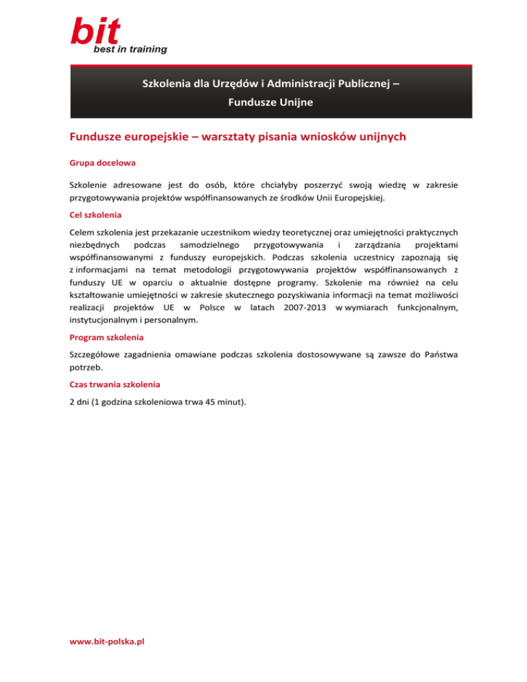 Szkolenia dla Urzędów i Administracji Publicznej – Fundusze Unijne Fundusze europejskie – warsztaty pisania wniosków unijnych Grupa docelowa Szkolenie adresowane jest do osób, które chciałyby poszerzyd swoją wiedzę w zakresie przygotowywania projektów współfinansowanych ze środków Unii Europejskiej. Cel szkolenia Celem szkolenia jest przekazanie uczestnikom wiedzy teoretycznej oraz umiejętności praktycznych niezbędnych podczas samodzielnego przygotowywania i zarządzania projektami współfinansowanymi z funduszy europejskich. Podczas szkolenia uczestnicy zapoznają się z informacjami na temat metodologii przygotowywania projektów współfinansowanych z funduszy UE w oparciu o aktualnie dostępne programy. Szkolenie ma również na celu kształtowanie umiejętności w zakresie skutecznego pozyskiwania informacji na temat możliwości realizacji projektów UE w Polsce w latach 2007-2013 w wymiarach funkcjonalnym, instytucjonalnym i personalnym. Program szkolenia Szczegółowe zagadnienia omawiane podczas szkolenia dostosowywane są zawsze do Paostwa potrzeb. Czas trwania szkolenia 2 dni (1 godzina szkoleniowa trwa 45 minut). www.bit-polska.pl