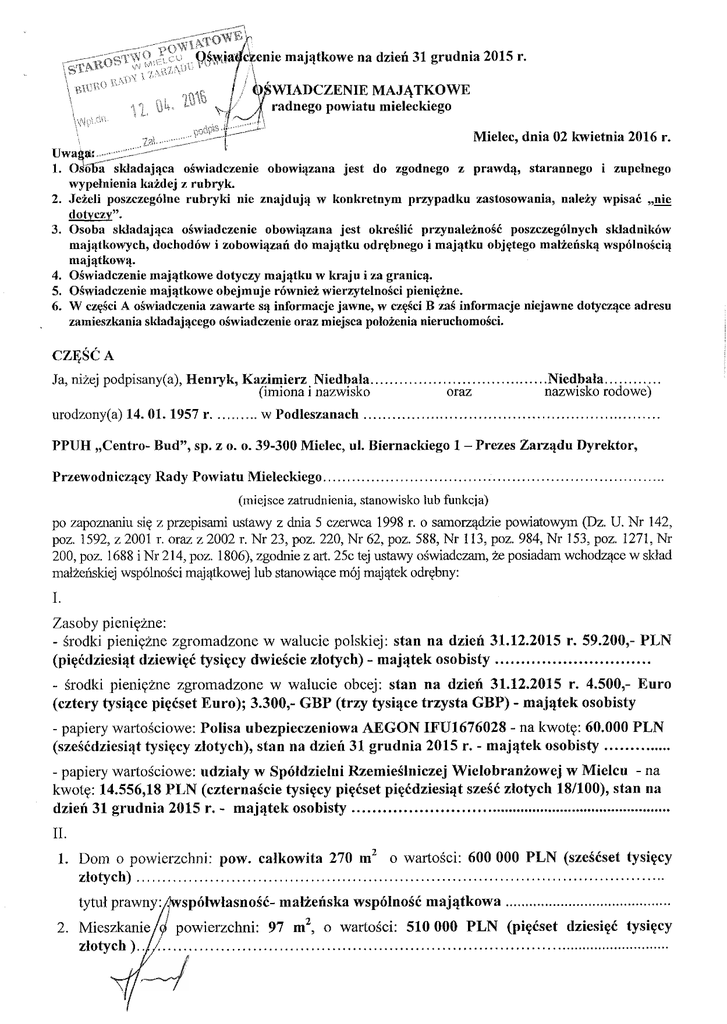 B : \ B \ \\NB'on' v- ()świa|lczenie majątkowe na dzień 31 grudnia 2015 r. / Ś w iad c zen ie m a ją tk o w e radnego powiatu mieleckiego V] 1,1 m ....V Mielec, dnia 02 kwietnia 2016 r. 1. Osoba składająca oświadczenie obowiązana jest do zgodnego z prawdą, starannego i zupełnego wypełnienia każdej z rubryk. 2. Jeżeli poszczególne rubryki nie znajdują w konkretnym przypadku zastosowania, należy wpisać „nie dotyczy”. 3. Osoba składająca oświadczenie obowiązana jest określić przynależność poszczególnych składników majątkowych, dochodów i zobowiązań do majątku odrębnego i majątku objętego małżeńską wspólnością majątkową. 4. Oświadczenie majątkowe dotyczy majątku w kraju i za granicą. 5. Oświadczenie majątkowe obejmuje również wierzytelności pieniężne. 6. W części A oświadczenia zawarte są informacje jawne, w części B zaś informacje niejawne dotyczące adresu zamieszkania składającego oświadczenie oraz miejsca położenia nieruchomości. CZĘŚĆ A Ja, niżej podpisany(a), Henryk, Kazimierz Niedbała............................................ Niedbała........... (imiona i nazwisko oraz nazwisko rodowe) urodzony(a) 14. 0 1 .1 9 5 7 r ............. w P o d lesza n a ch ......................................................................................... PP1JH „Centro- B ud”, sp. z o. o. 39-300 M ielec, ul. Biernackiego 1 - Prezes Zarządu Dyrektor, Przewodniczący Rady Pow iatu M ieleckiego.................................................... ...................................................... (miejsce zatrudnienia, stanowisko lub funkcja) po zapoznaniu się z przepisami ustawy z dnia 5 czerwca 1998 r. o samorządzie powiatowym (Dz. U. Nr 142, poz. 1592, z 2001 r. oraz z 2002 r. Nr 23, poz. 220, Nr 62, poz. 588, Nr 113, poz. 984, Nr 153, poz. 1271, Nr 200, poz. 1688 i Nr 214, poz. 1806), zgodnie z art. 25c tej ustawy oświadczam, że posiadam wchodzące w skład małżeńskiej wspólności majątkowej lub stanowiące mój majątek odrębny: I. Zasoby pieniężne: - środki pieniężne zgrom adzone w w alucie polskiej: stan na dzień 31.12.2015 r. 59.200,- PLN (pięćdziesiąt dziewięć tysięcy dwieście złotych) - majątek osobisty....................................... - środki pieniężne zgrom adzone w w alucie obcej: stan na dzień 31.12.2015 r. 4.500,- Euro (cztery tysiące pięćset Euro); 3.300,- GBP (trzy tysiące trzysta GBP) - majątek osobisty - papiery w artościow e: Polisa ubezpieczeniowa A E G O N IFU1676028 - na kw otę: 60.000 PLN (sześćdziesiąt tysięcy złotych), stan na dzień 31 grudnia 2015 r. - majątek osobisty................ - papiery w artościow e: udziały w Spółdzielni Rzemieślniczej Wielobranżowej w Mielcu - na kw otę: 14.556,18 PLN (czternaście tysięcy pięćset pięćdziesiąt sześć złotych 18/100), stan na dzień 31 grudnia 2015 r. - majątek osobisty................................................................................ II. 1. D om o pow ierzchni: pow. całkowita 270 m2 o w artości: 600 000 PLN (sześćset tysięcy złotych)..................................................................................................................................... tytuł praw ny: ^współwłasność- małżeńska wspólność majątkowa......................................... 2. M ieszkanie id pow ierzchni: 97 m2, o w artości: 510 000 PLN (pięćset dziesięć tysięcy złotych) . . / / ............................................................................................................................... tytuł praw ny: własność - majątek osobisty.............................................................................. 3. Gospodarstwo rolne: rodzaj gospodarstw a: N IE D O T Y C Z Y pow ierzchnia: N IE D O T Y C Z Y ....................................... o w artości: N IE D O T Y C Z Y ........................................................................................................................ rodzaj zabudow y: N IE D O T Y C Z Y ........................................................................................................... tytuł praw ny: N IE D O T Y C Z Y .................................................................................................................. Z tego tytułu osiągnąłem w okresie od 01.01.2015 do 31.12.2015 roku przychód i dochód w wysokości: N IE D O T Y C Z Y ............................................................................................................................................. 4. Inne nieruchomości: pow ierzchnia: a) działka nr 1691 zabudowana domem rodzinnym z poz. II. pkt. 1 0 pow. 723 m2............................................................................................................................. b) lokal niemieszkalny » 1/16 udziału w garażu wielostanowiskowym o pow. 792 m2 1 związany z tym udział w wysokości 1/16 z 684/10.000 udziału w nieruchomości gruntowej o pow. 0,6902 ha,..................................................................................................... c) udział w wysokości 83/10.000 w nieruchomości wspólnej związanej z własnością mieszkania wymienionego w poz. II pkt. 2 o pow. 0,6902 h a ,.............................................. o w artości: a) - 100 000 PLN, b) 45 000 PLN, c) 45 000 PL N ,.............................................. tytuł praw ny: a) w spółw łasność - małżeńska w spólność m ajątkowa, b), c) w łasność -m ajątek osobisty III. 1. Posiadam udziały w spółkach handlowych z udziałem powiatowych osób prawnych lub przedsiębiorców, w których uczestniczą takie osoby - należy podać liczbę i emitenta udziałów: NIE DOTYCZY........................................................................................................................ udziały te stanowią pakiet większy niż 10% udziałów w spółce: NIE DOTYCZY......................................
