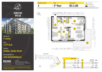 Number of rooms Floor Catalogue N° 4 3 floor B5.3.100 rd 2 3 2,70 m - Heigh of room Removable walls Non-removable walls 4 1 5 7 6 Apartment: 4-rooms Area: 8 77,74 sq.m. Location: See investment on: i o śn ie S tree t This brochure does not constitute an offer in the understanding of the Civil Code regulations. Presented visualizations and projections are of strictly demonstrative nature. During realization some details may undergo alteration. Area - 77,74 sq.m. 1 Hall 11,83 5 Living room + kitchenette 2 Toilet 2,05 6 Room 9,71 3 Bathroom 4,4 7 Room 12,82 4 Room 11,07 8 Balcony e dw Sale Office: Krasickiego Street 30, 30-503 Kraków phone: +48 12 637 81 18, +48 664 900 414 [email protected] Spiska Street Pr z www.dompodwilga.pl Orawska Street Kraków, Spiska Street 25,86 20,6