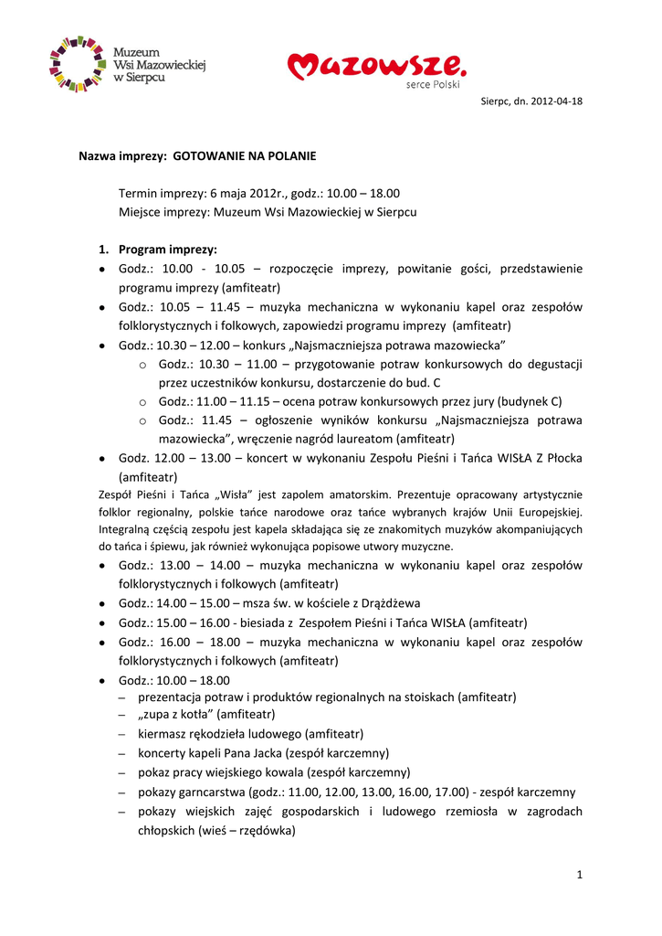 Sierpc, dn. 2012-04-18 Nazwa imprezy: GOTOWANIE NA POLANIE Termin imprezy: 6 maja 2012r., godz.: 10.00 – 18.00 Miejsce imprezy: Muzeum Wsi Mazowieckiej w Sierpcu 1. Program imprezy: Godz.: 10.00 - 10.05 – rozpoczęcie imprezy, powitanie gości, przedstawienie programu imprezy (amfiteatr) Godz.: 10.05 – 11.45 – muzyka mechaniczna w wykonaniu kapel oraz zespołów folklorystycznych i folkowych, zapowiedzi programu imprezy (amfiteatr) Godz.: 10.30 – 12.00 – konkurs „Najsmaczniejsza potrawa mazowiecka” o Godz.: 10.30 – 11.00 – przygotowanie potraw konkursowych do degustacji przez uczestników konkursu, dostarczenie do bud. C o Godz.: 11.00 – 11.15 – ocena potraw konkursowych przez jury (budynek C) o Godz.: 11.45 – ogłoszenie wyników konkursu „Najsmaczniejsza potrawa mazowiecka”, wręczenie nagród laureatom (amfiteatr) Godz. 12.00 – 13.00 – koncert w wykonaniu Zespołu Pieśni i Taoca WISŁA Z Płocka (amfiteatr) Zespół Pieśni i Taoca „Wisła” jest zapolem amatorskim. Prezentuje opracowany artystycznie folklor regionalny, polskie taoce narodowe oraz taoce wybranych krajów Unii Europejskiej. Integralną częścią zespołu jest kapela składająca się ze znakomitych muzyków akompaniujących do taoca i śpiewu, jak również wykonująca popisowe utwory muzyczne. Godz.: 13.00 – 14.00 – muzyka mechaniczna w wykonaniu kapel oraz zespołów folklorystycznych i folkowych (amfiteatr) Godz.: 14.00 – 15.00 – msza św. w kościele z Drążdżewa Godz.: 15.00 – 16.00 - biesiada z Zespołem Pieśni i Taoca WISŁA (amfiteatr) Godz.: 16.00 – 18.00 – muzyka mechaniczna w wykonaniu kapel oraz zespołów folklorystycznych i folkowych (amfiteatr) Godz.: 10.00 – 18.00 prezentacja potraw i produktów regionalnych na stoiskach (amfiteatr) „zupa z kotła” (amfiteatr) kiermasz rękodzieła ludowego (amfiteatr) koncerty kapeli Pana Jacka (zespół karczemny) pokaz pracy wiejskiego kowala (zespół karczemny) pokazy garncarstwa (godz.: 11.00, 12.00, 13.00, 16.00, 17.00) - zespół karczemny pokazy wiejskich zajęd gospodarskich i ludowego rzemiosła w zagrodach chłopskich (wieś – rzędówka) 1 ognisko na polanie (polana - ognisko) przejażdżki bryczką po terenie ekspozycji przejażdżki w siodle Pokazy wiejskich zajęć gospodarskich Zagroda z Rempina – pokaz tkania na krosnach Zagroda z Izdebna – pokaz tradycyjnego wyrobu masła, degustacja świeżo ubitego masła z wiejskim chlebem Zagroda z Czermna – pokaz papieroplastyki – pająki słomiane Zagroda z Zawad – pokaz przędzenia wełny na kołowrotku Zagroda z Ostrowa – lekcje kaligrafii w wiejskiej izbie szkolnej Zagroda z Dzierzążni – pokaz kręcenia powrozów za pomocą kołowrotka powroźniczego (możliwośd wypożyczenia stroju i udziału w pokazie przez zwiedzających) Zagroda z Ligówka – pokaz prania i maglowania bielizny, pokaz pracy wiejskiego plecionkarza Chałupa z Jonnego – pokaz wirowania śmietany za pomocą centryfugi Chałupa z Chwał - pokaz pracy wiejskiego szewca Zagroda z Rębowa – pokaz mielenia kaszy młynkiem napędzanym kieratem 2. Partner imprezy: 3. Patronat medialny: Kurier Sierpecki, Tygodnik Płocki, Gazeta Chłopska, RDC 2
