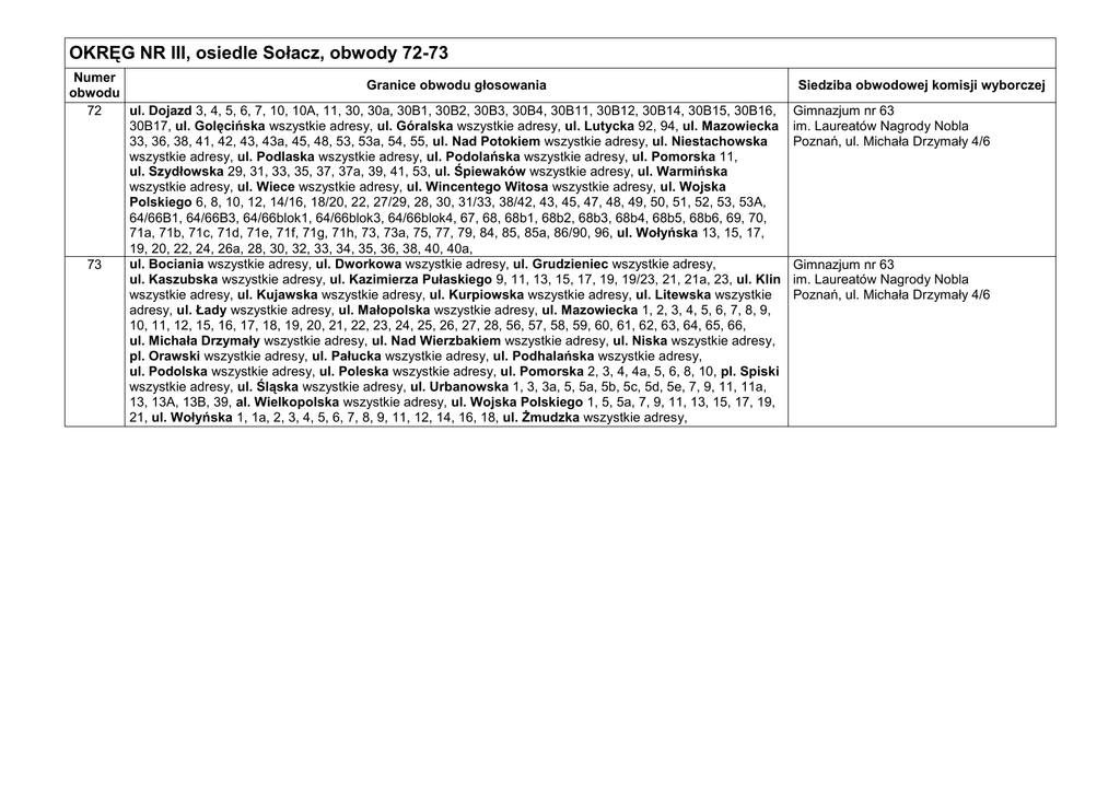 OKRĘG NR III, osiedle Sołacz, obwody 72-73 Numer Granice obwodu głosowania obwodu ul. Dojazd 3, 4, 5, 6, 7, 10, 10A, 11, 30, 30a, 30B1, 30B2, 30B3, 30B4, 30B11, 30B12, 30B14, 30B15, 30B16, 72 30B17, ul. Golęcińska wszystkie adresy, ul. Góralska wszystkie adresy, ul. Lutycka 92, 94, ul. Mazowiecka 33, 36, 38, 41, 42, 43, 43a, 45, 48, 53, 53a, 54, 55, ul. Nad Potokiem wszystkie adresy, ul. Niestachowska wszystkie adresy, ul. Podlaska wszystkie adresy, ul. Podolańska wszystkie adresy, ul. Pomorska 11, ul. Szydłowska 29, 31, 33, 35, 37, 37a, 39, 41, 53, ul. Śpiewaków wszystkie adresy, ul. Warmińska wszystkie adresy, ul. Wiece wszystkie adresy, ul. Wincentego Witosa wszystkie adresy, ul. Wojska Polskiego 6, 8, 10, 12, 14/16, 18/20, 22, 27/29, 28, 30, 31/33, 38/42, 43, 45, 47, 48, 49, 50, 51, 52, 53, 53A, 64/66B1, 64/66B3, 64/66blok1, 64/66blok3, 64/66blok4, 67, 68, 68b1, 68b2, 68b3, 68b4, 68b5, 68b6, 69, 70, 71a, 71b, 71c, 71d, 71e, 71f, 71g, 71h, 73, 73a, 75, 77, 79, 84, 85, 85a, 86/90, 96, ul. Wołyńska 13, 15, 17, 19, 20, 22, 24, 26a, 28, 30, 32, 33, 34, 35, 36, 38, 40, 40a, ul. Bociania wszystkie adresy, ul. Dworkowa wszystkie adresy, ul. Grudzieniec wszystkie adresy, 73 ul. Kaszubska wszystkie adresy, ul. Kazimierza Pułaskiego 9, 11, 13, 15, 17, 19, 19/23, 21, 21a, 23, ul. Klin wszystkie adresy, ul. Kujawska wszystkie adresy, ul. Kurpiowska wszystkie adresy, ul. Litewska wszystkie adresy, ul. Łady wszystkie adresy, ul. Małopolska wszystkie adresy, ul. Mazowiecka 1, 2, 3, 4, 5, 6, 7, 8, 9, 10, 11, 12, 15, 16, 17, 18, 19, 20, 21, 22, 23, 24, 25, 26, 27, 28, 56, 57, 58, 59, 60, 61, 62, 63, 64, 65, 66, ul. Michała Drzymały wszystkie adresy, ul. Nad Wierzbakiem wszystkie adresy, ul. Niska wszystkie adresy, pl. Orawski wszystkie adresy, ul. Pałucka wszystkie adresy, ul. Podhalańska wszystkie adresy, ul. Podolska wszystkie adresy, ul. Poleska wszystkie adresy, ul. Pomorska 2, 3, 4, 4a, 5, 6, 8, 10, pl. Spiski wszystkie adresy, ul. Śląska wszystkie adresy, ul. Urbanowska 1, 3, 3a, 5, 5a, 5b, 5c, 5d, 5e, 7, 9, 11, 11a, 13, 13A, 13B, 39, al. Wielkopolska wszystkie adresy, ul. Wojska Polskiego 1, 5, 5a, 7, 9, 11, 13, 15, 17, 19, 21, ul. Wołyńska 1, 1a, 2, 3, 4, 5, 6, 7, 8, 9, 11, 12, 14, 16, 18, ul. Żmudzka wszystkie adresy, Siedziba obwodowej komisji wyborczej Gimnazjum nr 63 im. Laureatów Nagrody Nobla Poznań, ul. Michała Drzymały 4/6 Gimnazjum nr 63 im. Laureatów Nagrody Nobla Poznań, ul. Michała Drzymały 4/6