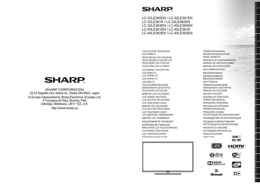 ENGLISH ITALIANO FRANÇAİS DEUTSCH ПОСІБНИК З КОРИСТУВАННЯ ІНСТРУКЦЫЯ ПА ЭКСПЛУАТАЦЫІ NAUDOTOJO VADOVAS LIETOŠANAS INSTRUKCIJA KASUTUSJUHEND מדריך הפעלה NORSK DANSK SUOMİ POLSKİ MAGYAR ČEŠTİNA ROMÂNĂ EΛΛΗVΙΚ NEDERLANDS HRVATSKİ SLOVENŠČİNA РУССКИЙ SRPSKİ SLOVENČİNA КОЛЬОРОВИЙ РК-ТЕЛЕВІЗОР КАЛЯРОВЫ ВК-ТЭЛЕВIЗАР SPALVOTAS LCD TELEVIZORIAUS LCD KRĀSU TELEVIZORS LCD VÄRVITELEVIISOR LCD טלוויזיה צבעונית עם מסך BRUKSANVISNING BRUKERHÅNDBOK BRUGSANVISNING KÄYTTÖOHJE GEBRUIKSAANWIJZING ΧΕΙΡΟΚΊΝΗΤΗ ΛΕΙΤΟΥΡΓΊΑ MANUAL DE UTILIZARE NÁVOD K POUŽİTÍ HASZNÁLATI ÚTMUTATÓ OPERATION MANUAL KORISNIČKI PRIRUČNIK NAVODILA ZA UPORABO OPERATION MANUAL PRIRUČNIK O RADU ИНСТРУКЦИЯ ПО ЭКСПЛУАТАЦИИ РЪКОВОДСТВО ЗА ЕКСПЛОАТАЦИЯ LİETUVİŲ БЕЛАРУСКАЯ УКРАЇНСЬКА БЪЛГАРСКИ LCD RENKLİ TELEVİZYON LCD FÄRG-TV LCD FARGE-TV LCD FARVE-TV LCDVÄRI-TV LCD KLEURENTELEVİSİE ΧΕΙΡΟΚΊΝΗΤΗ ΛΕΙΤΟΥΡΓΊΑ TELEVIZOR LCD COLOR BAREVNI LCD TELEVİZOR LCD SZÍNES TELEVÍZİÓ LCD COLOUR TELEVISION LCD TELEVIZOR U BOJI BARVNİ LCD TELEVİZOR LCD COLOUR TELEVISION LCD TELEVİZOR U BOJİ LCD ЦВЕТНЫЕ ТЕЛЕВИЗОРЫ ЦВЕТЕН LCD ТЕЛЕВИЗОР MANUALE DI FUNZIONAMENTO MANUAL DE INSTRUCCIONES MANUAL DE INSTRUÇÕES KULLANIM KILAVUZU LATVİEŠU TÉLÉVISEUR LCD COULEUR TELEVISIONE A COLORI LCD TELEVISOR LCD A COLOR TELEVISÃO LCD A CORES OPERATION MANUAL BEDIENUNGSANLEITUNG MODE D’EMPLOI EESTİ LCD COLOUR TELEVISION LCD-FARB-TV SVENSKA TÜRKÇE PORTUGUÊS ESPAÑOL LC-32LE360EN / LC-32LE361EN LC-32LE361K / LC-32LE362EN LC-32LE363EN / LC-40LE360EN LC-40LE361EN / LC-40LE361K LC-40LE362EN / LC-40LE363EN Spis treści TV - funkcje ............................................................ 2 Drogi kliencie firmy SHARP..................................... 3 Ważne informacje dotyczące bezpieczeństwa........ 3 Informacje ekologiczne ........................................... 6 Zawartość pakietu................................................... 7 Przycisk kontrolny TV i obsługa............................... 7 Podłączanie zasilania.............................................. 7 Podłączenie anteny/TV kablowej/anteny satelitarnej............................................................... 7 Instalowanie baterii w pilocie................................... 7 Kąt działania pilota.............................................. 7 Ostrzeżenia dotyczące pilota............................... 8 Włączanie/wyłączanie............................................. 8 Aby włączyć telewizor.......................................... 8 Aby przełączyć TV w stan oczekiwania............... 8 Aby wyłączyć telewizor........................................ 8 Przegląd funkcji pilota - TV...................................... 9 Korzystanie z modułu dostępu warunkowego........11 Informacje w trybie oczekiwania.............................11 Pierwsza instalacja................................................ 12 Instalacja anteny................................................ 12 Instalacja TV kablowej....................................... 12 Instalacja telewizji satelitarnej (w zależności od modelu).............................................................. 12 Odtwarzanie mediów poprzez wejście USB.......... 12 Menu przeglądarki mediów................................ 12 Zmiana rozmiaru obrazu: Formaty obrazu............ 13 Korzystanie z listy kanałów................................... 13 Szybkie menu........................................................ 13 CEC i CEC RC Passthrough................................. 13 Systemowa kontrola dźwięku............................ 13 FollowMe TV...................................................... 13 FollowMe TV do DMR........................................ 14 Opcje i funkcje menu............................................. 15 Zawartość menu obrazu.................................... 15 Ustawienia zaawansowane............................... 15 Opcje i funkcje menu............................................. 16 Zawartość menu dźwięku.................................. 16 Zawartość menu ustawień................................. 16 Inne Ustawienia: Wyświetla inne opcje ustawień telewizora.......................................................... 16 Opcje i funkcje menu............................................. 17 Zawartość menu instalacji i dostrajania............. 17 Elektroniczny przewodnik po programach (EPG).. 18 Opcje Programów.............................................. 18 Teletekst................................................................ 18 Teletekst cyfrowy ( tylko dla Wielkiej Brytanii)... 18 Nagrywanie programu........................................... 18 Nagrywanie z przesunięciem czasu ..................... 19 Natychmiastowe nagrywanie................................. 19 Oglądanie nagranych programów ........................ 19 Dostępne opcje odtwarzania............................. 19 Konfiguracja nagrywania....................................... 19 Funkcje podłączenia.............................................. 20 Podłączanie do sieci domowej.......................... 20 Konfigurowanie ustawień sieciowych................ 20 Podłączanie urządzenia przenośnego poprzez WiFi................................................................... 20 Używanie MIRACAST........................................ 21 Używanie usług sieci DLNA............................... 21 Portal internetowy.................................................. 21 Netflix.................................................................... 21 System HBBTV..................................................... 22 Rozwiązywanie problemów z połączeniem........... 23 Sieć bezp