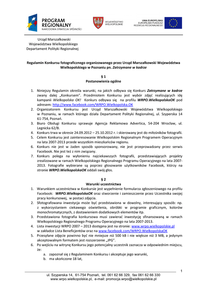 Urząd Marszałkowski Województwa Wielkopolskiego Departament Polityki Regionalnej Regulamin Konkursu fotograficznego organizowanego przez Urząd Marszałkowski Województwa Wielkopolskiego w Poznaniu pn. Zatrzymane w kadrze §1 Postanowienia ogólne 1. Niniejszy Regulamin określa warunki, na jakich odbywa się Konkurs Zatrzymane w kadrze zwany dalej „Konkursem”. Przedmiotem Konkursu jest wybór zdjęć realizujących idę kampanii Wielkopolska OK! Konkurs odbywa się na profilu WRPO.WielkopolskaOK pod adresem: http://www.facebook.com/WRPO.Wielkopolska.OK 2. Organizatorem Konkursu jest Urząd Marszałkowski Województwa Wielkopolskiego w Poznaniu, w ramach którego działa Departament Polityki Regionalnej, ul. Szyperska 14 61-754, Poznań. 3. Biuro Obsługi Konkursu sprawuje Agencja Reklamowa Advertica, 54-204 Wrocław, ul. Legnicka 62/B. 4. Konkurs trwa w okresie 24.09.2012 – 25.10.2012 r. i skierowany jest do miłośników fotografii. 5. Celem Konkursu jest zainteresowanie Wielkopolskim Regionalnym Programem Operacyjnym na lata 2007-2013 przede wszystkim mieszkańców regionu. 6. Konkurs nie jest w żaden sposób sponsorowany, nie jest przeprowadzany przez serwis Facebook. Nie jest też z nim związany. 7. Konkurs polega na wyłonieniu najciekawszych fotografii, przedstawiających projekty zrealizowane w ramach Wielkopolskiego Regionalnego Programu Operacyjnego na lata 20072013. Fotografie wybierane są poprzez głosowanie użytkowników Facebook, którzy na stronie WRPO.WielkopolskaOK oddali swój głos. 1. 2. 3. 4. 5. 6. §2 Warunki uczestnictwa Warunkiem uczestnictwa w Konkursie jest wypełnienie formularza zgłoszeniowego na profilu Facebook: WRPO.WielkopolskaOK oraz stworzenie i zamieszczenie przez Uczestnika swojej pracy konkursowej, w postaci zdjęcia. Sfotografowana inwestycja może być przedstawiona w dowolny, interesujący sposób: np. z wykorzystaniem ciekawego oświetlenia, obróbki w programie graficznym, kolorów monochromatycznych, z dostawieniem dodatkowych elementów itp. Przedstawiona fotografia konkursowa musi zawierać inwestycję sfinansowaną w ramach Wielkopolskiego Regionalnego Programu Operacyjnego na lata 2007-2013. Lista inwestycji WRPO 2007 – 2013 dostępna jest na stronie: www.wrpo.wielkopolskie.pl w zakładce Lista Beneficjentów oraz na www.facebook.com/WRPO.WielkopolskaOK Przesyłane zdjęcie powinno być nie mniejsze niż 500 kB i nie większe niż 3 MB, a jedynym akceptowalnym formatem jest rozszerzenie „JPG”. Po wejściu na witrynę Konkursu jego potencjalny uczestnik zaznacza w odpowiednim miejscu, że: a. zapoznał się z Regulaminem Konkursu i akceptuje jego warunki, b. ma ukończone 18 lat, 1 ul. Szyperska 14, 61-754 Poznań, tel. 061 62 66 329, fax 061 62 66 330 www.wrpo.wielkopolskie.pl, e-mail: [email protected] 7. 8. 9. 10. 11. 12. 13. 14. 15. 16. 17. 18. 19. 20. c. wyraża zgodę na przetwarzanie i udostępnianie swoich danych osobowych: imię, nazwisko, wiek, płeć, adres e-mail, w celu realizacji postanowień określonych Regulaminem Konkursu. Tylko w takim przypadku zostaje udostępniona cała funkcjonalność witryny konkursowej. Zapoznanie się z Regulaminem Konkursu oznacza akceptację jego warunków. Po wejściu na witrynę Konkursu jego potencjalny uczestnik wypełnia formularz z danymi osobowymi. Dane osobowe będą przetwarzane zgodnie z przepisami ustawy 29 sierpnia 1997 roku o ochronie danych osobowych (tekst jednolity Dz. U. z 2002 r. nr 101, poz. 926 ze zm.). Uczestnik Konkursu ma prawo do wglądu, zmiany lub usuwania swoich danych osobowych. Zabrania się użytkownikom publikowania treści, które naruszają prawa własności intelektualnej innych podmiotów i osób. Zdjęcia przesłane przez uczestnika Konkursu nie mogą naruszać prywatności osób trzecich. W szczególności nie wolno przesyłać zdjęć, na których widnieją osoby, które nie wyraziły na to zgody. Zdjęcia, na których widnieją osoby trzecie są dopuszczalne, pod warunkiem uzyskania zgody do publikacji osoby trzeciej widniejącej na zdjęciu. Uzyskanie zgody na publikację wizerunku osoby trzeciej leży po stronie autora zdjęcia. Zarówno Organizator, jak i Biuro Obsługi Konkursu nie zbiera i nie przechowuje oświadczeń w tej sprawie, natomiast taką zgodą każdorazowo powinien dysponować autor przesłanego zdjęcia, w zakresie w jakim regulują to zapisy prawa autorskiego w Polsce (m.in. forma pisemna, wskazanie celu wykorzystania zdjęcia oraz pól eksploatacji, w jakich zostanie ono wykorzystane, zgodnie z ustawą Prawo autorskie z 4 lutego 1994 r. i późniejszymi zmianami). Każda zainteresowana osoba lub podmiot prawny ma prawo zgłosić naruszenie prywatności bądź naruszenie własności intelektualnej. W tym celu należy zapoznać się z Załącznikiem nr 1 do Regulaminu „Polityka Prywatności”, gdzie znajduje się opis procedury reklamacyjnej i kontakt do pracownika Biura Obsługi Konkursu. Organizator i Biuro Obsługi Konkursu ma prawo do zablokowania wyświetlania treści naruszającej prywatny wizerunek i własność intelektualną podmiotów. W przypadku domniemanych roszczeń osób trzecich, w szczególności dotyczących zgłoszenia naruszenia prywatności lub własności intelektualnej, Organizator za pośrednictwem Biura Obsługi Konkursu niezwłocznie usuwa materiały rzekomo naruszające prawa autorskie bądź blokuje do nich dostęp. Istnieje możliwość odwołania się od decyzji usunięcia zdjęcia. W takim przypadku należy skorzystać z procedury opisanej w Załączniku nr 1 do Regulaminu „Polityka Prywatności”. Organizator zastrzega, że zostaną wyłączone z Konkursu (nieopublikowane) zdjęcia, które: a. zostały zapisane w innym formacie niż JPG, b. nie spełniają kryteriów wielkości pliku lub są słabej jakości c. nie spełniające kryteriów konkursowych opisanych w paragrafie 2 ust. 4, 5, 6, 7, 8. d. naruszają zapisy ust. 25 par. 2. Udział w Konkursie jest bezpłatny oraz dobrowolny