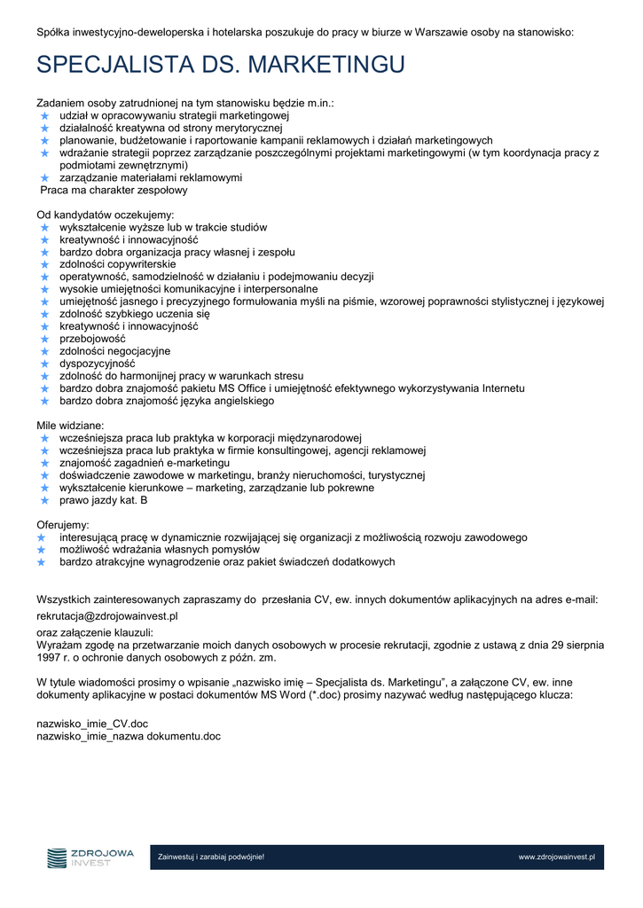 Spółka inwestycyjno-deweloperska i hotelarska poszukuje do pracy w biurze w Warszawie osoby na stanowisko: SPECJALISTA DS. MARKETINGU Zadaniem osoby zatrudnionej na tym stanowisku będzie m.in.: udział w opracowywaniu strategii marketingowej działalność kreatywna od strony merytorycznej planowanie, budżetowanie i raportowanie kampanii reklamowych i działań marketingowych wdrażanie strategii poprzez zarządzanie poszczególnymi projektami marketingowymi (w tym koordynacja pracy z podmiotami zewnętrznymi) zarządzanie materiałami reklamowymi Praca ma charakter zespołowy Od kandydatów oczekujemy: wykształcenie wyższe lub w trakcie studiów kreatywność i innowacyjność bardzo dobra organizacja pracy własnej i zespołu zdolności copywriterskie operatywność, samodzielność w działaniu i podejmowaniu decyzji wysokie umiejętności komunikacyjne i interpersonalne umiejętność jasnego i precyzyjnego formułowania myśli na piśmie, wzorowej poprawności stylistycznej i językowej zdolność szybkiego uczenia się kreatywność i innowacyjność przebojowość zdolności negocjacyjne dyspozycyjność zdolność do harmonijnej pracy w warunkach stresu bardzo dobra znajomość pakietu MS Office i umiejętność efektywnego wykorzystywania Internetu bardzo dobra znajomość języka angielskiego Mile widziane: wcześniejsza praca lub praktyka w korporacji międzynarodowej wcześniejsza praca lub praktyka w firmie konsultingowej, agencji reklamowej znajomość zagadnień e-marketingu doświadczenie zawodowe w marketingu, branży nieruchomości, turystycznej wykształcenie kierunkowe – marketing, zarządzanie lub pokrewne prawo jazdy kat. B Oferujemy: interesującą pracę w dynamicznie rozwijającej się organizacji z możliwością rozwoju zawodowego możliwość wdrażania własnych pomysłów bardzo atrakcyjne wynagrodzenie oraz pakiet świadczeń dodatkowych Wszystkich zainteresowanych zapraszamy do przesłania CV, ew. innych dokumentów aplikacyjnych na adres e-mail: [email protected] oraz załączenie klauzuli: Wyrażam zgodę na przetwarzanie moich danych osobowych w procesie rekrutacji, zgodnie z ustawą z dnia 29 sierpnia 1997 r. o ochronie danych osobowych z późn. zm. W tytule wiadomości prosimy o wpisanie „nazwisko imię – Specjalista ds. Marketingu”, a załączone CV, ew. inne dokumenty aplikacyjne w postaci dokumentów MS Word (*.doc) prosimy nazywać według następującego klucza: nazwisko_imie_CV.doc nazwisko_imie_nazwa dokumentu.doc Zainwestuj i zarabiaj podwójnie! www.zdrojowainvest.pl