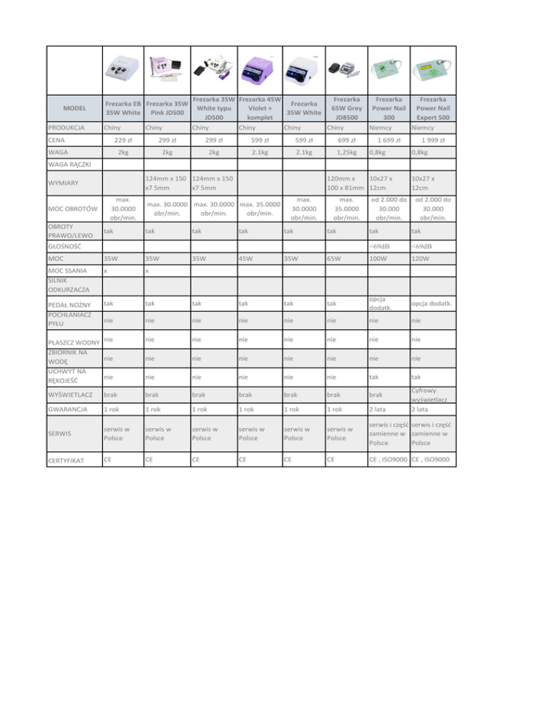 MODEL PRODUKCJA Frezarka EB Frezarka 35W 35W White Pink JD500 Frezarka 35W Frezarka 45W Frezarka White typu Violet + 35W White JD500 komplet Chiny Chiny Chiny Chiny Chiny Frezarka 65W Grey JD8500 Chiny CENA 229 zł 299 zł 299 zł 599 zł 599 zł 699 zł WAGA 2kg 2kg 2kg 2.1kg 2.1kg 1,25kg Frezarka Power Nail 300 Niemcy Frezarka Power Nail Expert 500 Niemcy 1 699 zł 0,8kg 1 999 zł 0,8kg WAGA RĄCZKI 124mm x 150 124mm x 150 x7 5mm x7 5mm WYMIARY max. 30.0000 obr/min. MOC OBROTÓW OBROTY PRAWO/LEWO tak 120mm x 10x27 x 100 x 81mm 12cm max. 30.0000 max. 30.0000 max. 35.0000 obr/min. obr/min. obr/min. tak tak tak max. 30.0000 obr/min. tak max. 35.0000 obr/min. tak GŁOŚNOŚĆ MOC 35W 35W MOC SSANIA SILNIK ODKURZACZA x x PEDAŁ NOŻNY POCHŁANIACZ PYŁU tak od 2.000 do 30.000 obr/min. 10x27 x 12cm od 2.000 do 30.000 obr/min. tak tak <69dB <69dB 35W 45W 35W 65W 100W 120W tak tak tak tak tak opcja dodatk. opcja dodatk. nie nie nie nie nie nie nie nie PŁASZCZ WODNY nie ZBIORNIK NA nie WODĘ UCHWYT NA nie RĘKOJEŚĆ nie nie nie nie nie nie nie nie nie nie nie nie nie nie nie nie nie nie nie tak tak WYŚWIETLACZ brak brak brak brak brak brak brak GWARANCJA 1 rok 1 rok 1 rok 1 rok 1 rok 1 rok 2 lata SERWIS serwis w Polsce serwis w Polsce serwis w Polsce serwis w Polsce serwis w Polsce serwis w Polsce serwis i część serwis i część zamienne w zamienne w Polsce Polsce CERTYFIKAT CE CE CE CE CE CE CE , ISO9000 CE , ISO9000 Cyfrowy wyświetlacz 2 lata
