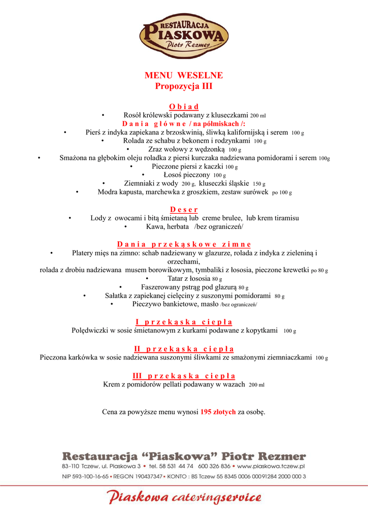 MENU WESELNE Propozycja III - Restauracja Piaskowa Tczew