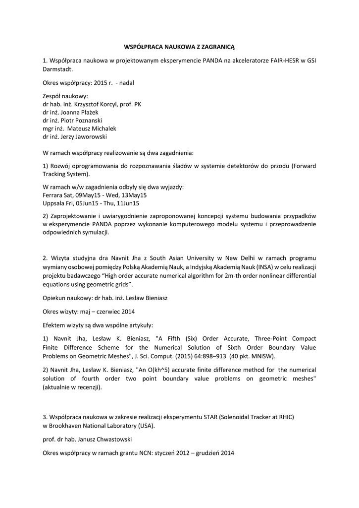 WSPÓŁPRACA NAUKOWA Z ZAGRANICĄ 1. Współpraca naukowa w projektowanym eksperymencie PANDA na akceleratorze FAIR-HESR w GSI Darmstadt. Okres współpracy: 2015 r. - nadal Zespół naukowy: dr hab. Inż. Krzysztof Korcyl, prof. PK dr inż. Joanna Płażek dr inż. Piotr Poznanski mgr inż. Mateusz Michalek dr inż. Jerzy Jaworowski W ramach współpracy realizowanie są dwa zagadnienia: 1) Rozwój oprogramowania do rozpoznawania śladów w systemie detektorów do przodu (Forward Tracking System). W ramach w/w zagadnienia odbyły się dwa wyjazdy: Ferrara Sat, 09May15 - Wed, 13May15 Uppsala Fri, 05Jun15 - Thu, 11Jun15 2) Zaprojektowanie i uwiarygodnienie zaproponowanej koncepcji systemu budowania przypadków w eksperymencie PANDA poprzez wykonanie komputerowego modelu systemu i przeprowadzenie odpowiednich symulacji. 2. Wizyta studyjna dra Navnit Jha z South Asian University w New Delhi w ramach programu wymiany osobowej pomiędzy Polską Akademią Nauk, a Indyjską Akademią Nauk (INSA) w celu realizacji projektu badawczego “High order accurate numerical algorithm for 2m-th order nonlinear differential equations using geometric grids”. Opiekun naukowy: dr hab. inż. Lesław Bieniasz Okres wizyty: maj – czerwiec 2014 Efektem wizyty są dwa wspólne artykuły: 1) Navnit Jha, Lesław K. Bieniasz, "A Fifth (Six) Order Accurate, Three-Point Compact Finite Difference Scheme for the Numerical Solution of Sixth Order Boundary Value Problems on Geometric Meshes", J. Sci. Comput. (2015) 64:898–913 (40 pkt. MNiSW). 2) Navnit Jha, Lesław K. Bieniasz, "An O(kh^5) accurate finite difference method for the numerical solution of fourth order two point boundary value problems on geometric meshes" (aktualnie w recenzji). 3. Współpraca naukowa w zakresie realizacji eksperymentu STAR (Solenoidal Tracker at RHIC) w Brookhaven National Laboratory (USA). prof. dr hab. Janusz Chwastowski Okres współpracy w ramach grantu NCN: styczeń 2012 – grudzień 2014