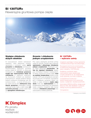 SI 130TUR+ Rewersyjna gruntowa pompa ciepła Wydajne chłodzenie dużych obiektów Grzanie i chłodzenie jednym urządzeniem SI 130TUR+ – wybrane zalety W nowoczesnych, dobrze izolowanych obiektach, obok efektywnej instalacji ogrzewania z pompami ciepła warto pomyśleć o chłodzeniu pomieszczeń. Wysokowydajna rewersyjna gruntowa pompa ciepła SI 130TUR+ to doskonałe rozwiązanie aby instalacja grzewcza mogła być wykorzystana także do chłodzenia w większych systemach, np. biurowcach, hotelach czy obiektach przemysłowych. Zasada działania takiego systemu grzewczo-chłodzącego jest stosunkowo prosta – w porze zimowej pompa ciepła pracuje jako efektywne urządzenie grzewcze pobierające energię z dolnego źródła ciepła, a latem dzięki odwróceniu procesu, pompa ciepła staje się agregatem chłodniczym. Przy użyciu rewersyjnej gruntowej pompy ciepła SI 130TUR+ Dimplex daje możliwość ogrzewania i aktywnego chłodzenia jednym urządzeniem. Rewersyjne pompy ciepła zapewniają niezawodne i łatwe do regulacji chłodzenie obiektu przy minimalnych kosztach inwestycyjnych. W obiegu chłodniczym pompy ciepła, można uzyskać temperaturę zasilania wody lodowej 7-20°C przy temperaturze zewnętrznej powyżej 15°C. SI 130TUR+ wyposażona jest w dodatkowy wymiennik ciepła i powstałe w trybie chłodzenia ciepło odpadowe może być wykorzystane np. do przygotowania ciepłej wody, czy ogrzewania wody w basenie. Urządzenie daje również możliwość chłodzenia pasywnego przy wykorzystaniu instalacji grzewczej. Urządzenie spełniające funkcję ogrzewania i chłodzenia (aktywnego oraz pasywnego). Rozwiązania techniczne zorientowane na efektywną eksploatację: elektroniczny zawór rozprężny i COP-Booster. Dodatkowy wymiennik ciepła – wykorzystanie ciepła odpadowego w trybie chłodzenia np. do podgrzewania wody użytkowej, czy wody w basenie. 2-sprężarkowa konstrukcja – lepsze dopasowanie mocy grzewczej, wyższa wydajność i dłuższa żywotność. Automatyka WPM Econ5Plus: dostęp przez Ethernet, KNX, EIB, MODBUS i możliwość obsługi za pomocą tabletu/smartfonu*. 5 lat gwarancji. * Niezbędny moduł NWPM Po prostu wyższa wydajność SG SI 130TUR+ – dane techniczne Made in Germany Simply More Quality EER 5,6 wydajność do* Model SI 130TUR+ Kolor obudowy biały Maksymalna temperatura zasilania 58°C Maksymalna temperatura zasilania przy chłodzeniu 20°C Dolna / górna granica zastosowania źródła ciepła (ogrzewanie) -5 / +25 °C Dolna / górna granica zastosowania źródła ciepła (chłodzenie) +10 / +30°C Moc grzewcza / COP (1 sprężarka) przy B0/W35* 57,6 kW / 4,59 Moc grzewcza / COP (2 sprężarki) przy B0/W35* 108,5 kW / 4,21 Moc chłodzenia / EER (2 sprężarki) przy B20/W9* 129,0 kW / 5,6 Moc chłodzenia / EER (1 sprężarka) przy B20/W18* 89,4 kW / 7,4 Moc chłodzenia / EER (2 sprężarki) przy B20/W18* 168,2 kW / 6,7 Znamionowy pobór mocy przy B0/W35* 25,83 kW Poziom mocy akustycznej urządzenia wg EN 12102 76 dB (A) Poziom ciśnienia akustycznego w odległości 1 m (wewnątrz) 60 dB (A) Oznaczenie / masa czynnika chłodniczego R410A / 16,9 kg Maksymalny przepływ nośnika ciepła źródła górnego / opory hydrauliczne 19 m³/h / 13000 Pa Minimalny przepływ nośnika ciepła źródła dolnego 19,0 m³/h Wymiary (szer. x wys. x gł.)** 1350 x 1890 x 775 mm Masa całkowita urządzenia 830 kg Napięcie zasilania 3/N/PE ~400 V, 50 Hz Prąd rozruchowy z układem łagodnego rozruchu 108 A Zabezpieczenie *** C 80 A Króćce przyłączeniowe górnego/dolnego źródła ciepła R 3" * EN 14511 ** Należy uwzględnić dodatkowe miejsce do przyłączenia rur, obsługi i konserwacji *** Wyłącznik zabezpieczający musi zapewnić wyłączenie wszystkich faz równocześnie Po prostu odwiedź naszą stronę internetową: www.dimplex.pl Glen Dimplex Polska Sp. z o.o. ul. Strzeszyńska 33, 60-479 Poznań · tel. 61 842 58 05 · fax: 61 842 58 06 [email protected] · www.dimplex.pl Projekt nr 047/01. Zastrzegamy sobie prawo do zmian i odstępstw w kolorach. SI 130TUR+