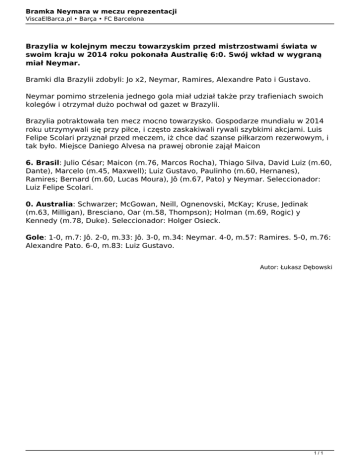 Bramka Neymara w meczu reprezentacji ViscaElBarca.pl • Barça • FC Barcelona Brazylia w kolejnym meczu towarzyskim przed mistrzostwami świata w swoim kraju w 2014 roku pokonała Australię 6:0. Swój wkład w wygraną miał Neymar. Bramki dla Brazylii zdobyli: Jo x2, Neymar, Ramires, Alexandre Pato i Gustavo. Neymar pomimo strzelenia jednego gola miał udział także przy trafieniach swoich kolegów i otrzymał dużo pochwał od gazet w Brazylii. Brazylia potraktowała ten mecz mocno towarzysko. Gospodarze mundialu w 2014 roku utrzymywali się przy piłce, i często zaskakiwali rywali szybkimi akcjami. Luis Felipe Scolari przyznał przed meczem, iż chce dać szanse piłkarzom rezerwowym, i tak było. Miejsce Daniego Alvesa na prawej obronie zajął Maicon 6. Brasil: Julio César; Maicon (m.76, Marcos Rocha), Thiago Silva, David Luiz (m.60, Dante), Marcelo (m.45, Maxwell); Luiz Gustavo, Paulinho (m.60, Hernanes), Ramires; Bernard (m.60, Lucas Moura), Jô (m.67, Pato) y Neymar. Seleccionador: Luiz Felipe Scolari. 0. Australia: Schwarzer; McGowan, Neill, Ognenovski, McKay; Kruse, Jedinak (m.63, Milligan), Bresciano, Oar (m.58, Thompson); Holman (m.69, Rogic) y Kennedy (m.78, Duke). Seleccionador: Holger Osieck. Gole: 1-0, m.7: Jô. 2-0, m.33: Jô. 3-0, m.34: Neymar. 4-0, m.57: Ramires. 5-0, m.76: Alexandre Pato. 6-0, m.83: Luiz Gustavo. Autor: Łukasz Dębowski 1/1 Powered by TCPDF (www.tcpdf.org)