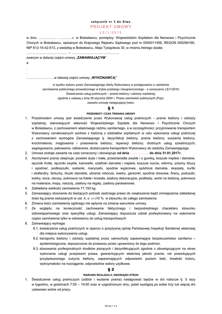 załącznik nr 3 do Siwz PROJEKT UMOWY LE/1/2015 w dniu …………….. ………….r. w Bolesławcu, pomiędzy: Wojewódzkim Szpitalem dla Nerwowo i Psychicznie Chorych w Bolesławcu, wpisanym do Krajowego Rejestru Sądowego pod nr 0000011456, REGON 000294190, NIP 612-15-42-513, z siedzibą w Bolesławcu, Aleja Tysiąclecia 30, w imieniu którego działa: ……………………………… – …………………………………… zwanym w dalszej części umowy „ZAMAWIAJĄCYM” a . . …………………….w dalszej części umowy „WYKONAWCĄ” * w wyniku wyboru przez Zamawiającego oferty Wykonawcy w postępowaniu o udzielenie zamówienia publicznego prowadzonego w trybie przetargu nieograniczonego - o oznaczeniu LE/1/2015: Świadczenie usług pralniczych – pranie bielizny i odzieży szpitalnej; zgodnie z ustawą z dnia 29 stycznia 2004 r. Prawo zamówień publicznych (Pzp), zawarto umowę następującej treści: §1 PRZEDMIOT I CZAS TRWANIA UMOWY 1. 2. 3. 4. 5. 6. 7. 8. Przedmiotem umowy jest świadczenie przez Wykonawcę usług pralniczych - pranie bielizny i odzieży szpitalnej, stanowiących własność Wojewódzkiego Szpitala dla Nerwowo i Psychicznie Chorych w Bolesławcu, z zachowaniem właściwego reżimu sanitarnego, a w szczególności: przyjmowanie transportem Wykonawcy oznakowanych worków z bielizną z oddziałów szpitalnych w celu wykonania usługi pralniczej z zachowaniem wymogów Zamawiającego tj. dezynfekcji bielizny; prania bielizny; suszenia bielizny; krochmalenia; maglowania i prasowania bielizny; reperacji bielizny; drobnych usług szwalniczych; segregowania, pakowania, odbierania, dostarczania transportem Wykonawcy do siedziby Zamawiającego. Umowa zostaje zawarta na czas oznaczony i obowiązuje od dnia …………….. do dnia 31.01.2017r. Asortyment prania obejmuje: powłoki duże i małe, prześcieradła zwykłe i z gumką, koszule męskie i damskie, ręczniki frotte, ręczniki zwykłe, kamizelki, szlafroki damskie i męskie, koszule nocne, reformy, piżamy /bluzy i spodnie/, podkoszulki, sukienki, marynarki, spodnie wyjściowe, spódnice damskie, skarpety, kurtki i skafandry, fartuchy, bluzki damskie, ubranie robocze, swetry, garsonki, spodnie dresowe, firany, poduszki, kołdry, koce, obrusy, pokrowce na fotele i krzesła, zasłony dekoracyjne, podkłady, worki na bieliznę, pokrowce na materace, mopy, narzuty, zasłony na regały, zasłony parawanowe. Zakładana wielkość zamówienia 77.150 kg. Zamawiający stosownie do bieżących potrzeb zastrzega prawo do zwiększenia bądź zmniejszenia zakładanej ilości kg prania wskazanych w ust. 4, o (+/-)10 % w stosunku do całego zamówienia. Zmiana ilości zamówienia ogólnego nie wpłynie na zmianę warunków umowy. Ze względu na konieczność zachowania faktycznego i bezpośredniego charakteru stosunku zobowiązaniowego oraz specyfikę usługi, Zamawiający dopuszcza udział podwykonawcy na wykonanie części zamówienia tylko w odniesieniu do usług transportowych. Zamawiający wymaga: 8.1. świadczenia usług pralniczych w oparciu o pozytywną opinię Państwowej Inspekcji Sanitarnej właściwej dla miejsca wykonywania usługi, 8.2. transportu bielizny i odzieży szpitalnej przez samochody zapewniające bezpieczeństwo sanitarno – epidemiologiczne, dopuszczone do przewozu przez uprawniony do tego podmiot, 8.3. stosowania profesjonalnych środków piorących i dezynfekujących zgodnie z obowiązującymi na okres wykonania usługi przepisami prawa, gwarantujących właściwą jakość prania, nie powodujących przyśpieszonego zużycia bielizny, zapewniających odpowiedni poziom bieli, trwałość koloru, wytrzymałości na rozciąganie, odpowiednie walory użytkowe. §2 WARUNKI REALIZACJI, OBOWIĄZKI STRON 1. Świadczenie usług pralniczych (odbiór i wydanie prania) następować będzie w dni robocze tj. 5 razy w tygodniu, w godzinach 7:00 – 10:00 oraz w uzgodnionym dniu, jeżeli wystąpią po sobie trzy lub więcej dni ustawowo wolne od pracy. Strona 1 z 4 2. 3. 4. 5. 6. 7. 8. 9. Wykonawca może być zobowiązany do dodatkowego odbioru i dostawy, w zależności od potrzeb Zamawiającego, z wyprzedzeniem wynoszącym 1 dzień. Wykonawca zobowiązany jest do wykonania usługi pralniczej i dostawy do magazynu bielizny czystej Zamawiającego, w terminie 24 godzin od odbioru od Zamawiającego bielizny brudnej. Wydawanie i przyjmowanie bielizny będzie ewidencjonowane. Bieliznę do transportu każdorazowo wydawać i przyjmować będzie upoważniony przez Zamawiającego pracownik. Wykonawca zapewni transport bielizny, odzieży we własnym zakresie i na własny koszt. Bielizna ogólno szpitalna przeznaczona do prania, odbierana przez Wykonawcę, będzie przez Zamawiającego znakowana, segregowana, pakowana w worki i przekazywana w pomieszczeniach na terenie Szpitala po zdaniu przez Wykonawcę wypranych asortymentów z poprzedniego zlecenia, usługi. Wykonawca zwróci wypraną bieliznę i ubrania szpitalne w odpowiednio oznakowanych pakietach, zgodnie z wymaganiami sanitarnymi i obowiązującymi u Wykonawcy normami. Bielizna czysta, zdawana do magazynu bielizny musi być pakowana w worki jednorazowe foliowe o małej pojemności, lub z tkaniny zgodnie z asortymentem Zamawiającego. Wykonawca zobowiązuje się wykonywać czynności będące przedmiotem umowy z należytą starannością, przestrzegając wymagań higieniczno-sanitarnych. 10. Wykonawca oświadcza, że dysponuje pralnią zapewniającą barierę higieniczną, spełniającą warunki sanitarne zgodne z obowiązującymi przepisami wymaganymi przy świadczeniu usług dla podmiotów wykonujących działalność leczniczą. 11. Wykonawca oświadcza, iż dysponuje oddzielnymi środkami transportu brudnej i czystej bielizny lub środkami transportu posiadającymi szczelną i podzieloną komorę załadunkową tak, aby bielizna czysta nie miała możliwości jakiegokolwiek kontaktu z bielizną brudną. 12. Środki piorące i dezynfekując