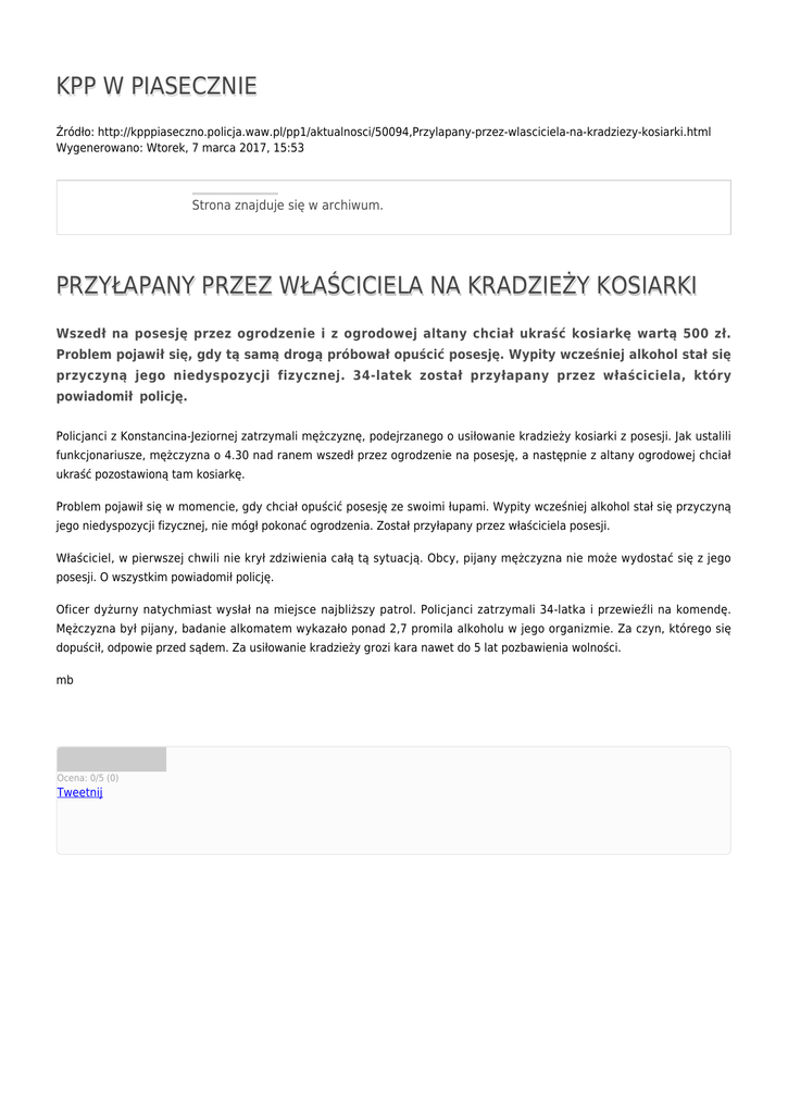 KPP W PIASECZNIE Źródło: http://kpppiaseczno.policja.waw.pl/pp1/aktualnosci/50094,Przylapany-przez-wlasciciela-na-kradziezy-kosiarki.html Wygenerowano: Wtorek, 7 marca 2017, 15:53 Strona znajduje się w archiwum. PRZYŁAPANY PRZEZ WŁAŚCICIELA NA KRADZIEŻY KOSIARKI Wszedł na posesję przez ogrodzenie i z ogrodowej altany chciał ukraść kosiarkę wartą 500 zł. Problem pojawił się, gdy tą samą drogą próbował opuścić posesję. Wypity wcześniej alkohol stał się przyczyną jego niedyspozycji fizycznej. 34-latek został przyłapany przez właściciela, który powiadomił policję. Policjanci z Konstancina-Jeziornej zatrzymali mężczyznę, podejrzanego o usiłowanie kradzieży kosiarki z posesji. Jak ustalili funkcjonariusze, mężczyzna o 4.30 nad ranem wszedł przez ogrodzenie na posesję, a następnie z altany ogrodowej chciał ukraść pozostawioną tam kosiarkę. Problem pojawił się w momencie, gdy chciał opuścić posesję ze swoimi łupami. Wypity wcześniej alkohol stał się przyczyną jego niedyspozycji fizycznej, nie mógł pokonać ogrodzenia. Został przyłapany przez właściciela posesji. Właściciel, w pierwszej chwili nie krył zdziwienia całą tą sytuacją. Obcy, pijany mężczyzna nie może wydostać się z jego posesji. O wszystkim powiadomił policję. Oficer dyżurny natychmiast wysłał na miejsce najbliższy patrol. Policjanci zatrzymali 34-latka i przewieźli na komendę. Mężczyzna był pijany, badanie alkomatem wykazało ponad 2,7 promila alkoholu w jego organizmie. Za czyn, którego się dopuścił, odpowie przed sądem. Za usiłowanie kradzieży grozi kara nawet do 5 lat pozbawienia wolności. mb Ocena: 0/5 (0) Tweetnij