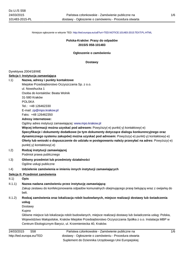 Dz.U./S S58 24/03/2015 101483-2015-PL Państwa członkowskie - Zamówienie publiczne na dostawy - Ogłoszenie o zamówieniu - Procedura otwarta 1/6 Niniejsze ogłoszenie w witrynie TED: http://ted.europa.eu/udl?uri=TED:NOTICE:101483-2015:TEXT:PL:HTML Polska-Kraków: Prasy do odpadów 2015/S 058-101483 Ogłoszenie o zamówieniu Dostawy Dyrektywa 2004/18/WE Sekcja I: Instytucja zamawiająca I.1) Nazwa, adresy i punkty kontaktowe Miejskie Przedsiębiorstwo Oczyszczania Sp. z o.o. ul. Nowohucka 1 Osoba do kontaktów: Beata Wolnik 31-580 Kraków POLSKA Tel.: +48 126462330 E-mail: [email protected] Faks: +48 126462350 Adresy internetowe: Ogólny adres instytucji zamawiającej: www.mpo.krakow.pl Więcej informacji można uzyskać pod adresem: Powyższy(-e) punkt(-y) kontaktowy(-e) Specyfikacje i dokumenty dodatkowe (w tym dokumenty dotyczące dialogu konkurencyjnego oraz dynamicznego systemu zakupów) można uzyskać pod adresem: Powyższy(-e) punkt(-y) kontaktowy(-e) Oferty lub wnioski o dopuszczenie do udziału w postępowaniu należy przesyłać na adres: Powyższy(-e) punkt(-y) kontaktowy(-e) I.2) Rodzaj instytucji zamawiającej Podmiot prawa publicznego I.3) Główny przedmiot lub przedmioty działalności Ogólne usługi publiczne I.4) Udzielenie zamówienia w imieniu innych instytucji zamawiających Sekcja II: Przedmiot zamówienia II.1) Opis II.1.1) Nazwa nadana zamówieniu przez instytucję zamawiającą: Zakup zestawu do konfekcjonowania odpadów komunalnych obejmującego prasę belującą wraz z owijarką do beli. II.1.2) Rodzaj zamówienia oraz lokalizacja robót budowlanych, miejsce realizacji dostawy lub świadczenia usług Dostawy Kupno Główne miejsce lub lokalizacja robót budowlanych, miejsce realizacji dostawy lub świadczenia usług: Polska, Województwo Małopolskie, Kraków Miejskie Przedsiębiorstwo Oczyszczania Spółka z o.o. Instalacja MBP w Centrum Ekologicznym Barycz, ul. Krzemieniecka 40, Kraków. 24/03/2015 S58 http://ted.europa.eu/TED Państwa członkowskie - Zamówienie publiczne na dostawy - Ogłoszenie o zamówieniu - Procedura otwarta Suplement do Dziennika Urzędowego Unii Europejskiej 1/6 Dz.U./S S58 24/03/2015 101483-2015-PL Państwa członkowskie - Zamówienie publiczne na dostawy - Ogłoszenie o zamówieniu - Procedura otwarta 2/6 Kod NUTS PL213 II.1.3) Informacje na temat zamówienia publicznego, umowy ramowej lub dynamicznego systemu zakupów (DSZ) Ogłoszenie dotyczy zamówienia publicznego II.1.4) Informacje na temat umowy ramowej II.1.5) Krótki opis zamówienia lub zakupu Przedmiotem zamówienia jest zakup zestawu do konfekcjonowania odpadów komunalnych obejmującego prasę belującą wraz z owijarką do beli. Szczegółowy opis przedmiotu zamówienia zawiera zał. nr 1 do SIWZ Wykonawca udzieli na przedmiot zamówienia gwarancji jakości na okres min. 24 miesięcy lub co najmniej 2 000 mth (licząc od daty protokołu zdawczo – odbiorczego). II.1.6) Wspólny Słownik Zamówień (CPV) 42996200, 42921300 II.1.7) Informacje na temat Porozumienia w sprawie zamówień rządowych (GPA) II.1.8) Części To zamówienie podzielone jest na części: nie II.1.9) Informacje o ofertach wariantowych Dopuszcza się składanie ofert wariantowych: nie II.2) Wielkość lub zakres zamówienia II.2.1) Całkowita wielkość lub zakres: Wartość szacunkowa zamówienia przekracza wyrażona w złotych równowartość kwoty 207 000 EUR i jest mniejsza od 10 000 000 EUR. II.2.2) Informacje o opcjach Opcje: nie II.2.3) Informacje o wznowieniach Jest to zamówienie podlegające wznowieniu: nie II.3) Czas trwania zamówienia lub termin realizacji Rozpoczęcie 11.5.2015. Zakończenie 15.6.2015 Sekcja III: Informacje o charakterze prawnym, ekonomicznym, finansowym i technicznym III.1) Warunki dotyczące zamówienia III.1.1) Wymagane wadia i gwarancje: Zamawiający żąda wniesienia wadium 1. Warunkiem uczestnictwa w postępowaniu jest wniesienie przez Wykonawcę wadium w wysokości 90 000 PLN (słownie złotych: dziewięćdziesiąt tysięcy złotych 00/100). 2. Wadium można wnieść w formie: a) pieniądzu, b) poręczeniach bankowych lub poręczeniach spółdzielczej kasy oszczędnościowo-kredytowej, z tym że poręczenie kasy jest zawsze poręczeniem pieniężnym, c) gwarancjach bankowych, d) gwarancjach ubezpieczeniowych, e) poręczeniach udzielanych przez podmioty, o których mowa w art. 6 b ust. 5 pkt. 2 ustawy z dnia 9 listopada 2000 r. o utworzeniu Polskiej Agencji Rozwoju Przedsiębiorczości (Dz. U. z 2007 r. nr 42 poz. 275 ze zm.). 3. Wadium w formie pieniężnej można wnieść na rachunek bankowy Zamawiającego: 24/03/2015 S58 http://ted.europa.eu/TED Państwa członkowskie - Zamówienie publiczne na dostawy - Ogłoszenie o zamówieniu - Procedura otwarta Suplement do Dziennika Urzędowego Unii Europejskiej 2/6 Dz.U./S S58 24/03/2015 101483-2015-PL Państwa członkowskie - Zamówienie publiczne na dostawy - Ogłoszenie o zamówieniu - Procedura otwarta 3/6 Bank Pekao SA 73 1240 4722 1111 0000 4851 5630 z adnotacją: „Wadium do przetargu nr TZ/EG/6/2015” Uwaga!!! - Zaleca się załączyć do oferty potwierdzenie złożenia wadium. - Wadium w innych formach niż pieniądz należy złożyć w formie kserokopii (potwierdzonej „za zgodność”) załączonej do oferty. W kopercie zawierającej ofertę należy dodatkowo załączyć oryginał ww. dokumentu, który zostanie zwrócony na zasadach określonych w ustawie Prawo zamówień publicznych. - Z treści gwarancji winno wynikać bezwarunkowe, na każde pisemne żądanie zgłoszone przez Zamawiającego w terminie związania ofertą, zobowiązanie gwaranta do wypłaty Zamawiającemu pełnej kwoty wadium w okolicznościach określonych w art. 46 ust. 5 Pzp. - Datą wniesienia wadium w formie przelewu jest data uznania rachunku bankowego Zamawiającego. - Oferta, która nie będzie zabezpieczona wadium, lub, gdy wadium zostanie wpłacone po upływie terminu wyznaczonego do składania ofert, zostanie odrzucona. - 