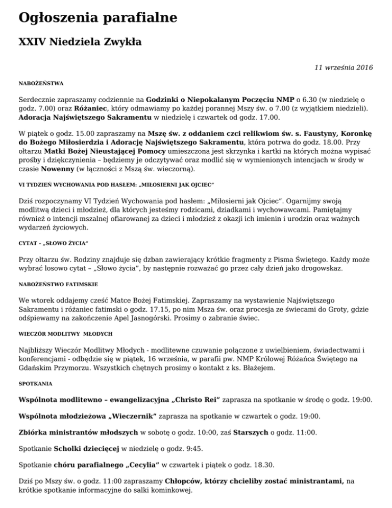 Ogłoszenia parafialne XXIV Niedziela Zwykła 11 września 2016 NABOŻEŃSTWA Serdecznie zapraszamy codziennie na Godzinki o Niepokalanym Poczęciu NMP o 6.30 (w niedzielę o godz. 7.00) oraz Różaniec, który odmawiamy po każdej porannej Mszy św. o 7.00 (z wyjątkiem niedzieli). Adoracja Najświętszego Sakramentu w niedzielę i czwartek od godz. 17.00. W piątek o godz. 15.00 zapraszamy na Mszę św. z oddaniem czci relikwiom św. s. Faustyny, Koronkę do Bożego Miłosierdzia i Adorację Najświętszego Sakramentu, która potrwa do godz. 18.00. Przy ołtarzu Matki Bożej Nieustającej Pomocy umieszczona jest skrzynka i kartki na których można wypisać prośby i dziękczynienia – będziemy je odczytywać oraz modlić się w wymienionych intencjach w środy w czasie Nowenny (w łączności z Mszą św. wieczorną). VI TYDZIEŃ WYCHOWANIA POD HASŁEM: „MIŁOSIERNI JAK OJCIEC” Dziś rozpoczynamy VI Tydzień Wychowania pod hasłem: „Miłosierni jak Ojciec”. Ogarnijmy swoją modlitwą dzieci i młodzież, dla których jesteśmy rodzicami, dziadkami i wychowawcami. Pamiętajmy również o intencji mszalnej ofiarowanej za dzieci i młodzież z okazji ich imienin i urodzin oraz ważnych wydarzeń życiowych. CYTAT – „SŁOWO ŻYCIA” Przy ołtarzu św. Rodziny znajduje się dzban zawierający krótkie fragmenty z Pisma Świętego. Każdy może wybrać losowo cytat – „Słowo życia”, by następnie rozważać go przez cały dzień jako drogowskaz. NABOŻEŃSTWO FATIMSKIE We wtorek oddajemy cześć Matce Bożej Fatimskiej. Zapraszamy na wystawienie Najświętszego Sakramentu i różaniec fatimski o godz. 17.15, po nim Msza św. oraz procesja ze świecami do Groty, gdzie odśpiewamy na zakończenie Apel Jasnogórski. Prosimy o zabranie świec. WIECZÓR MODLITWY MŁODYCH Najbliższy Wieczór Modlitwy Młodych - modlitewne czuwanie połączone z uwielbieniem, świadectwami i konferencjami - odbędzie się w piątek, 16 września, w parafii pw. NMP Królowej Różańca Świętego na Gdańskim Przymorzu. Wszystkich chętnych prosimy o kontakt z ks. Błażejem. SPOTKANIA Wspólnota modlitewno – ewangelizacyjna „Christo Rei” zaprasza na spotkanie w środę o godz. 19:00. Wspólnota młodzieżowa „Wieczernik” zaprasza na spotkanie w czwartek o godz. 19:00. Zbiórka ministrantów młodszych w sobotę o godz. 10:00, zaś Starszych o godz. 11:00. Spotkanie Scholki dziecięcej w niedzielę o godz. 9:45. Spotkanie chóru parafialnego „Cecylia” w czwartek i piątek o godz. 18.30. Dziś po Mszy św. o godz. 11:00 zapraszamy Chłopców, którzy chcieliby zostać ministrantami, na krótkie spotkanie informacyjne do salki kominkowej. W niedzielę, 18 września, po Mszy św. o godz. 11.00 odbędzie się spotkanie dla Rodziców dzieci klas III, które 20 maja 2017 roku przystąpią w naszej parafii do I Komunii św. (będą miały miejsce zapisy oraz ustalenie harmonogramu katechezy przyparafialnej). Kręgi Rodzin Domowego Kościoła zapraszamy w sobotę 17 września na Eucharystię o godz. 18:00, a po niej na wspólną agapę do salki. Zapraszamy Kandydatów do bierzmowania i ich Rodziców w przyszłą niedzielę, 18 września, na Mszę św. o godz. 18:00. Zachęcamy też wszystkich, którzy jeszcze nie rozpoczęli przygotowań do tego sakramentu, by przyjść i uczestniczyć w katechezie. Po Mszy świętej odbędzie się spotkanie, podczas którego zostanie przedstawiony plan pracy Kandydatów na ten semestr. Obecność młodzieży i rodziców obowiązkowa. PIERWSZA W TRÓJMIEŚCIE SZKOŁA BIBLIJNA W październiku rusza w Gdyni pierwsza w Trójmieście Szkoła Biblijna. Została ona stworzona specjalnie z myślą o dorosłych, którzy pragną pogłębić wiedzę na temat Pisma Świętego. Pełny kurs trwa dwa lata i obejmuje 180 godzin nauki. Zajęcia odbywają się od października do czerwca, raz w tygodniu, w każdy wtorek, w godzinach od 18:30 do 21:10. Szczegółowe informacje na stronie www.szkolabiblijna.gda.pl oraz na ulotkach wyłożonych na stoliku przy wyjściu z kościoła. PRASA KATOLICKA Zachęcamy do nabycia i czytania prasy katolickiej - w sposób szczególny nowego numeru „Gościa niedzielnego” oraz naszego parafialnego biuletynu. PODZIĘKOWANIA Serdecznie dziękujemy Wszystkim za wszelkie złożone ofiary, szczególnie za złożone dzisiaj na nasze potrzeby inwestycyjne i spłatę pozostałych zobowiązań oraz za darowizny przekazane na nasze konto parafialne w banku. W przyszłą niedzielę, 18 września, w Archidiecezji Gdańskiej zostanie przeprowadzona zbiórka do puszek na rzecz ofiar trzęsienia ziemi we Włoszech. Polecamy ją łaskawej ofiarności. ŻYCZENIA W bieżącym tygodniu przypadają następujące wspomnienia liturgiczne: w poniedziałek Najświętszego Imienia Maryi, we wtorek św. Jana Chryzostoma, w środę święto Podwyższenia Krzyża Świętego, w czwartek Najświętszej Maryi Panny Bolesnej, w piątek świętych męczenników Korneliusza i Cypriana, a w sobotę św. Roberta Bellarmina. Wszystkim naszym Parafianom, wszystkim Gościom oraz tym, którzy w najbliższym czasie będą obchodzili swoje Imieniny, Urodziny, Jubileusze składamy najserdeczniejsze życzenia i modlitwę przez wstawiennictwo Patronów. Zapraszamy również na naszą stronę internetową - www.chrystuskrol.diecezja.gda.pl. KRONIKA ŻAŁOBNA Naszym zwyczajem na zakończenie niedzielnej Eucharystii pomódlmy się zmarłych w minionym tygodniu: + Halina Frosina l.83. Polećmy zmarłych Duszpasterzy, Siostry zakonne, Wszystkich posługujących niegdyś w naszej Parafii, zmarłych Dobrodziejów [i polecanych w tej Mszy św. NN], a także zmarłych z naszych Rodzin. Wieczny odpoczynek... Dziękując za wspólną modlitwę życzymy wszystkim błogosławionej niedzieli i dobrego tygodnia. Przyjmijmy Boże błogosławieństwo.