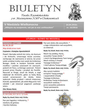 BIULETYN Parafia Rzymskokatolicka p.w. Macierzyństwa NMP w Dziekanowicach V Niedziela Wielkanocna „Miłujcie się wzajemnie, tak jak Ja was umiłowałem” 24.04.2016r. nr. 10/2016 LITURGIA I SŁOWO NA NIEDZIELĘ PIERWSZE CZYTANIE Bóg działa przez ludzi Pan jest dobry dla wszystkich, * a Jego miłosierdzie nad wszystkim, co stworzył. Czytanie z Dziejów Apostolskich Będę Cię sławił, Boże mój i Królu. Paweł i Barnaba wrócili do Listry, do Ikonium i do Antiochii, umacniając dusze uczniów, zachęcając do wytrwania w wierze, bo przez wiele ucisków trzeba nam wejść do królestwa Bożego. Kiedy w każdym Kościele wśród modlitw i postów ustanowili im starszych, polecili ich Panu, w którego uwierzyli. Potem przeszli przez Pizydię i przybyli do Pamfilii. Nauczali w Perge, zeszli do Attalii, a stąd odpłynęli do Antiochii, gdzie za łaską Bożą zostali przeznaczeni do dzieła, które wykonali. Kiedy przybyli i zebrali miejscowy Kościół, opowiedzieli, jak wiele Bóg przez nich zdziałał i jak otworzył poganom podwoje wiary. Niech Cię wielbią, Panie, wszystkie Twoje dzieła * i niech Cię błogosławią Twoi święci. Niech mówią o chwale Twojego królestwa * i niech głoszą Twoją potęgę. Dz 14, 21-27 Oto Słowo Boże. PSALM RESPONSORYJNY: Ps 145 (144), 8-9. 10-11. 12-1a3b Będę Cię sławił, Boże mój i Królu. Pan jest łagodny i miłosierny, * nieskory do gniewu i bardzo łaskawy. Będę Cię sławił, Boże mój i Królu. Aby synom ludzkim oznajmić Twoją potęgę * i wspaniałość chwały Twojego królestwa. Królestwo Twoje królestwem wszystkich wieków, * przez wszystkie pokolenia Twoje panowanie. Będę Cię sławił, Boże mój i Królu. DRUGIE CZYTANIE Ap 21, 1-5a Bóg otrze wszelką łzę Czytanie z Księgi Apokalipsy świętego Jana Apostoła Ja, Jan, ujrzałem niebo nowe i ziemię nową, bo pierwsze niebo i pierwsza ziemia przeminęły i morza już nie ma. I Miasto Święte – Jeruzalem Nowe ujrzałem zstępujące z nieba od Boga, przystrojone jak oblubienica zdobna w klejnoty dla swojego męża. I usłyszałem donośny głos mówiący od tronu: «Oto przybytek Boga z ludźmi: i zamieszka wraz z nimi, i będą oni Jego ludem, a On będzie „Bogiem z nimi”. I otrze z ich oczu wszelką łzę, a śmierci już odtąd nie będzie. Ani żałoby, ni krzyku, ni trudu już odtąd nie będzie, bo pierwsze rzeczy przeminęły». I rzekł Siedzący na tronie: «Oto czynię wszystko nowe». Oto Słowo Boże. ŚPIEW PRZED EWANGELIĄ: J 13, 34 Alleluja, Alleluja, Alleluja Daję wam przykazanie nowe, abyście się wzajemnie miłowali, jak Ja was umiłowałem. Alleluja, Alleluja, Alleluja EWANGELIA J 13, 31-33a. 34-35 Przykazanie nowe Słowa Ewangelii według świętego Jana Po wyjściu Judasza z wieczernika Jezus powiedział: «Syn Człowieczy został teraz uwielbiony, a w Nim został Bóg uwielbiony. Jeżeli Bóg został w Nim uwielbiony, to Bóg uwielbi Go także w sobie samym, i zaraz Go uwielbi. Dzieci, jeszcze krótko jestem z wami. Będziecie Mnie szukać, ale jak to Żydom powiedziałem, tak i teraz wam mówię, dokąd Ja idę, wy pójść nie możecie. Daję wam przykazanie nowe, abyście się wzajemnie miłowali tak, jak Ja was umiłowałem; żebyście i wy tak się miłowali wzajemnie. Po tym wszyscy poznają, żeście uczniami moimi, jeśli będziecie się wzajemnie miłowali». Oto słowo Pańskie. KOMENTARZ: Świętowanie Wielkanocy jest nie tylko celebracją zmartwychwstania Chrystusa, ale także zapowiedzią i obietnicą ostatecznego triumfu królestwa Bożego na końcu czasów. Jest to jednocześnie obietnica spełnienia naszych najgłębszych tęsknot za miłością i trwałym szczęściem. Jesteśmy zaproszeni do tego, by już tu, na ziemi, zacząć wchodzić w tę rzeczywistość. Jednak „przez wiele ucisków trzeba nam wejść do Królestwa Niebieskiego”. To przekonanie wyraził św. Paweł w Ikonium, gdzie został ukamienowany i wywleczony za miasto. Gdy znaleźli go jego uczniowie, odzyskał siły i już następnego dnia, jakby nic się nie stało, głosił Ewangelię, przestrzegając słuchaczy przed zwątpieniem. Może odczuwasz dziś jakieś zmęczenie obowiązkami, życiem, rozczarowaniami, słabym wsparciem ze strony wspólnoty, niezrozumieniem... Pomyśl o Pawle, któremu do tego wszystkiego dołączono ciężkie cierpienie fizyczne. Omal go nie zabito. On podniósł się z tego wszystkiego natychmiast. Podniósł się, bo był ściśle zjednoczony z Jezusem, o którym mówił: "wszystko mogę w tym, który mnie umacnia" (Flp 4, 13). Jeżeli przeżywasz jakieś rozterki, może chodzi właśnie o to, aby zbliżyć się do Jego ramion i odebrać wsparcie, które On dla ciebie ma. Bądź realistą. Droga do Królestwa Niebieskiego prowadzi przez wiele wyzwań, ale Pan nigdy nas nie opuszcza. Możesz o sobie powiedzieć, że kroczysz tą drogą? OGŁOSZENIA PARAFIALNE 1. Kalendarz liturgiczny: poniedziałek- Święto Świętego Marka, Ewangelisty. piątek – Święto Św. Katarzyny ze Sieny, dziewicy i doktora Kościoła, patronki Europy. W najbliższą sobotę rozpoczniemy nabożeństwa majowe uroczystą procesją wokół naszej świątyni. Na nabożeństwa majowe zapraszamy codziennie na godz. 18.00 oraz w niedziele na godz. 15.30. Nie zapomnijmy o przystrojeniu naszych przydrożnych kapliczek. Pamiętajmy, aby w tym szczególnym miesiącu gromadzić się przy nich odprawiając nabożeństwa majowe. 2. Bóg zapłać za ofiary złożone w zeszłą niedzielę na rzecz hospicjum w Wiśniowej w wysokości 5209,5 zł. Dziś po Mszach św. kolekta, ogłoszona 3. 4. 5. 6. przez papieża Franciszka na pomoc humanitarną dla Ukrainy. W zeszłym tygodniu dzięki Waszej ofiarności wymieniliśmy silnik i prowadnice mechanizmu zasłaniania i odsłaniania obrazu Matki Bożej Dziekanowskiej. Bóg zapłać. Rocznica Komunii Św. dla dzieci z kl. IV będzie w Uroczystość Królowej Polski 3 maja. Spowiedź dla dzieci będzie w najbl