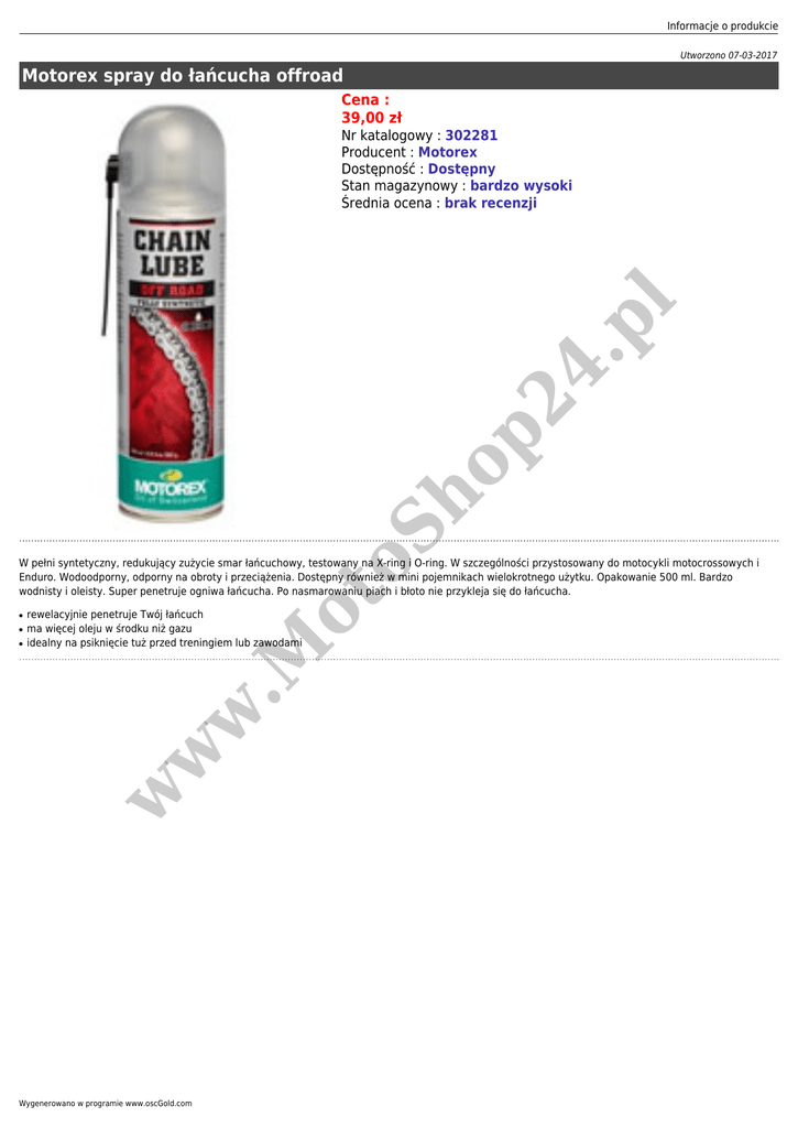 Informacje o produkcie Utworzono 07-03-2017 Motorex spray do łańcucha offroad Cena : 39,00 zł ot oS ho p2 4. p l Nr katalogowy : 302281 Producent : Motorex Dostępność : Dostępny Stan magazynowy : bardzo wysoki Średnia ocena : brak recenzji W pełni syntetyczny, redukujący zużycie smar łańcuchowy, testowany na X-ring i O-ring. W szczególności przystosowany do motocykli motocrossowych i Enduro. Wodoodporny, odporny na obroty i przeciążenia. Dostępny również w mini pojemnikach wielokrotnego użytku. Opakowanie 500 ml. Bardzo wodnisty i oleisty. Super penetruje ogniwa łańcucha. Po nasmarowaniu piach i błoto nie przykleja się do łańcucha. ● w w w ● rewelacyjnie penetruje Twój łańcuch ma więcej oleju w środku niż gazu idealny na psiknięcie tuż przed treningiem lub zawodami .M ● Wygenerowano w programie www.oscGold.com