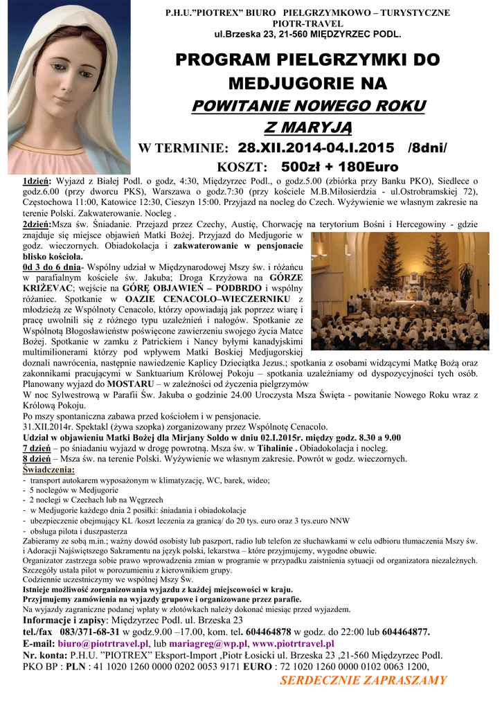 P.H.U.”PIOTREX” BIURO PIELGRZYMKOWO – TURYSTYCZNE PIOTR-TRAVEL ul.Brzeska 23, 21-560 MIĘDZYRZEC PODL. PROGRAM PIELGRZYMKI DO MEDJUGORIE NA POWITANIE NOWEGO ROKU Z MARYJĄ W TERMINIE: 28.XII.2014-04.I.2015 /8dni/ KOSZT: 500zł + 180Euro 1dzień: Wyjazd z Białej Podl. o godz, 4:30, Międzyrzec Podl., o godz.5.00 (zbiórka przy Banku PKO), Siedlece o godz.6.00 (przy dworcu PKS), Warszawa o godz.7:30 (przy kościele M.B.Miłosierdzia - ul.Ostrobramskiej 72), Częstochowa 11:00, Katowice 12:30, Cieszyn 15:00. Przyjazd na nocleg do Czech. Wyżywienie we własnym zakresie na terenie Polski. Zakwaterowanie. Nocleg . 2dzień:Msza św. Śniadanie. Przejazd przez Czechy, Austię, Chorwację na terytorium Bośni i Hercegowiny - gdzie znajduje się miejsce objawień Matki Bożej. Przyjazd do Medjugorie w godz. wieczornych. Obiadokolacja i zakwaterowanie w pensjonacie blisko kościoła. 0d 3 do 6 dnia- Wspólny udział w Międzynarodowej Mszy św. i różańcu w parafialnym kościele św. Jakuba; Droga Krzyżowa na GÓRZE KRIŻEVAC; wejście na GÓRĘ OBJAWIEŃ – PODBRDO i wspólny różaniec. Spotkanie w OAZIE CENACOLO–WIECZERNIKU z młodzieżą ze Wspólnoty Cenacolo, którzy opowiadają jak poprzez wiarę i pracę uwolnili się z różnego typu uzależnień i nałogów. Spotkanie ze Wspólnotą Błogosławieństw poświęcone zawierzeniu swojego życia Matce Bożej. Spotkanie w zamku z Patrickiem i Nancy byłymi kanadyjskimi multimilionerami którzy pod wpływem Matki Boskiej Medjugorskiej doznali nawrócenia, następnie nawiedzenie Kaplicy Dzieciątka Jezus.; spotkania z osobami widzącymi Matkę Bożą oraz zakonnikami pracującymi w Sanktuarium Królowej Pokoju – spotkania uzależniamy od dyspozycyjności tych osób. Planowany wyjazd do MOSTARU – w zależności od życzenia pielgrzymów W noc Sylwestrową w Parafii Św. Jakuba o godzinie 24.00 Uroczysta Msza Święta - powitanie Nowego Roku wraz z Królową Pokoju. Po mszy spontaniczna zabawa przed kościołem i w pensjonacie. 31.XII.2014r. Spektakl (żywa szopka) zorganizowany przez Wspólnotę Cenacolo. Udział w objawieniu Matki Bożej dla Mirjany Soldo w dniu 02.I.2015r. między godz. 8.30 a 9.00 7 dzień – po śniadaniu wyjazd w drogę powrotną. Msza św. w Tihalinie . Obiadokolacja i nocleg. 8 dzień – Msza św. na terenie Polski. Wyżywienie we własnym zakresie. Powrót w godz. wieczornych. Świadczenia: - transport autokarem wyposażonym w klimatyzację, WC, barek, wideo; - 5 noclegów w Medjugorie - 2 noclegi w Czechach lub na Węgrzech - w Medjugorie każdego dnia 2 posiłki: śniadania i obiadokolacje - ubezpieczenie obejmujący KL /koszt leczenia za granicą/ do 20 tys. euro oraz 3 tys.euro NNW - obsługa pilota i duszpasterza Zabieramy ze sobą m.in.; ważny dowód osobisty lub paszport, radio lub telefon ze słuchawkami w celu odbioru tłumaczenia Mszy św. i Adoracji Najświętszego Sakramentu na język polski, lekarstwa – które przyjmujemy, wygodne obuwie. Organizator zastrzega sobie prawo wprowadzenia zmian w programie w przypadku zaistnienia sytuacji od organizatora niezależnych. Szczegóły ustala pilot w porozumieniu z kierownikiem grupy. Codziennie uczestniczymy we wspólnej Mszy Św. Istnieje możliwość zorganizowania wyjazdu z każdej miejscowości w kraju. Przyjmujemy zamówienia na wyjazdy grupowe i organizowane przez parafie. Na wyjazdy zagraniczne podanej wpłaty w złotówkach należy dokonać miesiąc przed wyjazdem. Informacje i zapisy: Międzyrzec Podl. ul. Brzeska 23 tel./fax 083/371-68-31 w godz.9.00 –17.00, kom. tel. 604464878 w godz. do 22:00 lub 604464877. E-mail: [email protected], lub [email protected], www.piotrtravel.pl Nr. konta: P.H.U. ”PIOTREX” Eksport-Import ,Piotr Łosicki ul. Brzeska 23 ,21-560 Międzyrzec Podl. PKO BP : PLN : 41 1020 1260 0000 0202 0053 9171 EURO : 72 1020 1260 0000 0102 0063 1200, SERDECZNIE ZAPRASZAMY