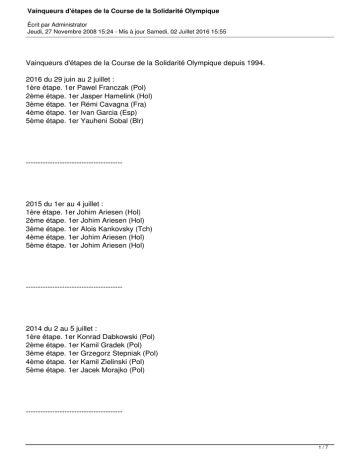 Vainqueurs d'étapes de la Course de la Solidarité Olympique Écrit par Administrator Jeudi, 27 Novembre 2008 15:24 - Mis à jour Samedi, 02 Juillet 2016 15:55 Vainqueurs d'étapes de la Course de la Solidarité Olympique depuis 1994. 2016 du 29 juin au 2 juillet : 1ère étape. 1er Pawel Franczak (Pol) 2ème étape. 1er Jasper Hamelink (Hol) 3ème étape. 1er Rémi Cavagna (Fra) 4ème étape. 1er Ivan Garcia (Esp) 5ème étape. 1er Yauheni Sobal (Blr) ---------------------------------------- 2015 du 1er au 4 juillet : 1ère étape. 1er Johim Ariesen (Hol) 2ème étape. 1er Johim Ariesen (Hol) 3ème étape. 1er Alois Kankovsky (Tch) 4ème étape. 1er Johim Ariesen (Hol) 5ème étape. 1er Johim Ariesen (Hol) ---------------------------------------- 2014 du 2 au 5 juillet : 1ère étape. 1er Konrad Dabkowski (Pol) 2ème étape. 1er Kamil Gradek (Pol) 3ème étape. 1er Grzegorz Stepniak (Pol) 4ème étape. 1er Kamil Zielinski (Pol) 5ème étape. 1er Jacek Morajko (Pol) ---------------------------------------- 1/7 Vainqueurs d'étapes de la Course de la Solidarité Olympique Écrit par Administrator Jeudi, 27 Novembre 2008 15:24 - Mis à jour Samedi, 02 Juillet 2016 15:55 2013 du 26 au 29 juin : 1ère étape. 1er Vitaliy Popkov (Ukr) 2ème étape. 1er Michael Schweizer (All) 3ème étape. 1er Konrad Dabkowski (Pol) 4ème étape. 1er Sebastian Forke (All) ---------------------------------------- 2012 du 4 au 8 juillet : 1ère étape. 1er Jeff Vermeulen (Hol) 2ème étape. 1er André Schulze (All) 3ème étape. 1er André Schulze (All) 4ème étape. 1er Adrian Honkisz (Pol) 5ème étape. 1er Bartosz Huzarski (Pol) 6ème étape. 1er Vitaliy Popkov (Ukr) ---------------------------------------2011 du 29 juin au 2 juillet : 1ère étape. 1er Tomas Buchacek (Tch) 2ème étape. 1er André Schulze (All) 3ème étape. 1er Marcin Sapa (Pol) 4ème étape. 1er Steffen Radochla (All) ---------------------------------------2010 du 30 juin au 4 juillet : 1ère étape. 1er Adam Wadecki (Pol) 2ème étape. 1er André Schulze (All) 3ème étape. 1er André Schulze (All) 4ème étape. 1er Jacek Morajko (Pol) 2/7 Vainqueurs d'étapes de la Course de la Solidarité Olympique Écrit par Administrator Jeudi, 27 Novembre 2008 15:24 - Mis à jour Samedi, 02 Juillet 2016 15:55 5ème étape. 1er Jacek Morajko (Pol) 6ème étape. 1er André Schulze (All) ---------------------------------------2009 du 1er au 5 juillet : 1ère étape. 1er Matthias Friedemann (All) 2ème étape. 1er Roger Kluge (All) 3ème étape. 1er Artur Krol (Pol) 4ème étape. 1er Roger Kluge (All) 5ème étape. 1er Danilo Hondo (All) 6ème étape. 1er Bartlomiej Matysiak (Pol) ---------------------------------------2008 du 2 au 6 juillet : 1ère étape. 1er André Schulze (All) 2ème étape. 1er Piotr Zaradny (Pol) 3ème étape. 1er Marek Wesoly (Pol) 4ème étape. 1er Lukasz Bodnar (Pol) C.M.Individuel 5ème étape. 1er Marek Wesoly (Pol) 6ème étape. 1er André Schulze (All) 7ème étape. 1er Mateusz Mroz (Pol) ---------------------------------------2007 : 1ère étape. 1er Piotr Zaradny (Pol) 2ème étape. 1er Matija Kvasina (Cro) 3ème étape. 1er Piotr Zaradny (Pol) 4ème étape. 1er Lukasz Bodnar (Pol) C.M.Individuel 5ème étape. 1er Tilo Schüler (All) 6ème étape. 1er Piotr Zaradny (Pol) ---------------------------------------- 3/7 Vainqueurs d'étapes de la Course de la Solidarité Olympique Écrit par Administrator Jeudi, 27 Novembre 2008 15:24 - Mis à jour Samedi, 02 Juillet 2016 15:55 2006 : 1ère étape. 1er Robert Radosz (Pol) 2ème étape. 1er Laurens Ten Dam (Hol) C.M.Individuel 3ème étape. 1er Mark Cavendish (Gbr) 4ème étape. 1er Aldo-Ino Ilesic (Slo) 5ème étape. 1er Tomasz Kiendys (Pol) 6ème étape. 1er Vasil Kiryienka (Blr) ---------------------------------------2005 : 1ère étape. 1er Adam Wadecki (Pol) 2ème étape. 1er Piotr Wadecki (Pol) 3ème étape. 1er Adam Wadecki (Pol) 4ème étape. 1er Adam Wadecki (Pol) 5ème étape. 1er Maurizio Varini (Ita) C.M.Individuel 6ème étape. 1er Marcin Gebka (Pol) 7ème étape. 1er Dariusz Skoczyslas (Pol) ---------------------------------------2004 : 1ère étape. 1er Dariusz Rudnicki (Pol) 2ème étape. 1er Robert Radosz (Pol) 3ème étape. 1er Bogdan Bondariew (Ukr) C.M.Individuel 4ème étape. 1er Krzysztof Jerowski (Pol) 5ème étape. 1er Jonas Holmqvist (Suè) 6ème étape. 1er Marcin Gebka (Pol) ---------------------------------------2003 : 1ère étape. 1er Mauro Zinetti (Ita) 2ème étape. 1er Eric Baumann (All) 3ème étape. 1er Tomasz Brozyna (Pol) 4ème étape. 1er Michel Vanhaecke (Bel) 5ème étape. 1er Bert Roesems (Bel) C.M.Individuel 4/7 Vainqueurs d'étapes de la Course de la Solidarité Olympique Écrit par Administrator Jeudi, 27 Novembre 2008 15:24 - Mis à jour Samedi, 02 Juillet 2016 15:55 6ème étape. 1er Marek Wesoly (Pol) 7ème étape. 1er Roberto Lochowski (All) ---------------------------------------2002 : 1ère étape. 1er Andrus Aug (Est) 2ème étape. 1er Jacek Mickiewicz (Pol) 3ème étape. 1er Björn Leukemans (Bel) 4ème étape. 1er Jacek Mickiewicz (Pol) 5ème étape. 1er Ondrej Sosenka (Tch) C.M.Individuel 6ème étape. 1er Marcin Gebka (Pol) ---------------------------------------2001 : 1ère étape. 1er Andrus Aug (Est) 2ème étape. 1er Sefan Van Dijk (Hol) 3ème étape. 1er Rudi Kemna (Hol) 4ème étape(a). 1er Stefan Van Dijk (Hol) 4ème étape(b). 1er Ondrej Sosenka (Tch) C.M.Individuel 5ème étape. 1er Andrus Aug (Est) ---------------------------------------2000 : 1ère étape. 1er Artur Krzeszowiec (Pol) 2ème étape(a). 1er Arkadiusz Wojtas (Pol) 2ème étape(b). 1er Piotr Chmielewski (Pol) C.M.Individuel 3ème étape. 1er Remigius Lupeikis (Lit) 4ème étape. 1er Bogdan Bondariew (Ukr) 5ème étape. 1er Dimitri Sedun (Rus) 6ème étape. 1er Artur Krzeszowiec (Pol) ---------------------------------------- 5/7 Vainqueurs d'étapes de la Course de la Solidarité Olympique Écrit par Administrator Jeudi, 27 Novembre 2008 15:24 - Mis 
